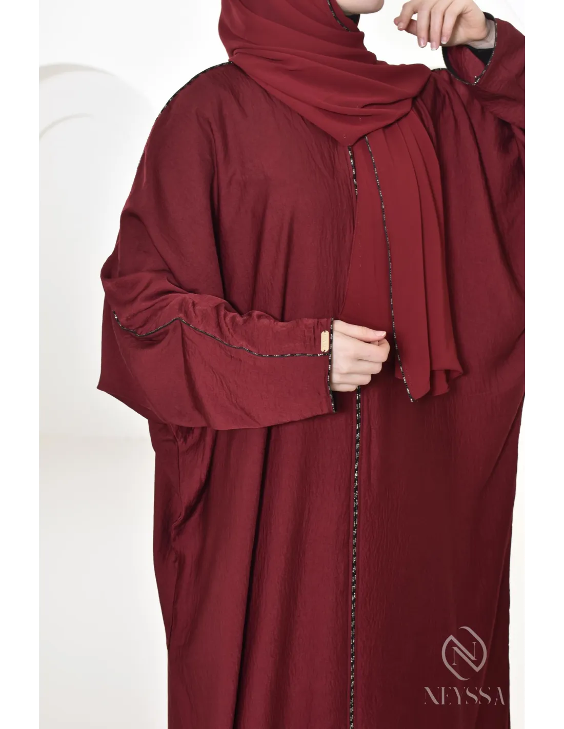 - Perfect personalized finishes: A silver Neyssa plaque is hand-sewn onto the sleeve of the abaya.