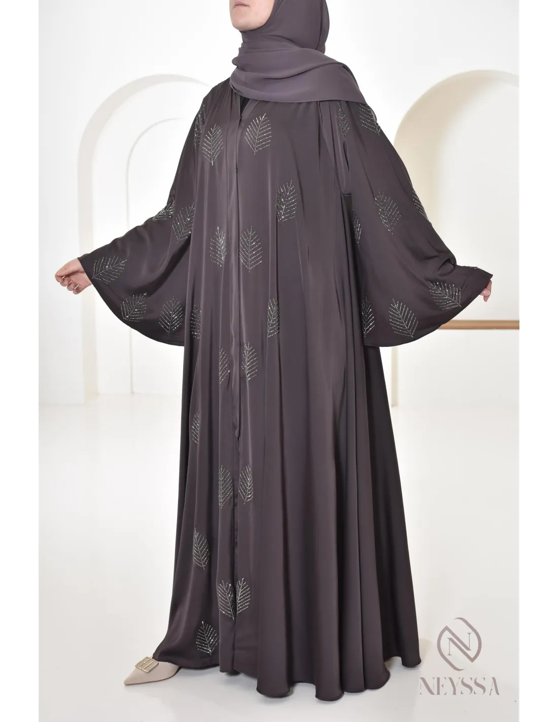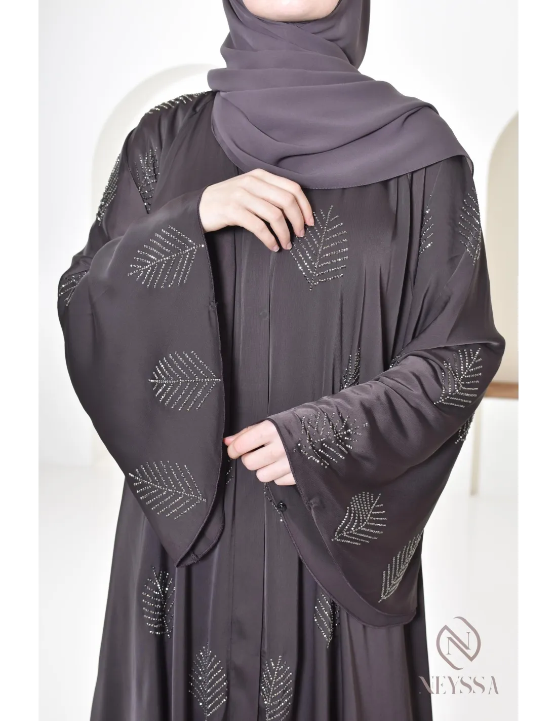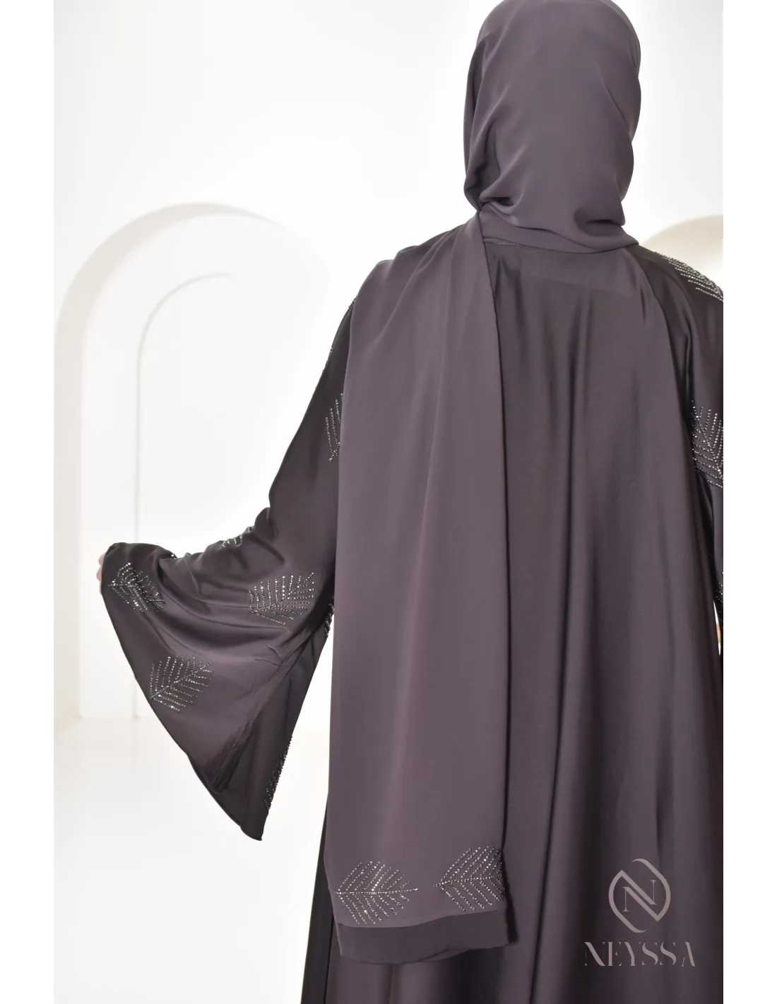 - Perfect personalized finishes: A silver Neyssa plaque is sewn onto the sleeve of the abaya.
