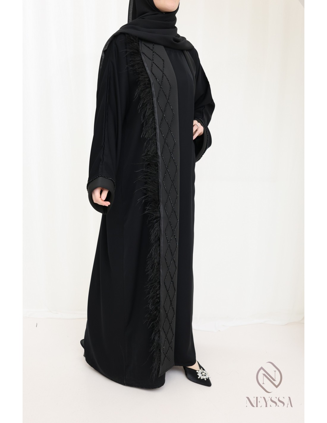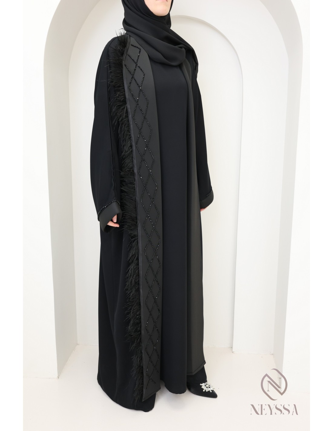 You'll fall for the modern woman's beaded black Abaya Dubaï kimono with feathers :