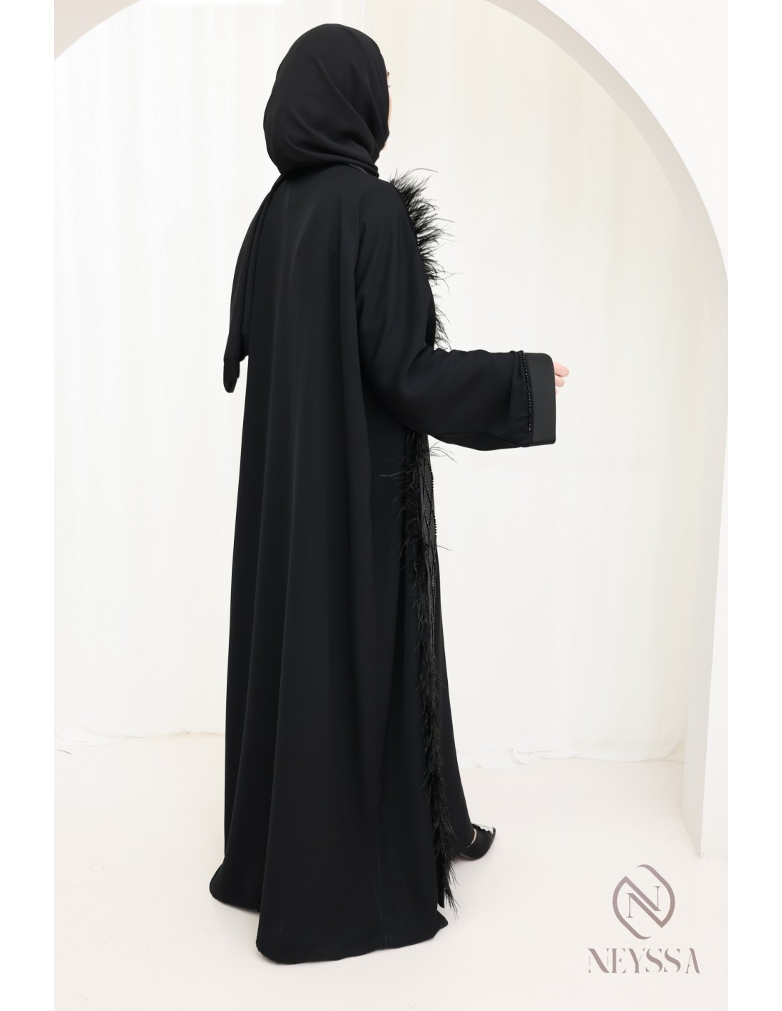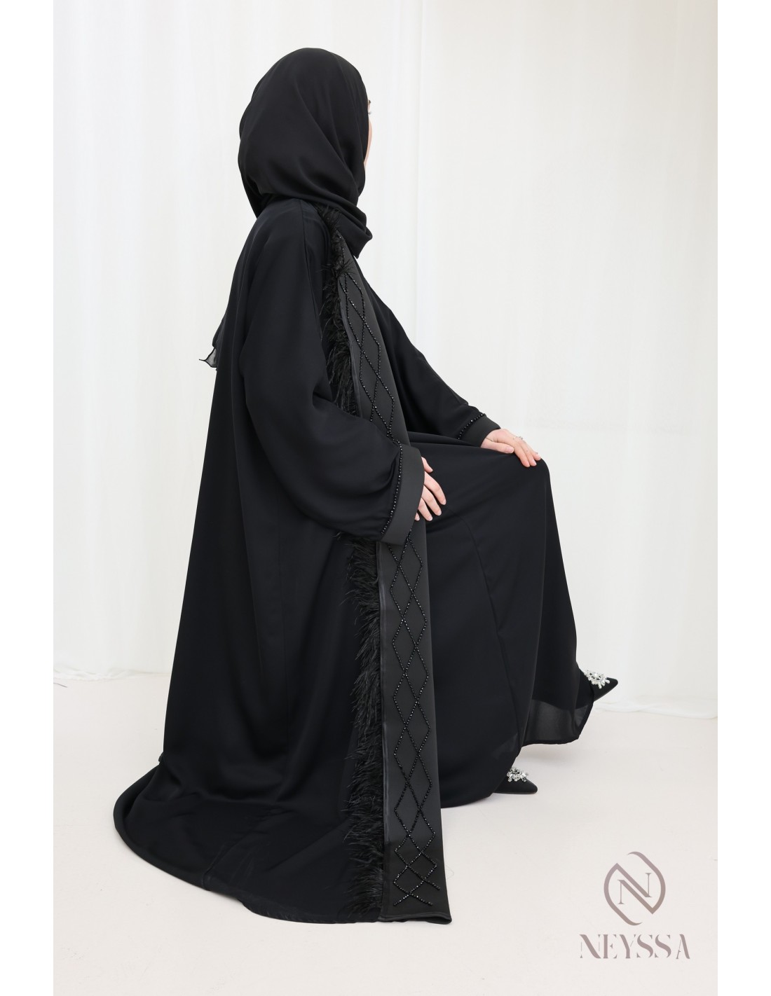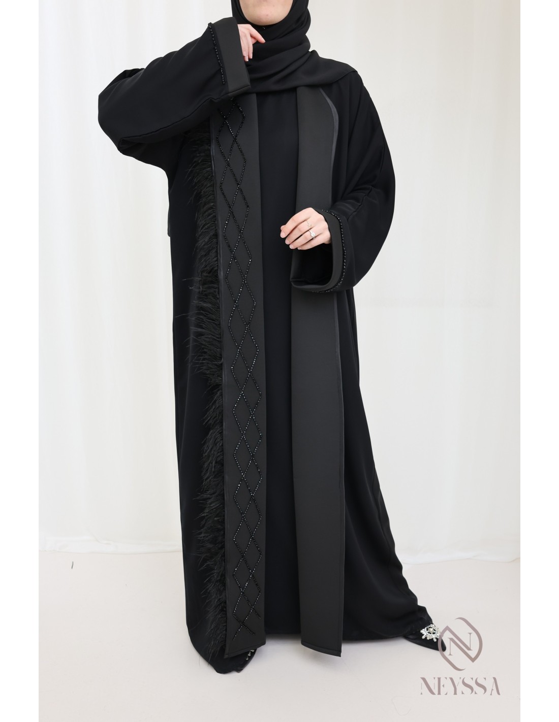 Black Abaya Dubaï kimono with pearls and feathers, chic outfit for Eid