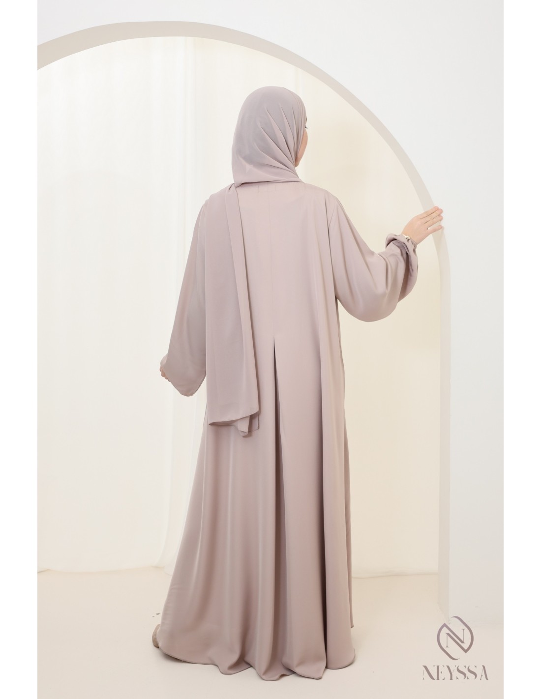 • Perfect personalized finishes: A golden Neyssa plaque is hand-sewn onto the sleeve of the abaya.