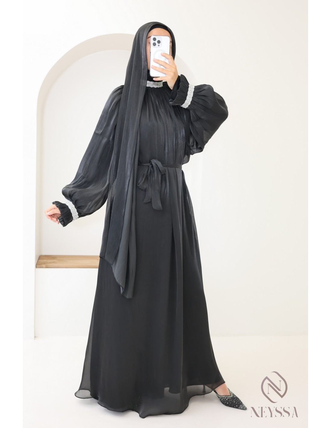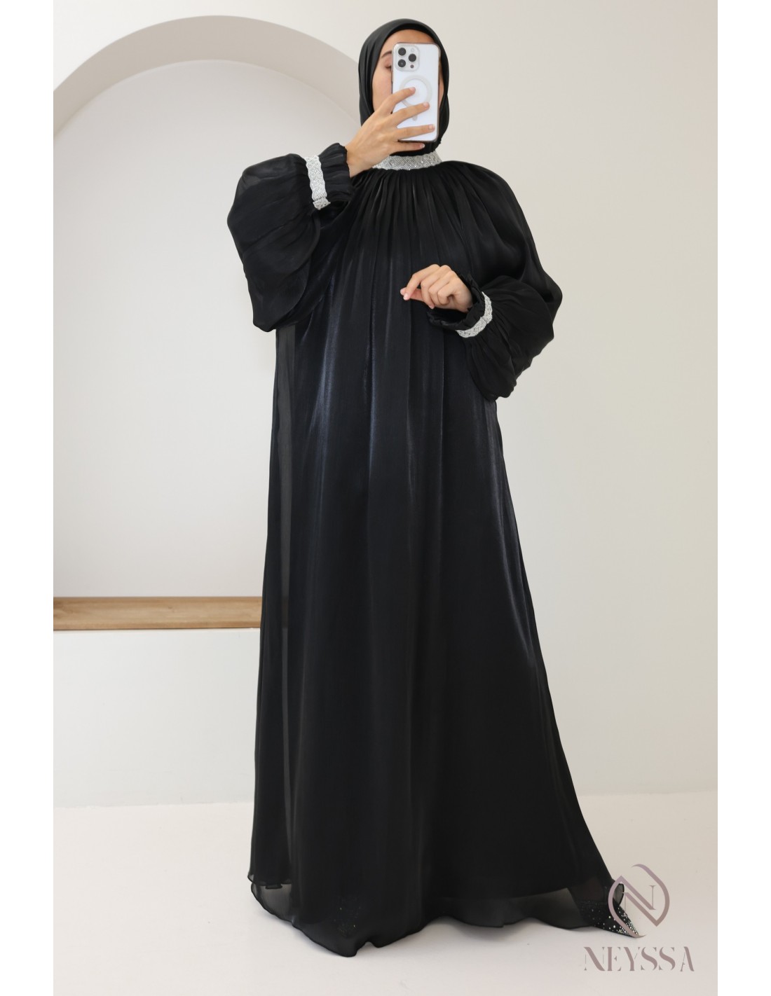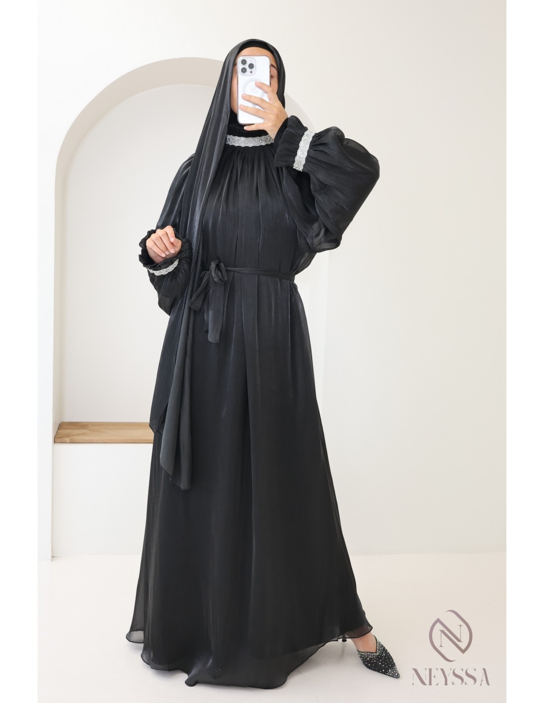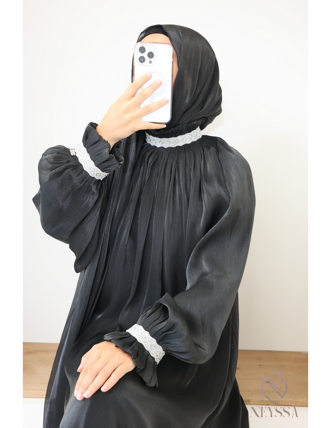 - Perfect personalized finishes: A silver Neyssa plaque is hand-sewn onto the sleeve of the abaya.