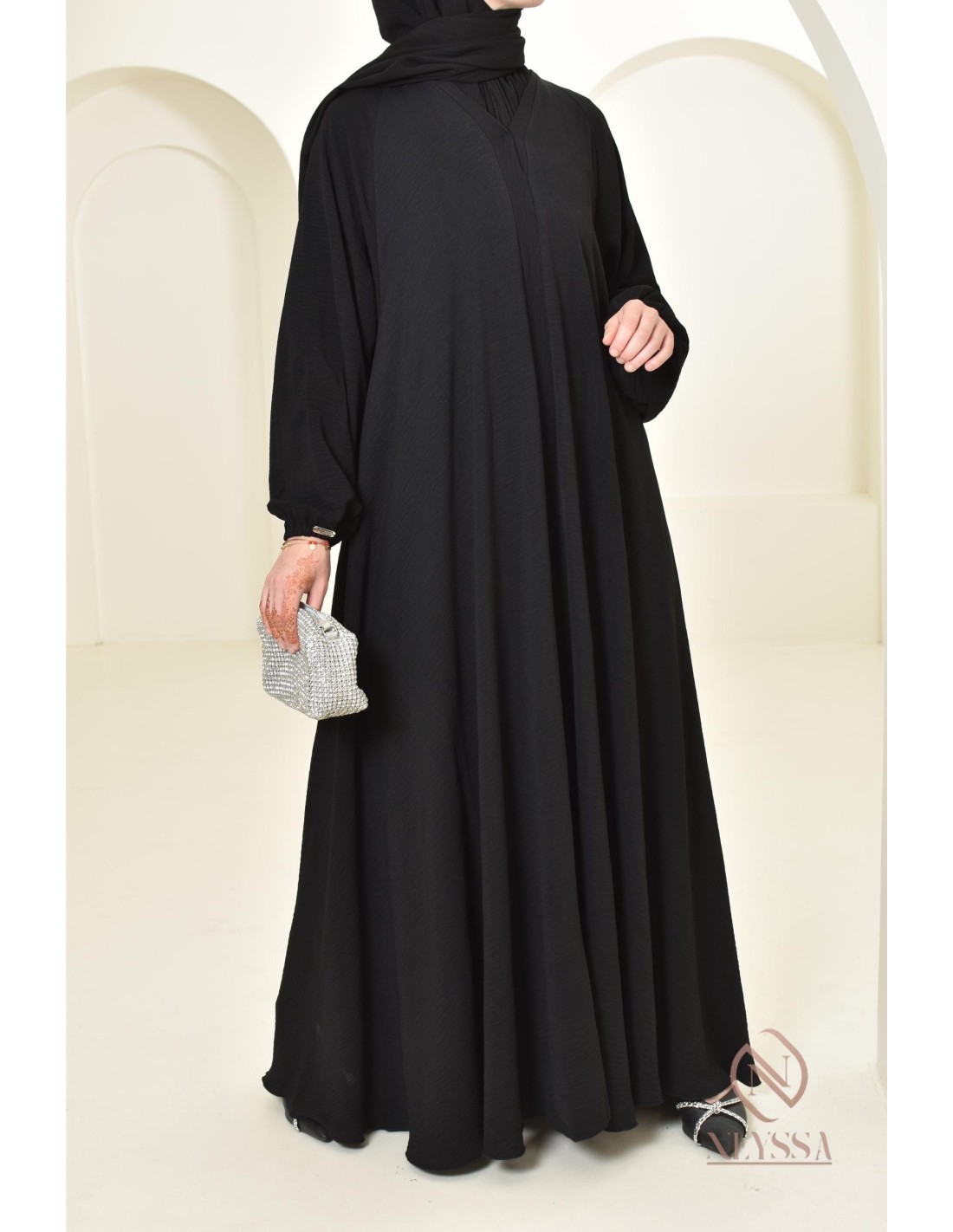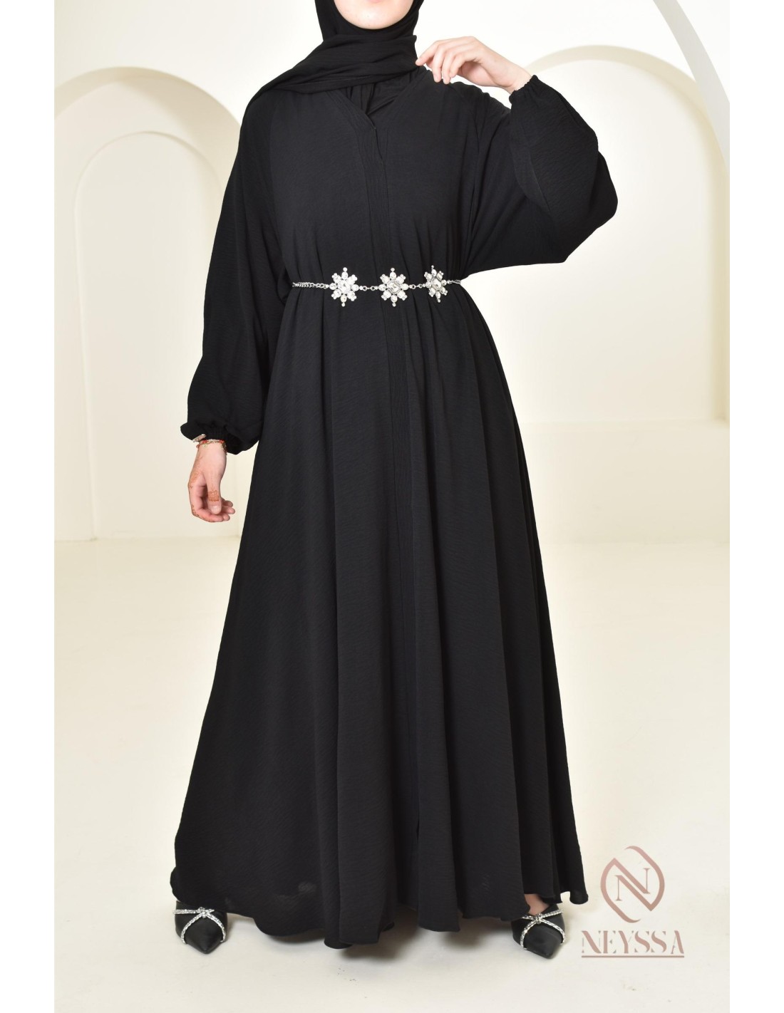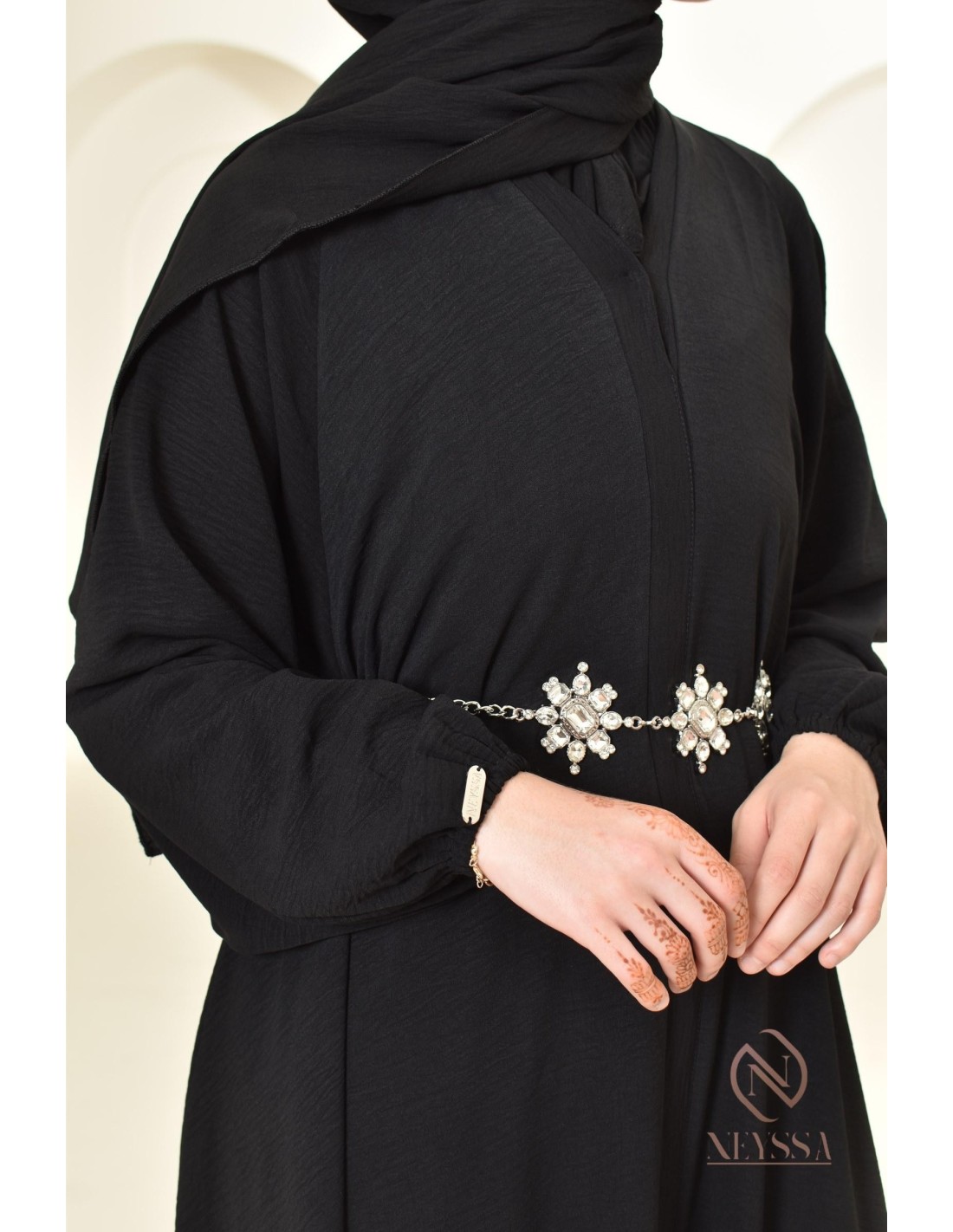 - Perfect custom finishes: A silver Neyssa plaque is hand-sewn onto the sleeve of the abaya.