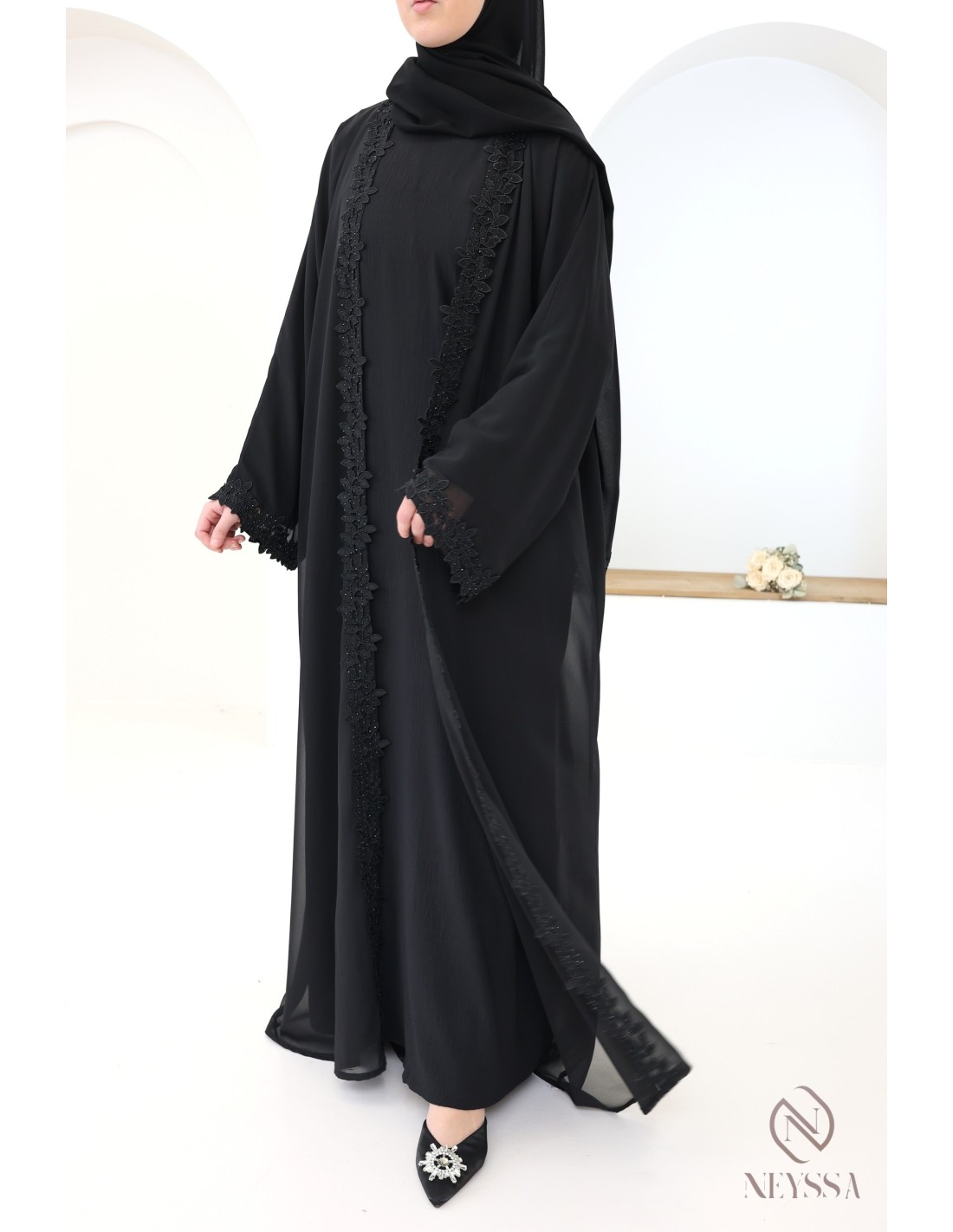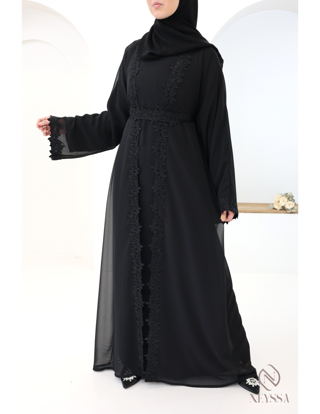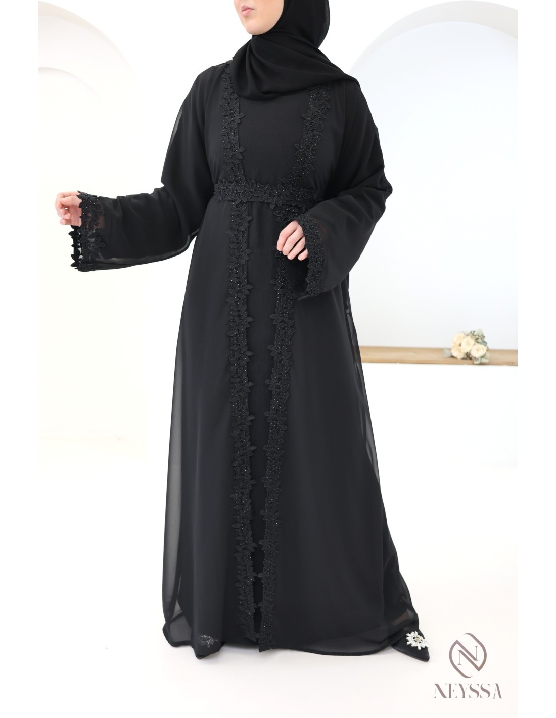 With this magnificent abaya outfit, you're sure to shine on the big day! Confection Neyssa represents a perfect marriage of elegance and sophistication. Carefully crafted in our workshops in Dubai, this exceptional quality abaya exudes incomparable charm.