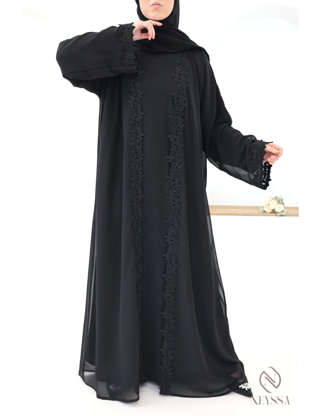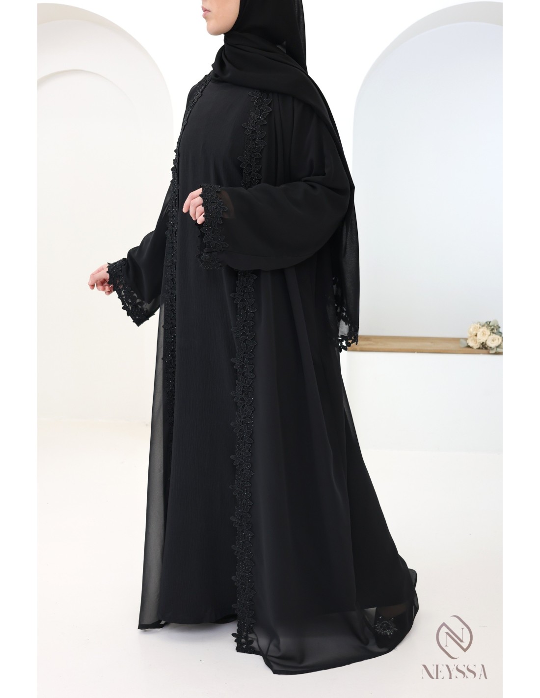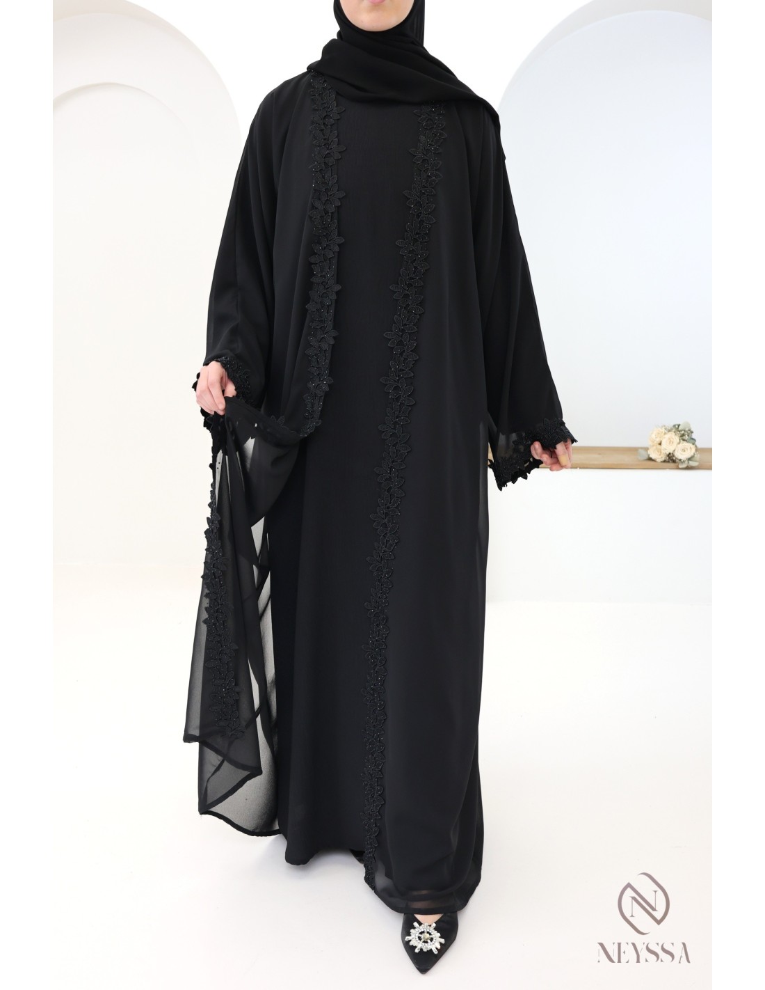 With this magnificent abaya outfit, you're sure to shine on the big day! Confection Neyssa represents a perfect marriage of elegance and sophistication. Carefully crafted in our workshops in Dubai, this exceptional quality abaya exudes incomparable charm.
