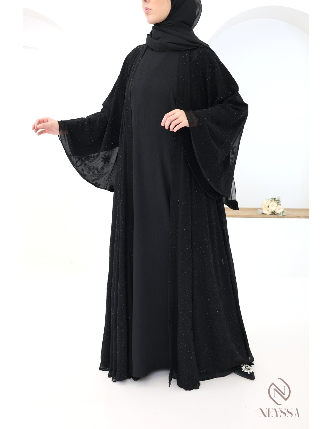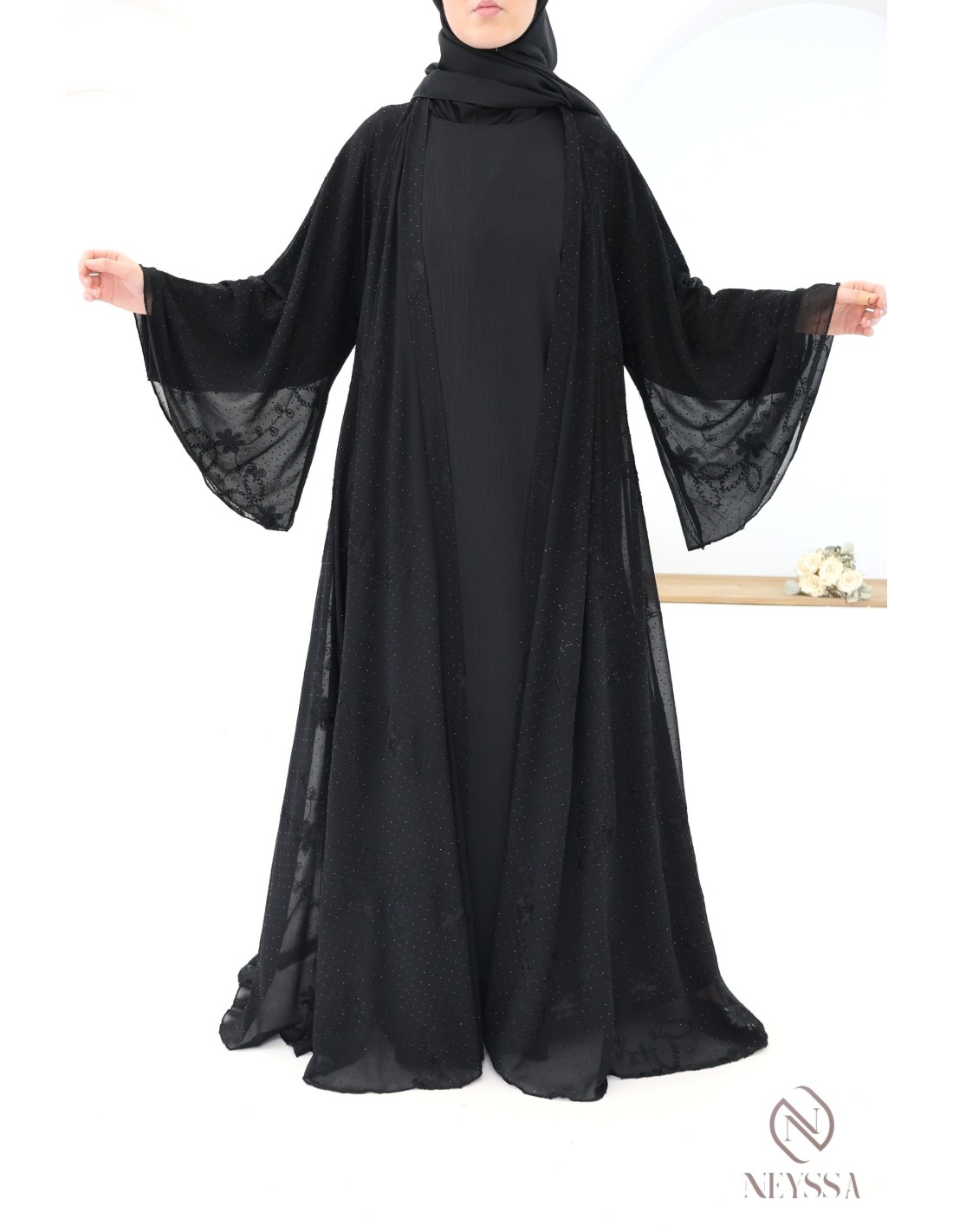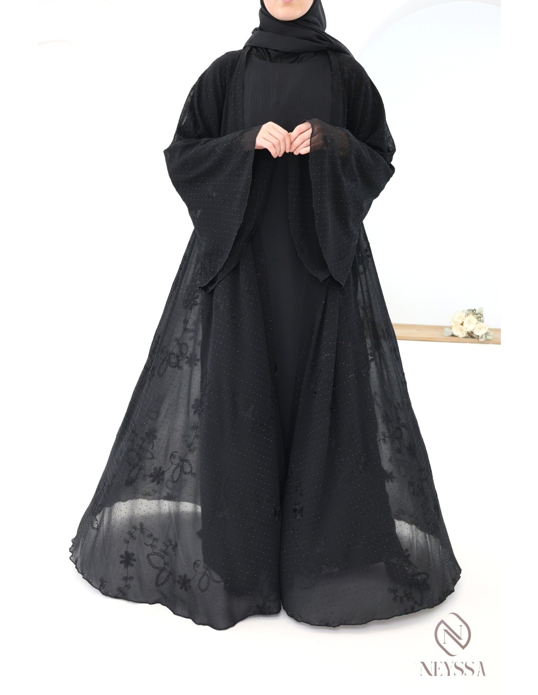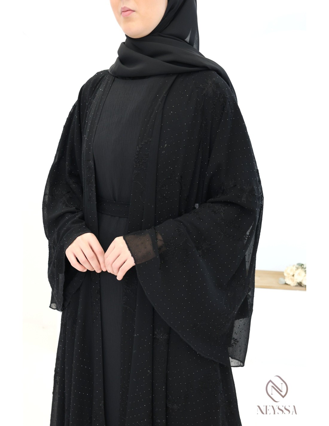 You'll fall in love with this black chiffon kimono abaya with rhinestones and a flared cut: