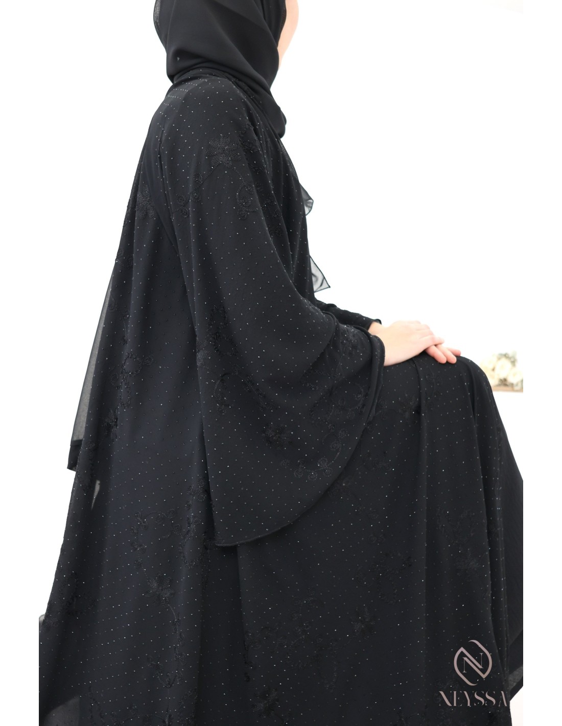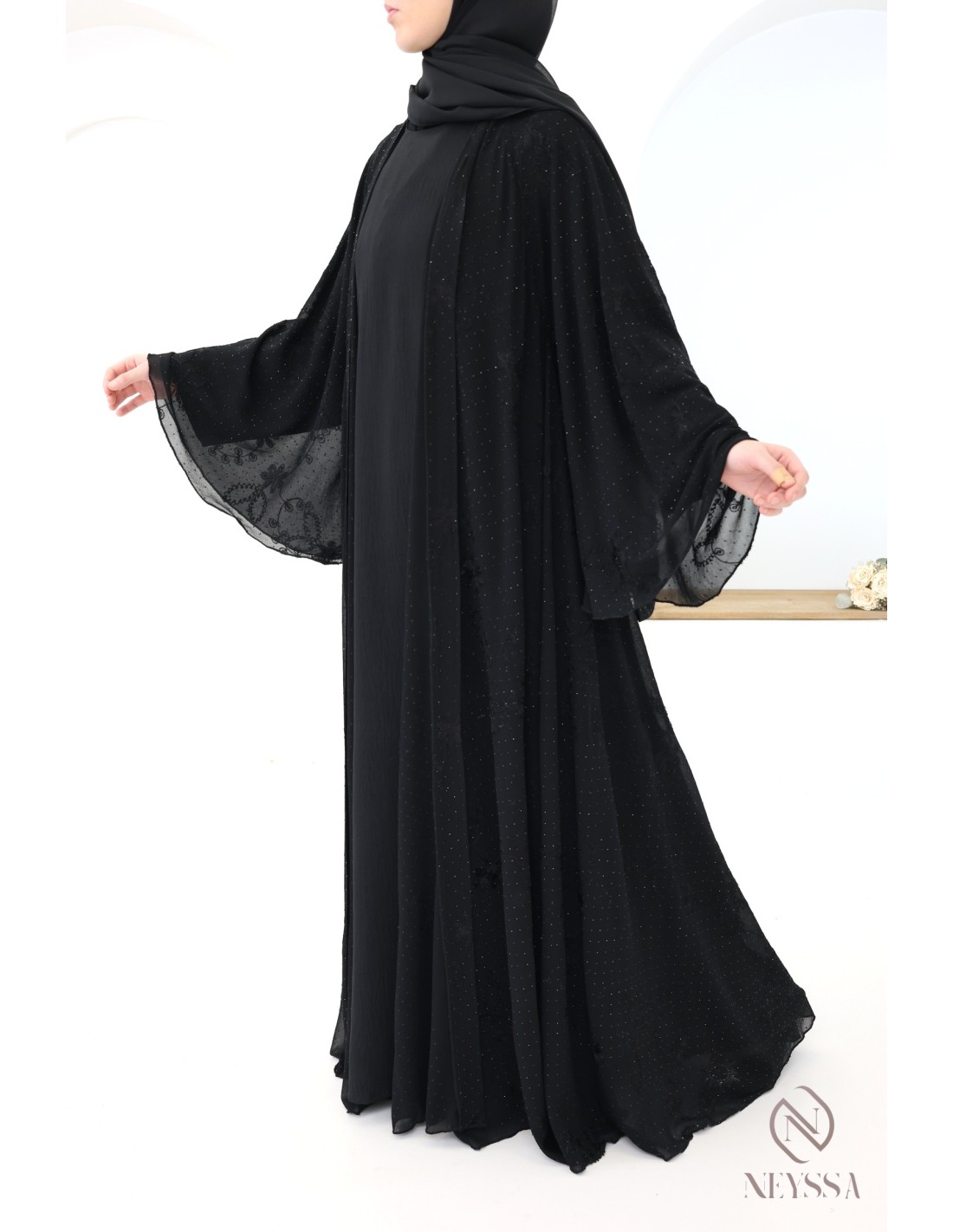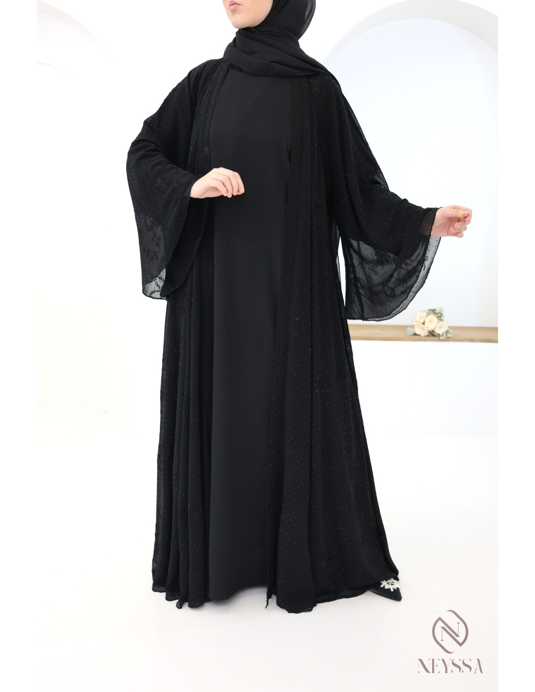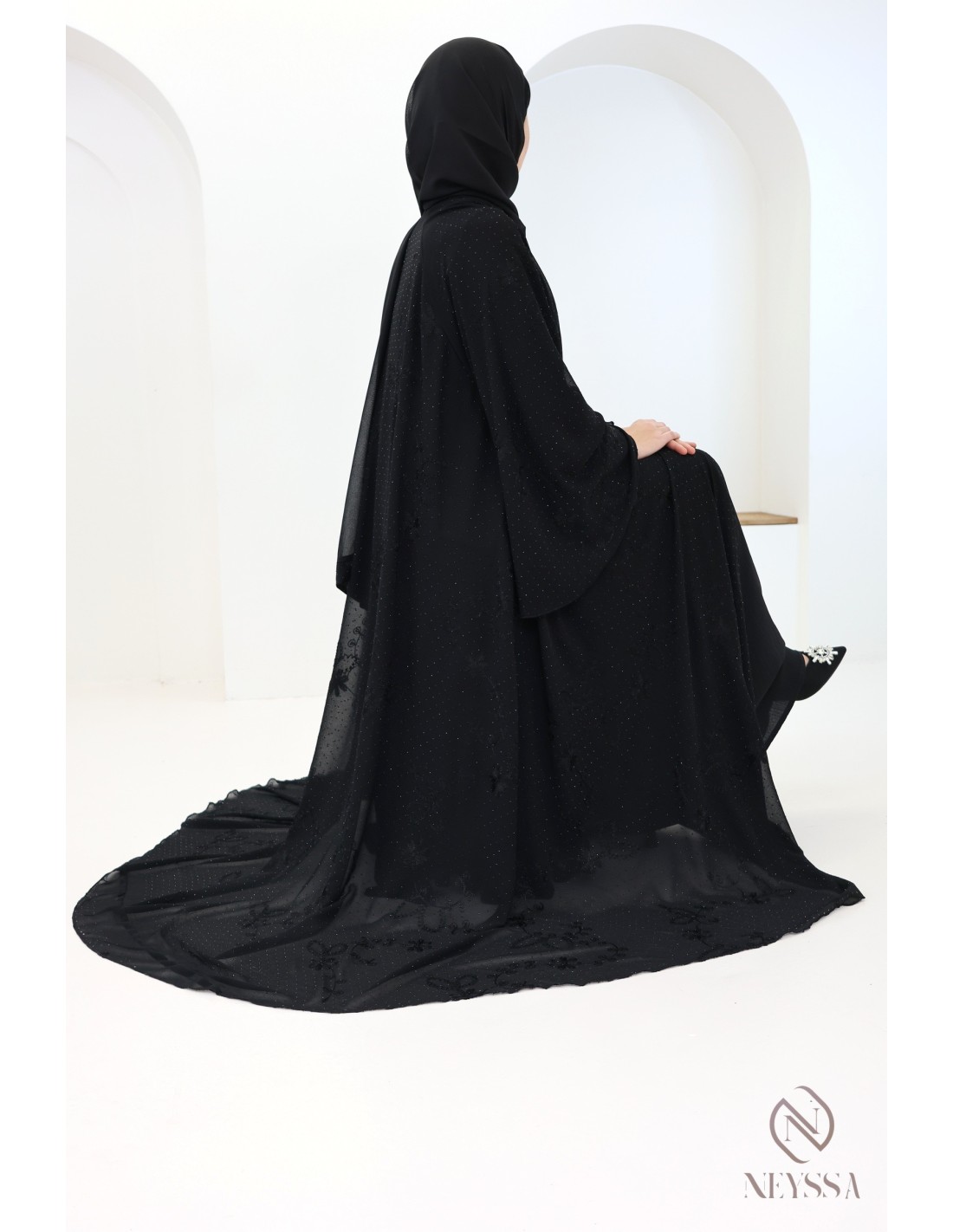 You'll fall in love with this black chiffon kimono abaya with rhinestones and a flared cut: