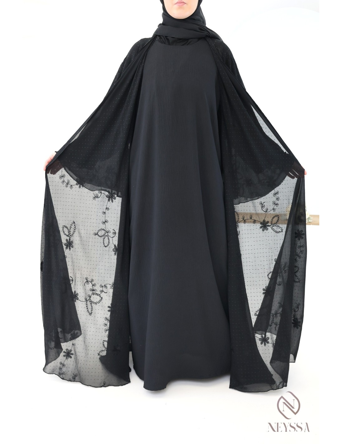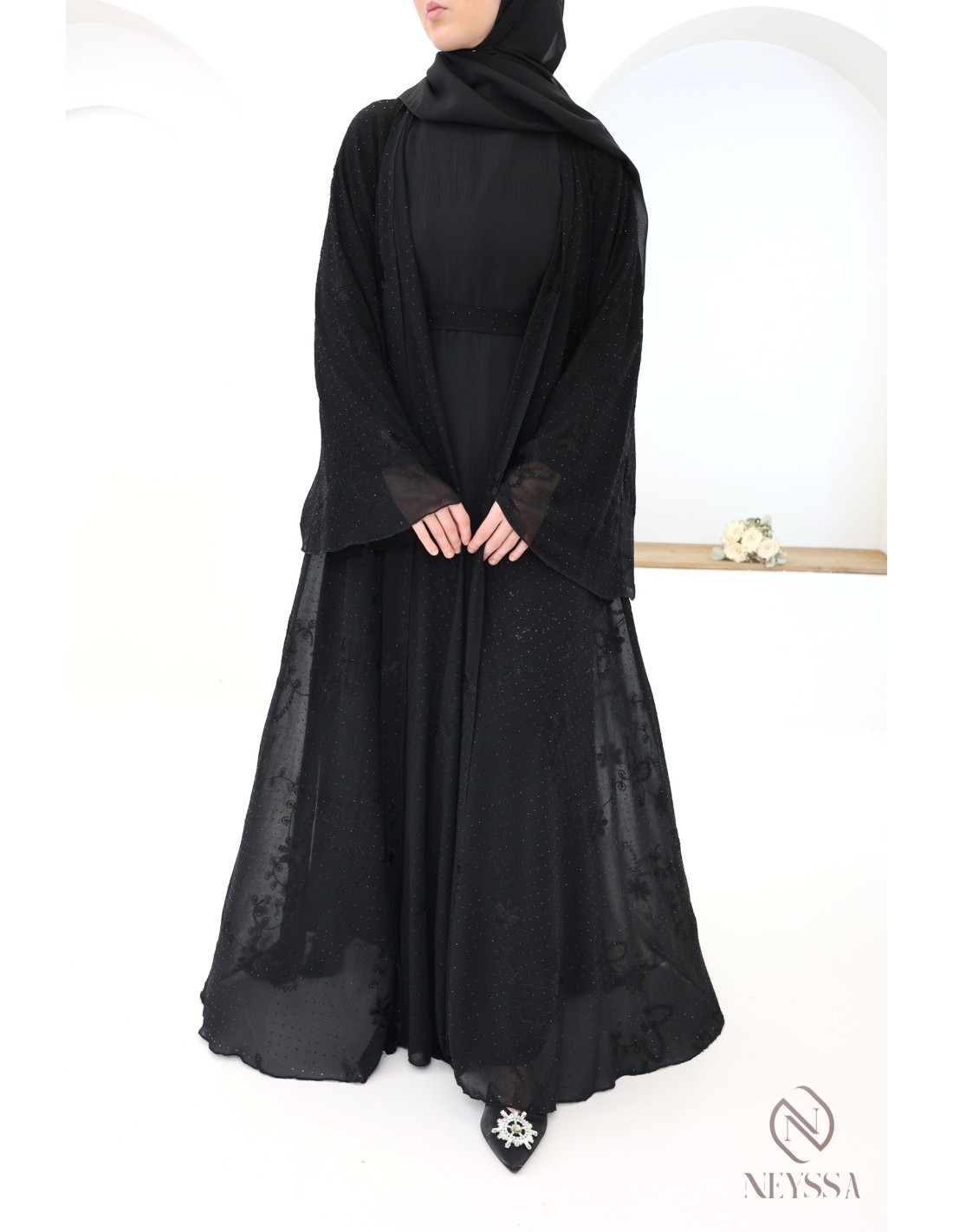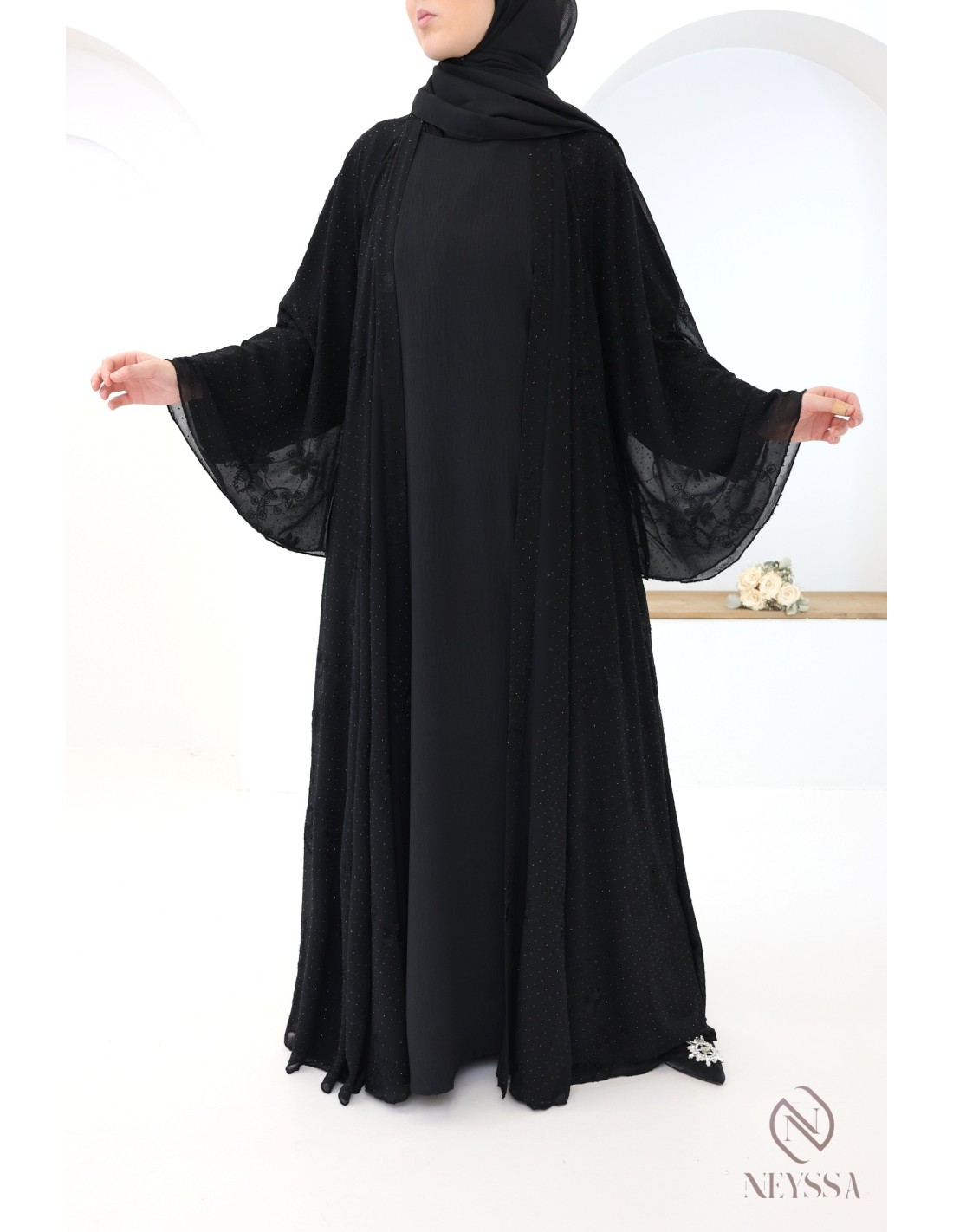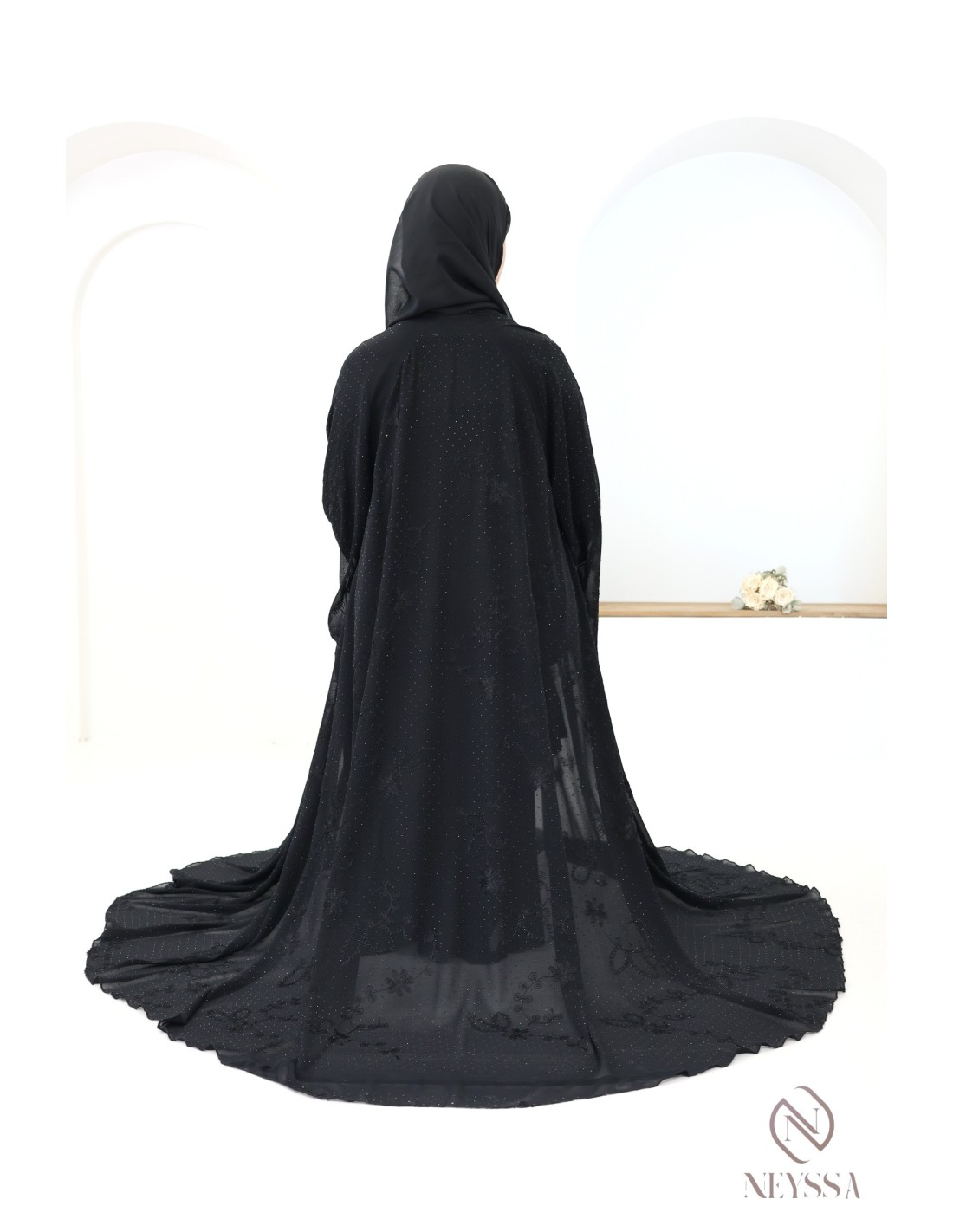 You'll fall in love with this black chiffon kimono abaya with rhinestones and a flared cut: