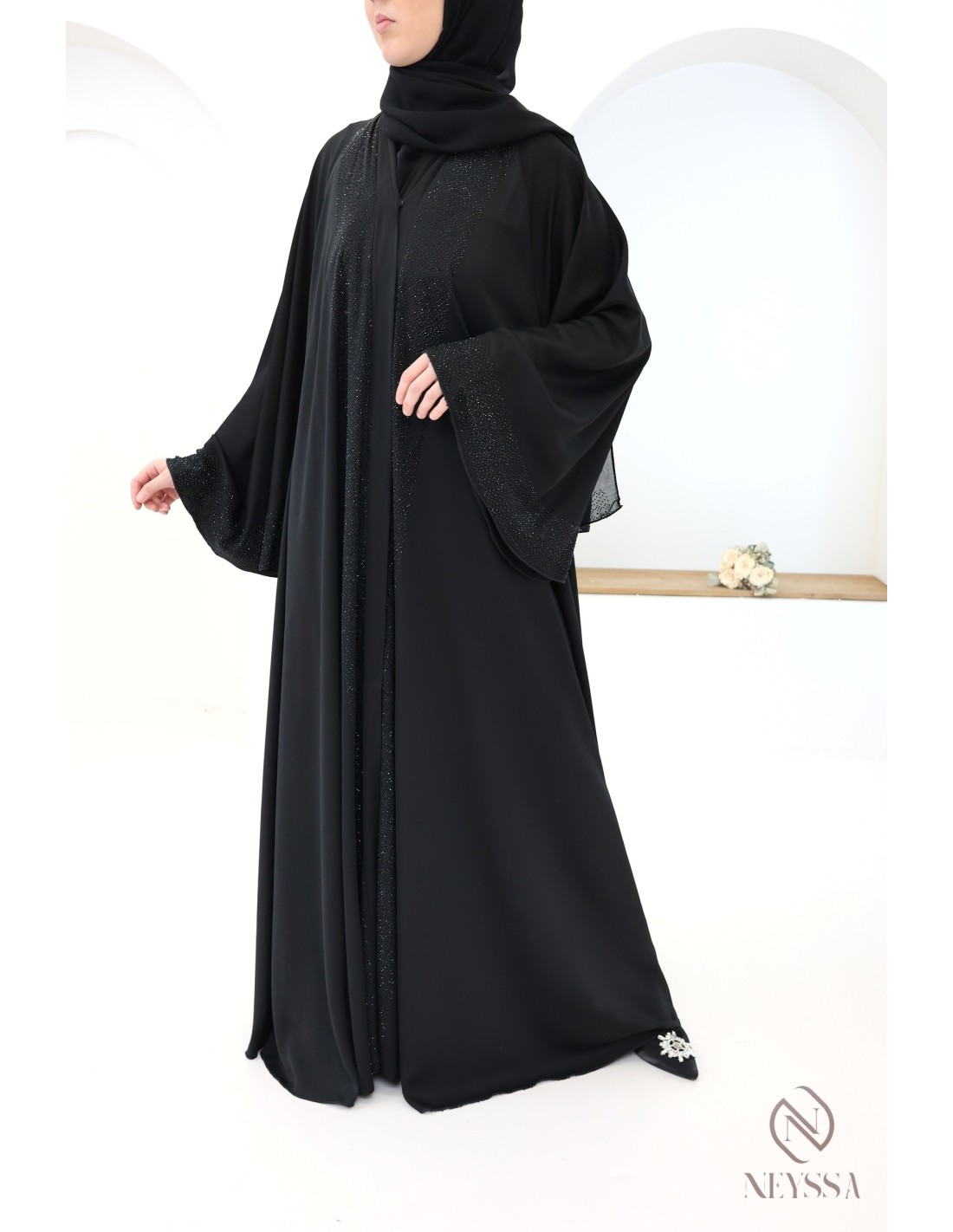 Black umbrella-cut Dubai kimono abaya with rhinestones: trendy Khaleeji style