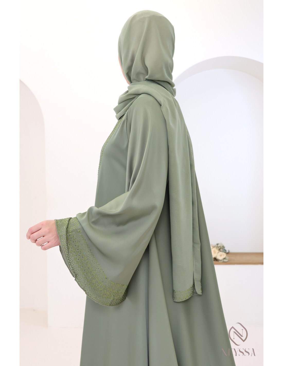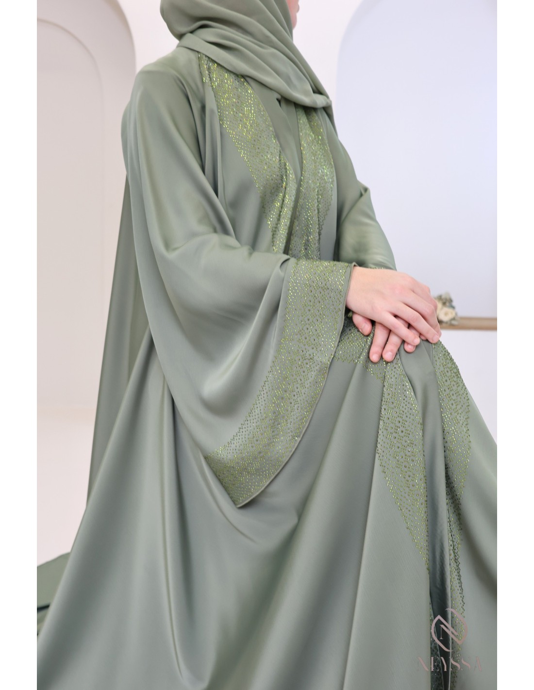 Green Dubai kimono abaya with rhinestones for chic veiled women: Umbrella cut