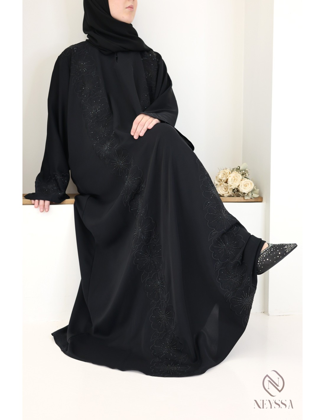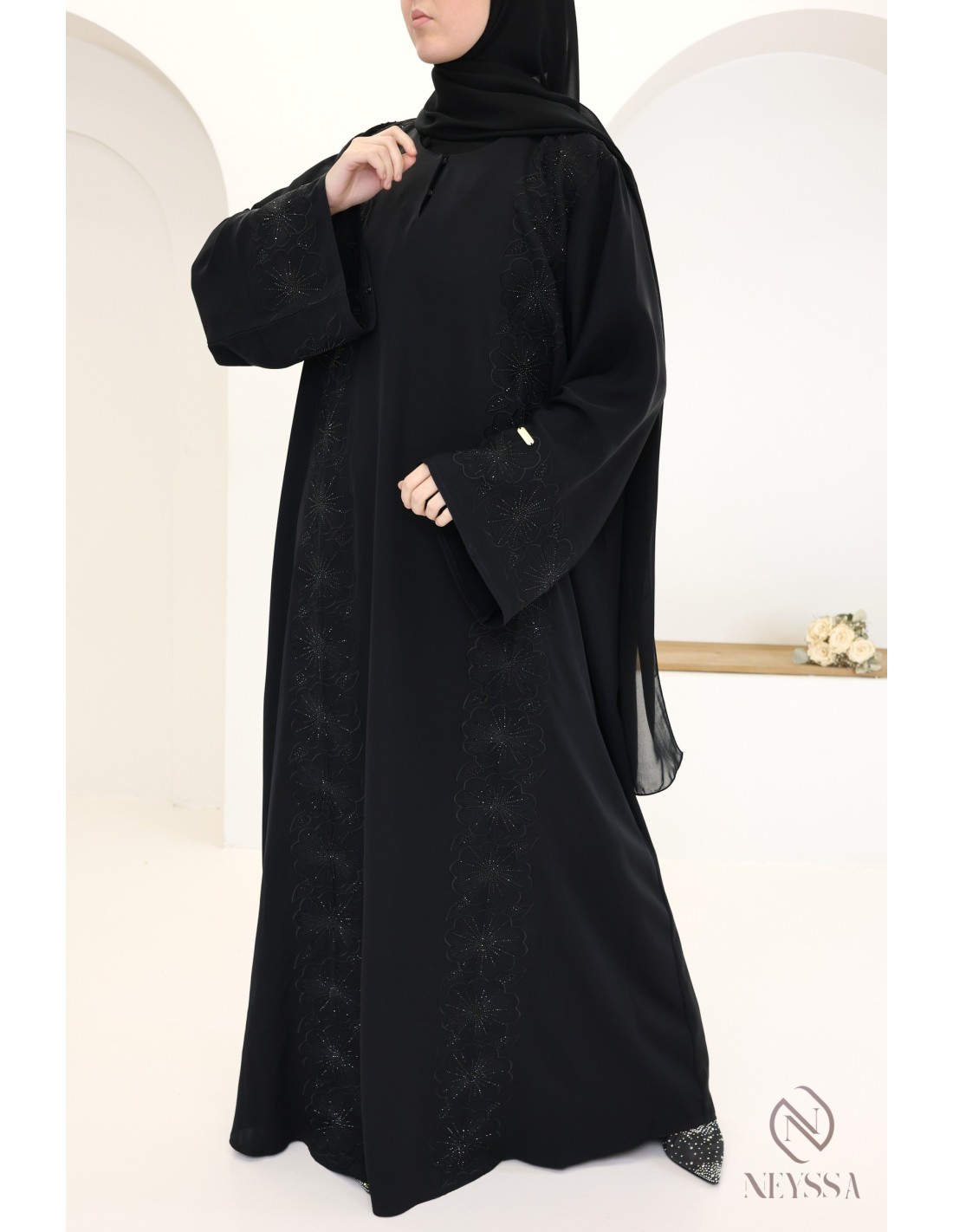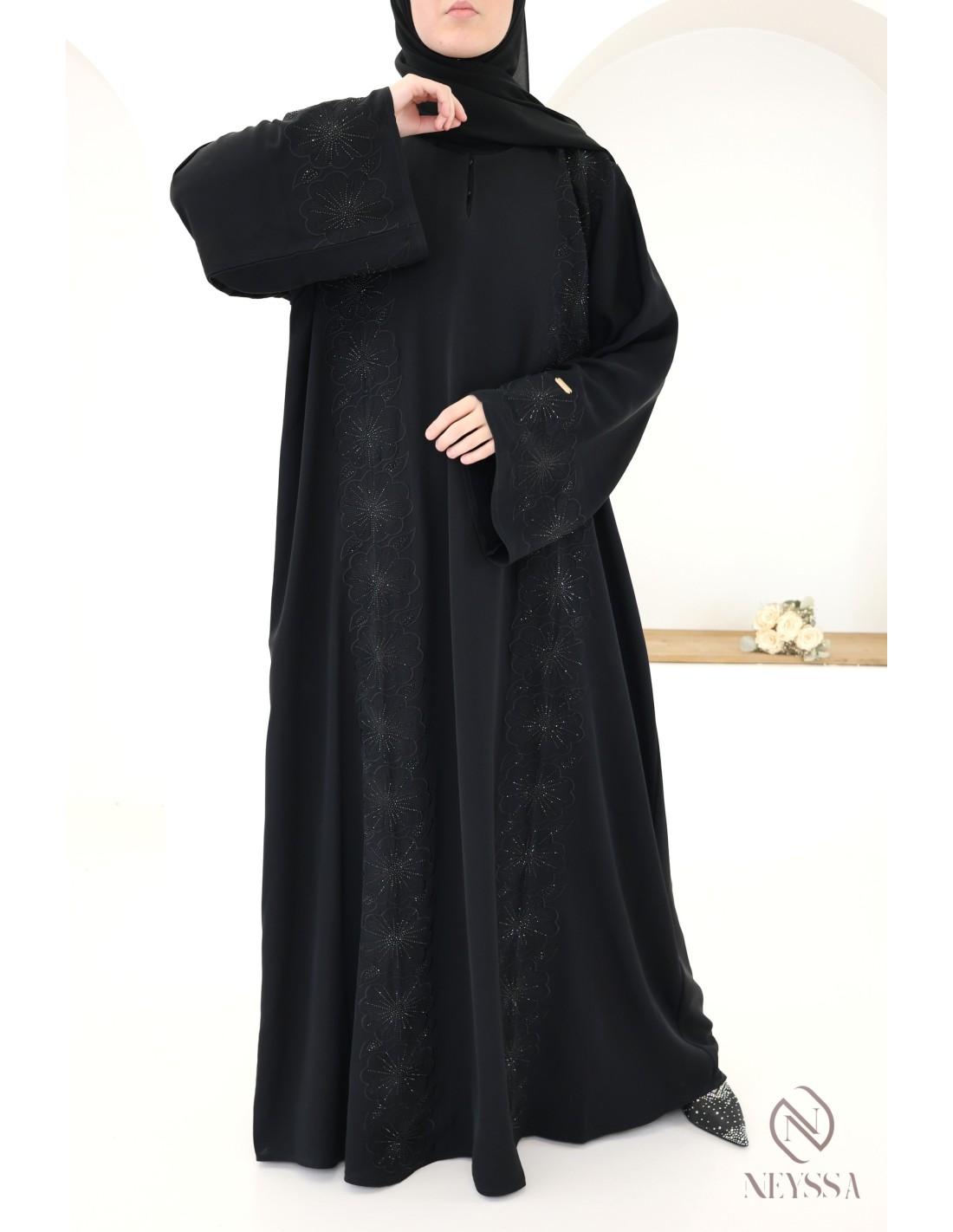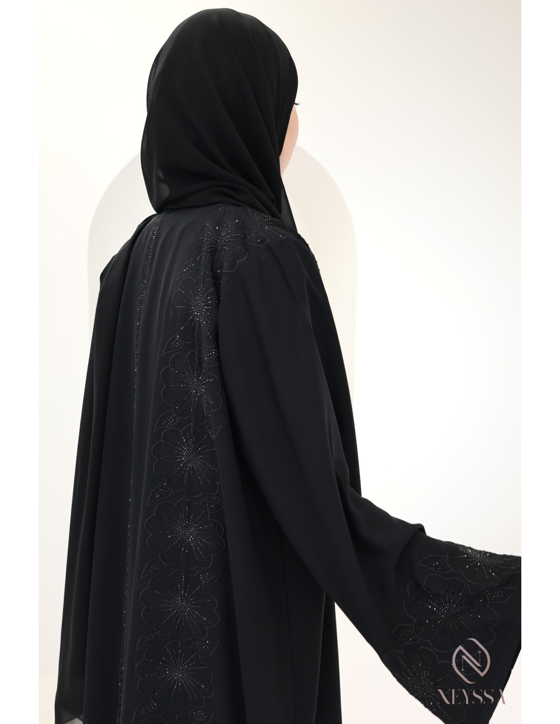 • Perfect customised finishes: A gold Neyssa plaque is sewn onto the sleeve of the abaya.