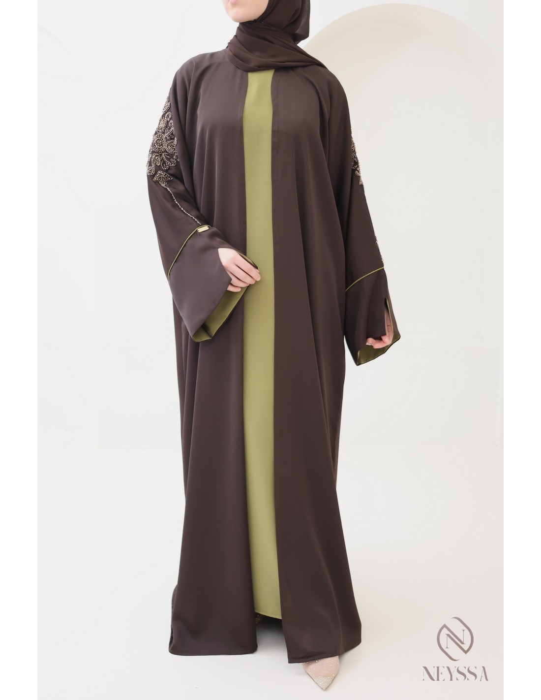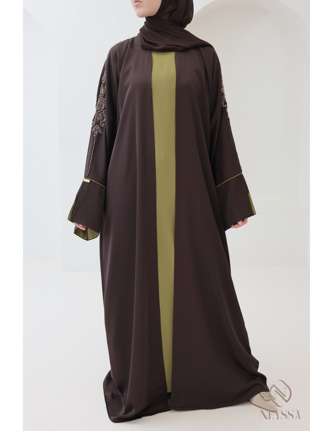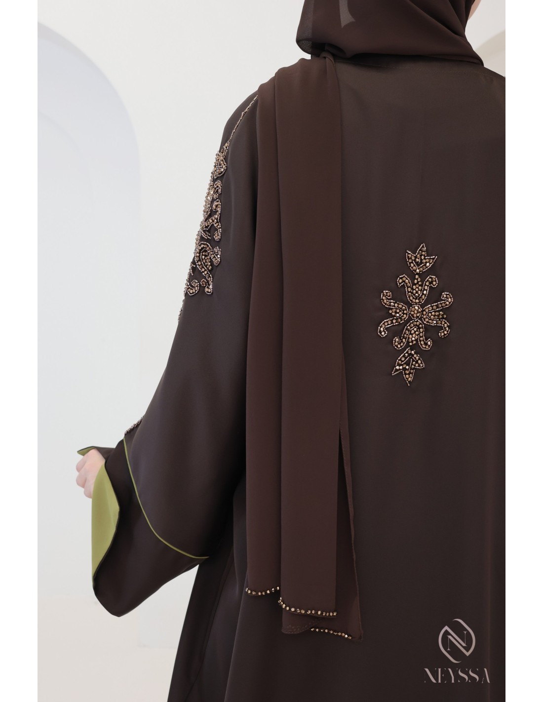With this magnificent abaya outfit, you're sure to shine on the big day! Confection Neyssa represents a perfect marriage of elegance and sophistication. Carefully crafted in our workshops in Dubai, this exceptional quality abaya exudes incomparable charm.