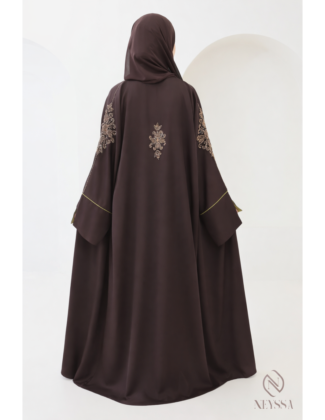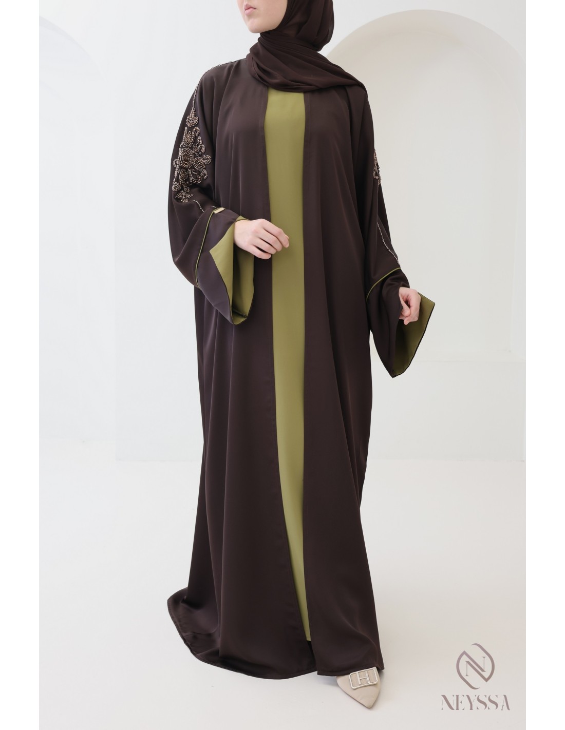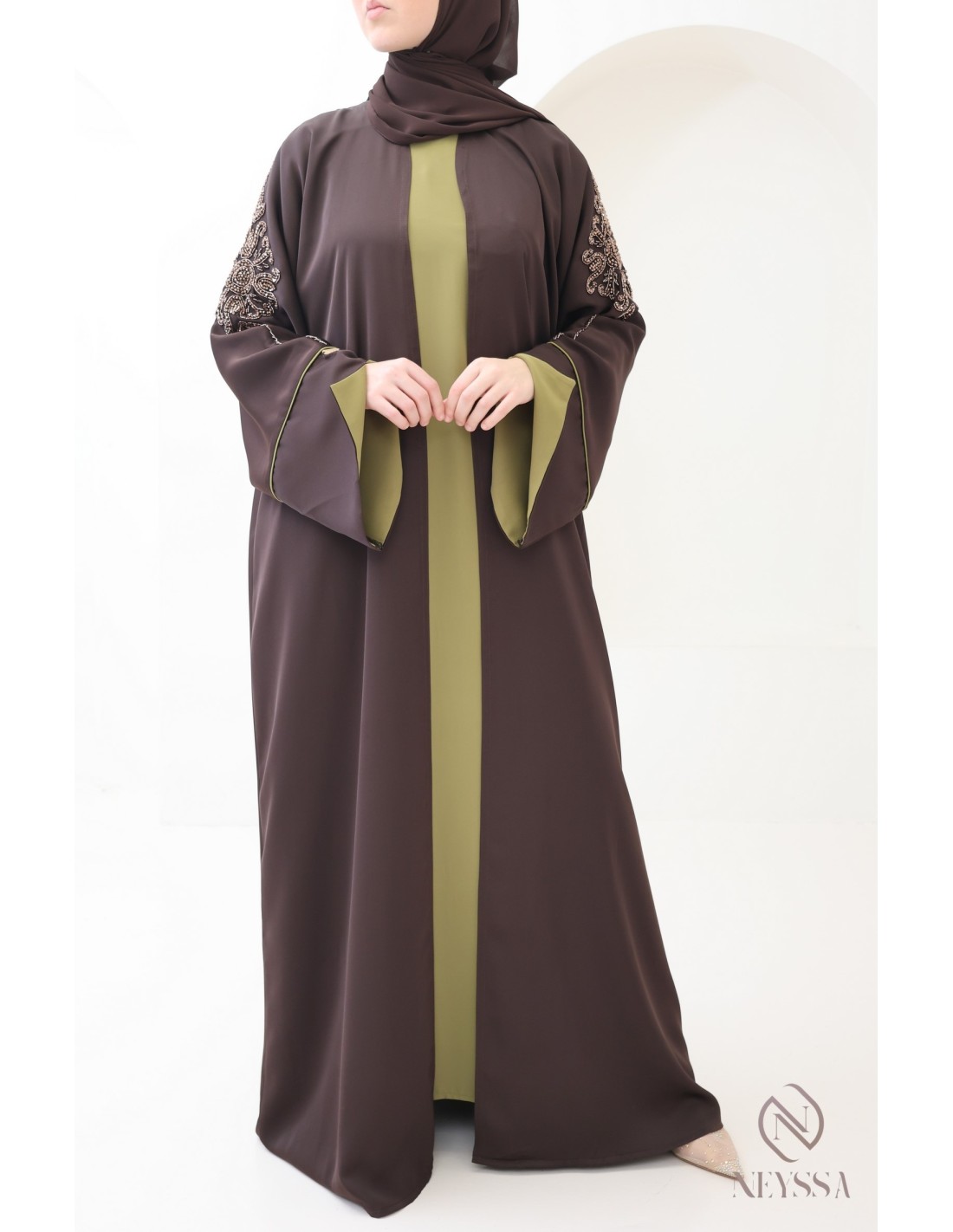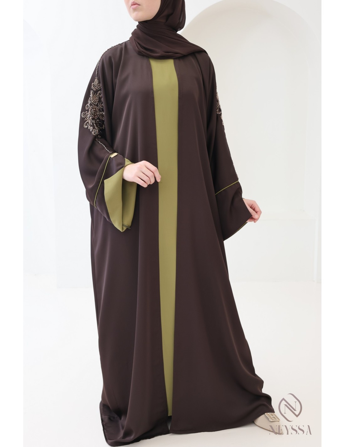 With this magnificent abaya outfit, you're sure to shine on the big day! Confection Neyssa represents a perfect marriage of elegance and sophistication. Carefully crafted in our workshops in Dubai, this exceptional quality abaya exudes incomparable charm.