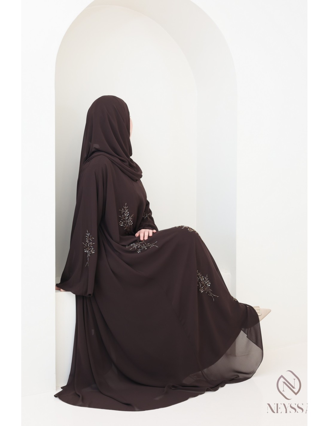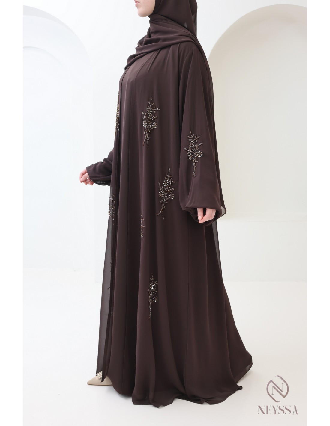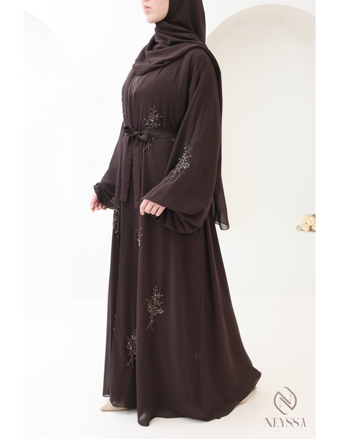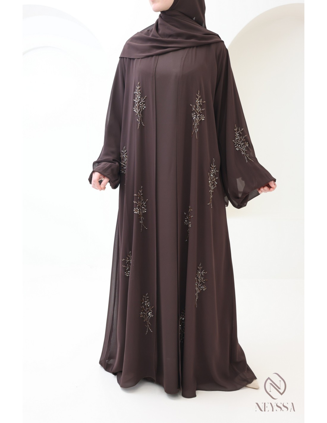 With this magnificent abaya outfit, you're sure to shine on the big day! Confection Neyssa represents a perfect marriage of elegance and sophistication. Carefully crafted in our workshops in Dubai, this exceptional quality abaya exudes incomparable charm.