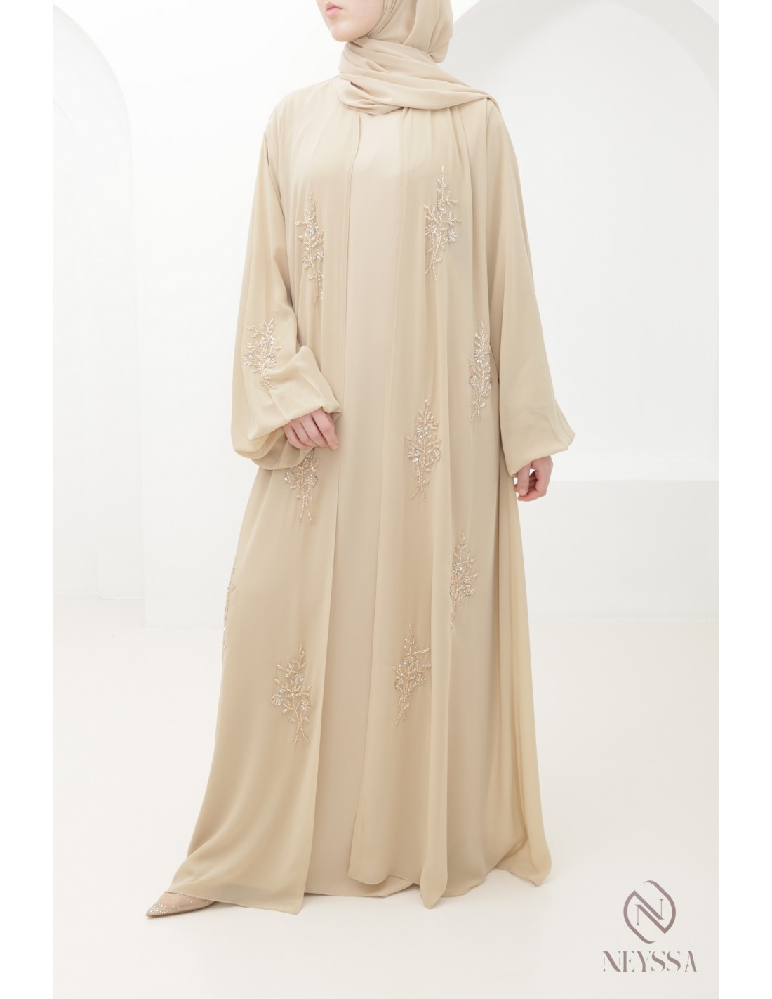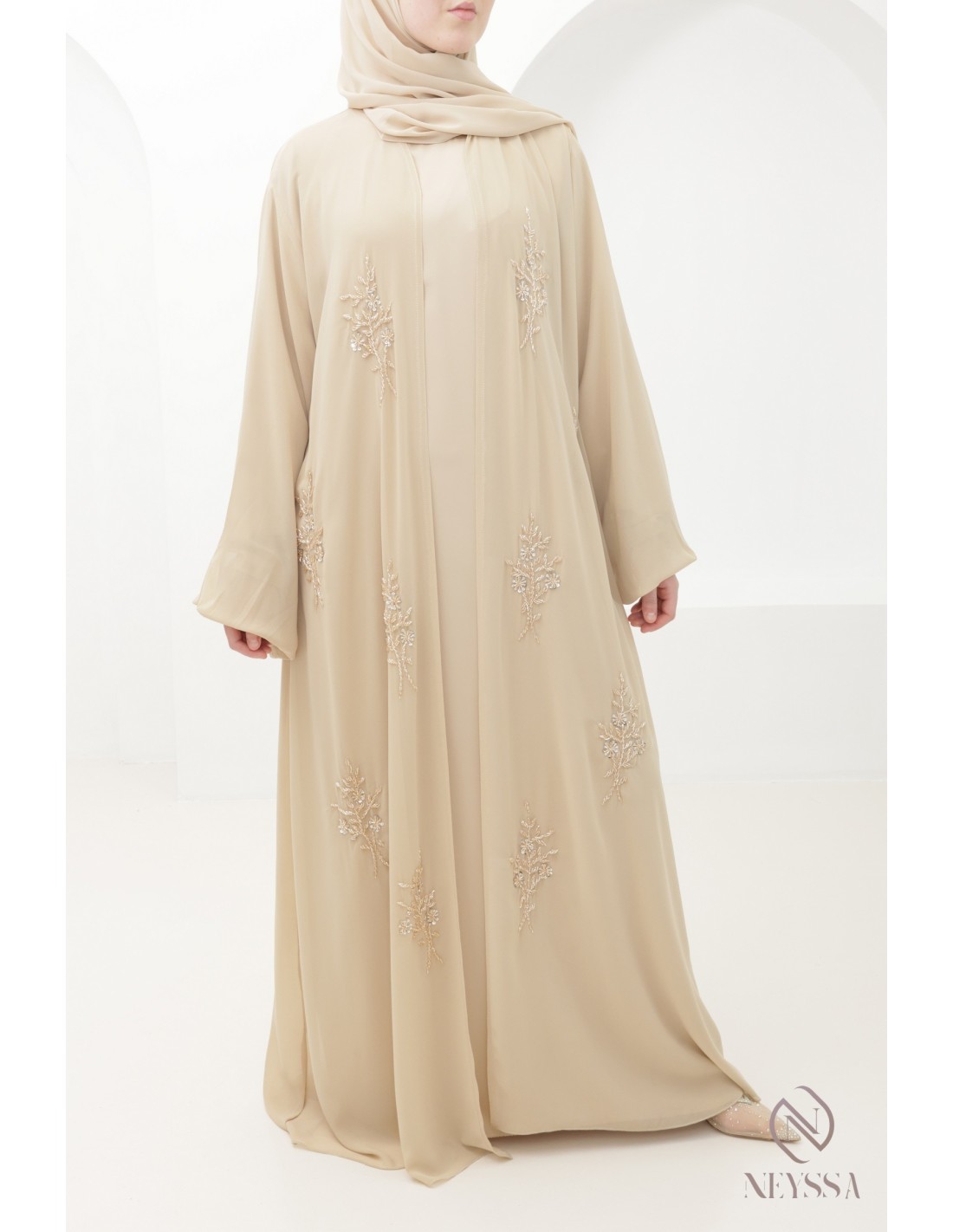 With this magnificent abaya outfit, you're sure to shine on the big day! Confection Neyssa represents a perfect marriage of elegance and sophistication. Carefully crafted in our workshops in Dubai, this exceptional quality abaya exudes incomparable charm.