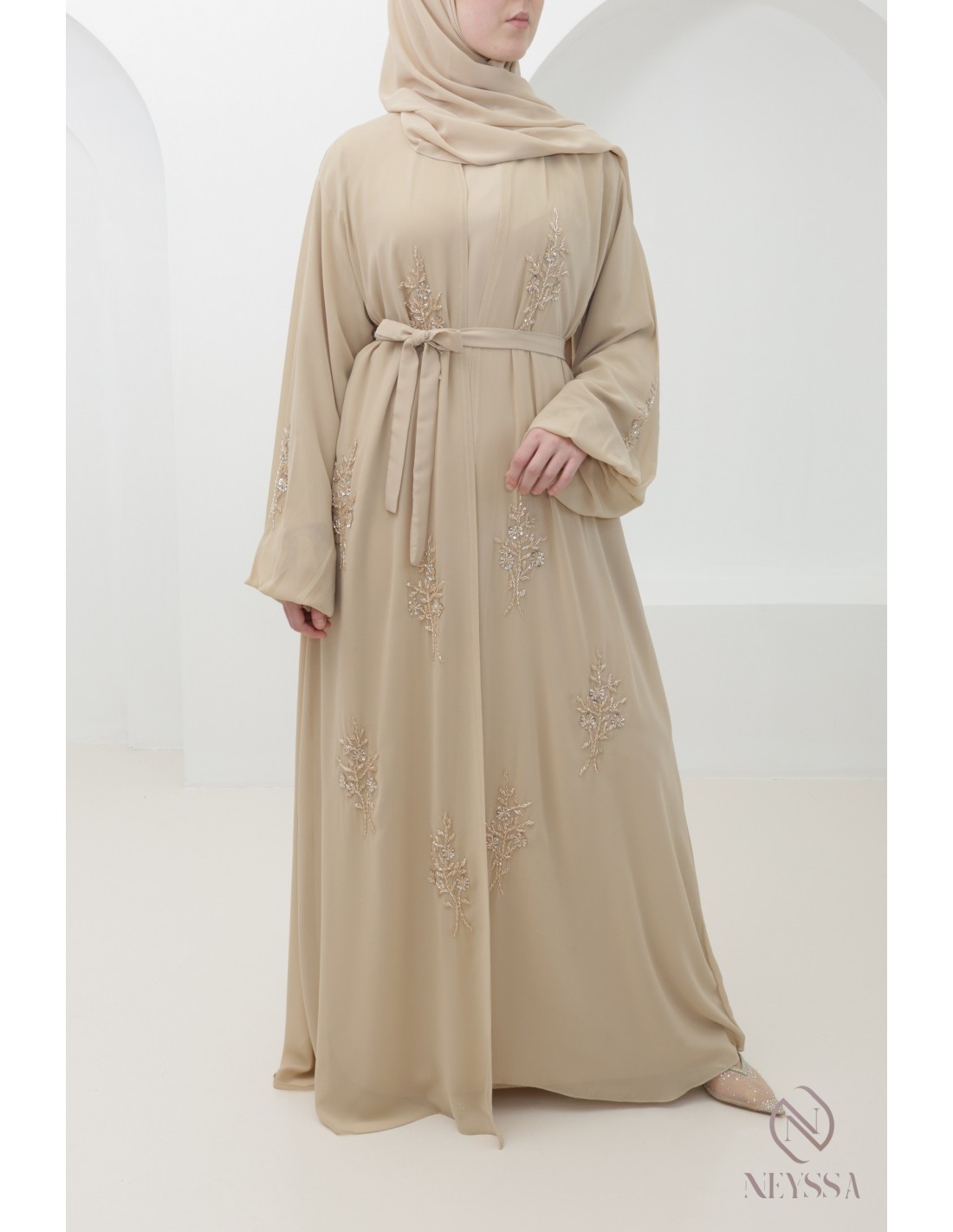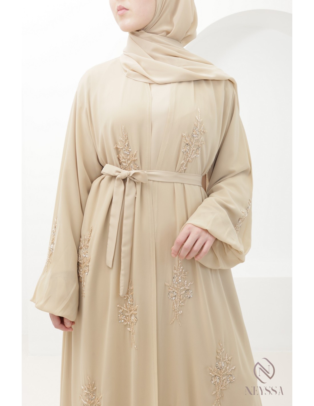 Dubai Beige Kimono Abaya, 4 pieces, hand-embroidered: Neyssa Confection