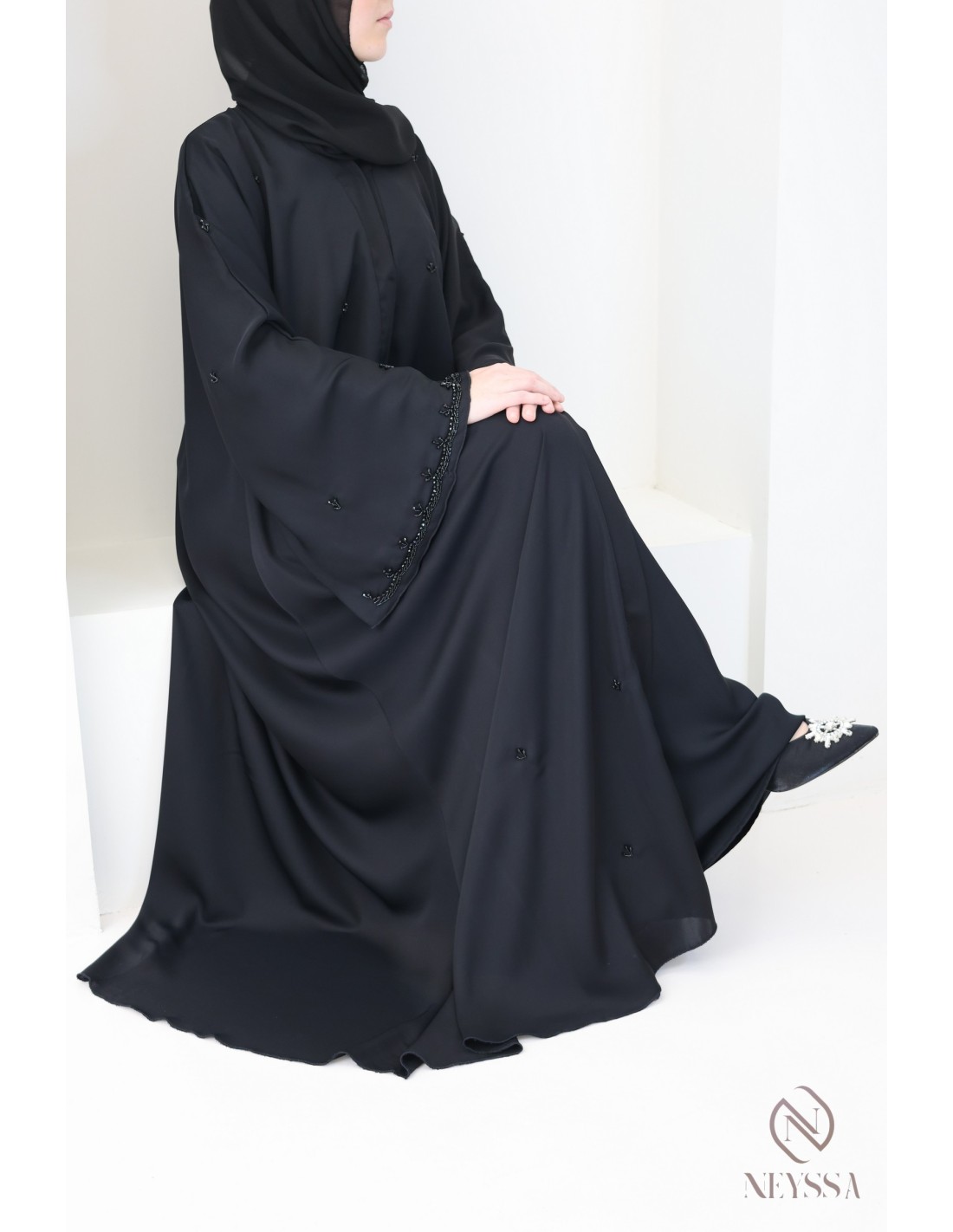 - Perfect personalized finishes: A silver Neyssa plaque is sewn onto the sleeve of the abaya.