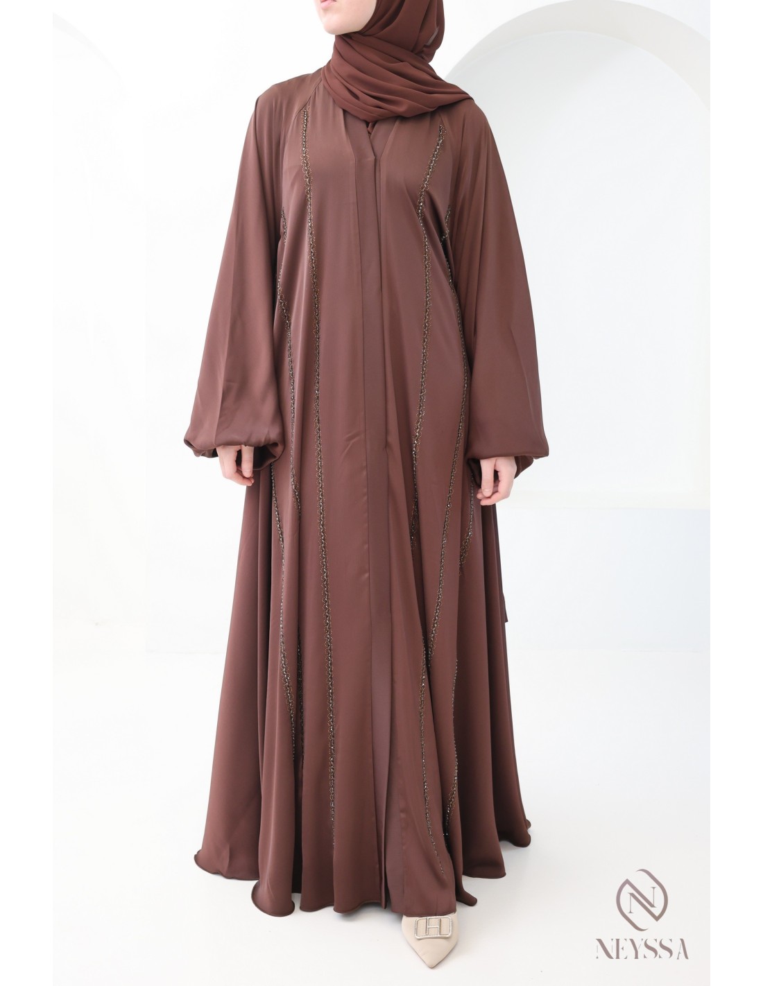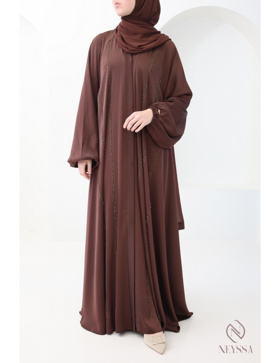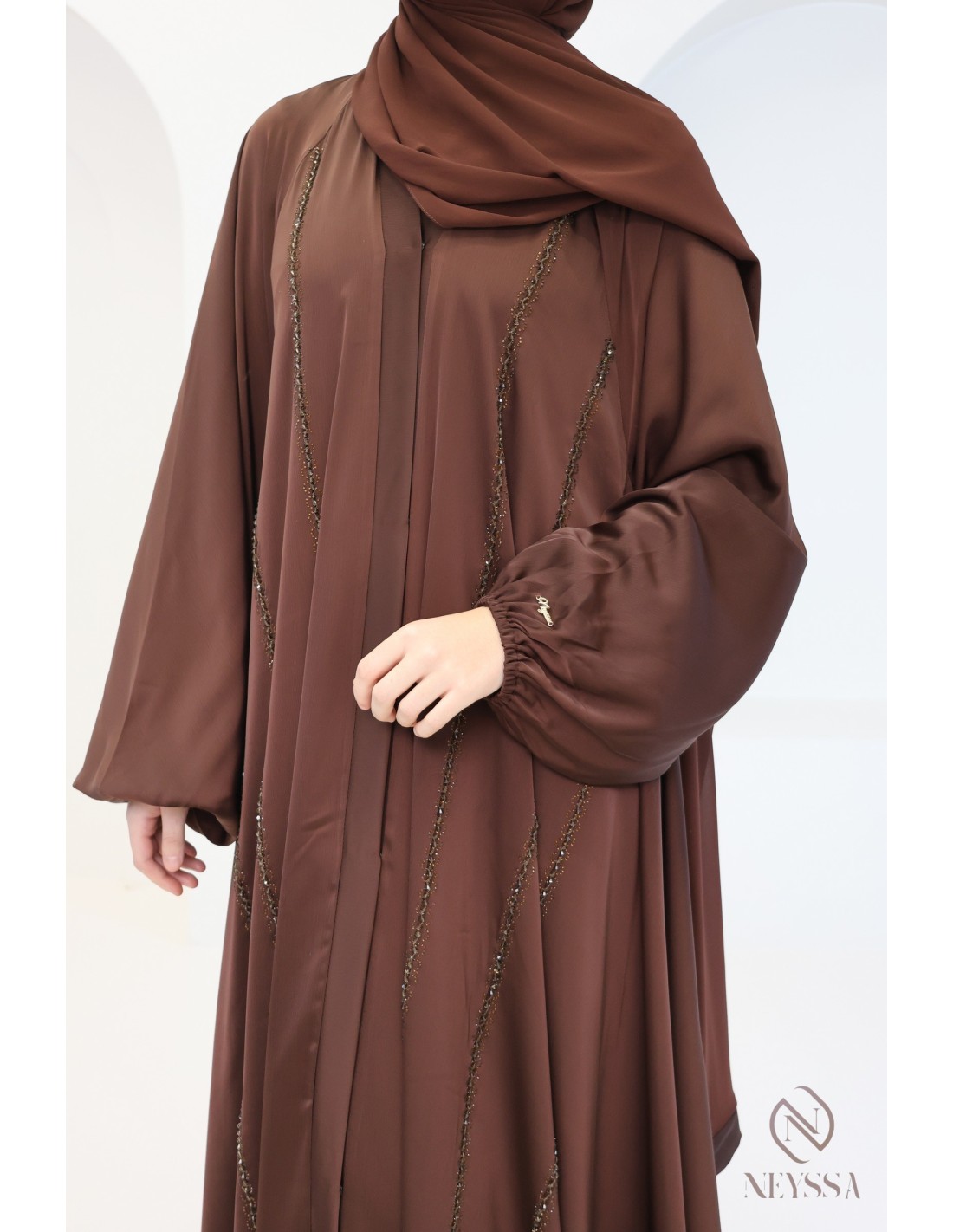 - Perfect personalized finishes: A silver Neyssa plaque is sewn onto the sleeve of the abaya.
