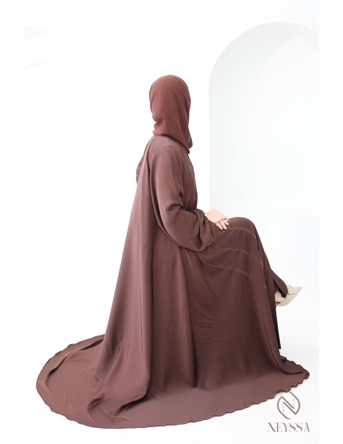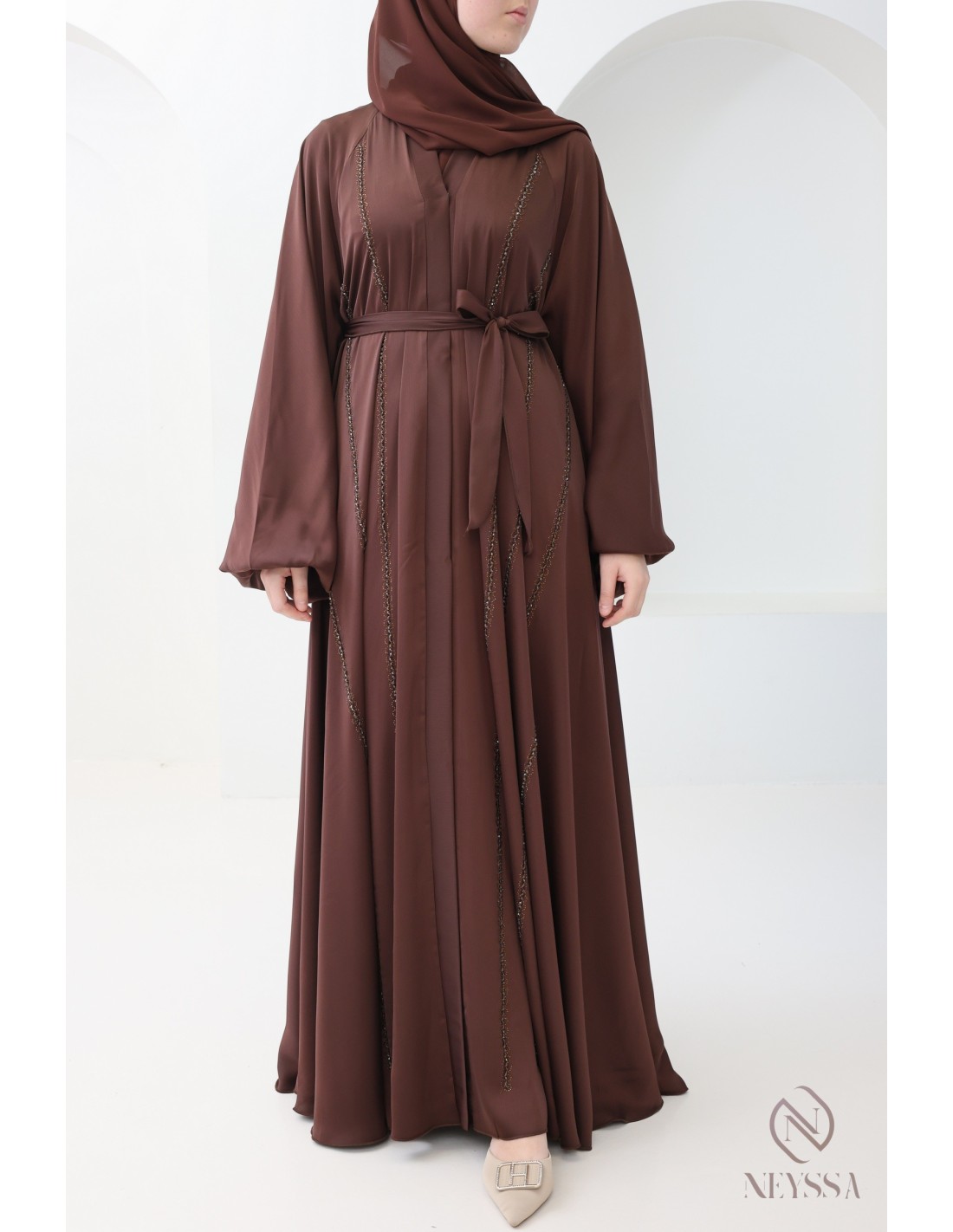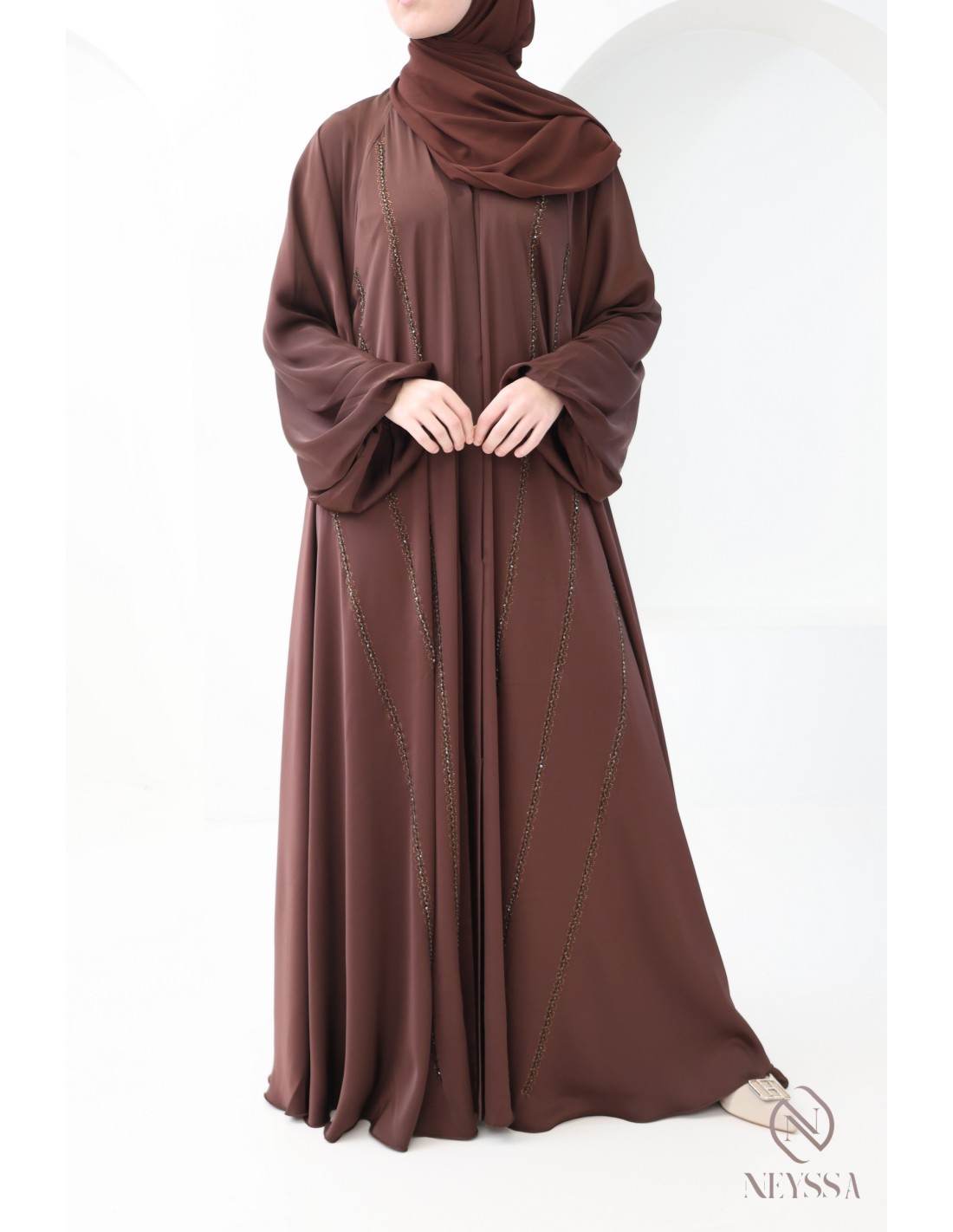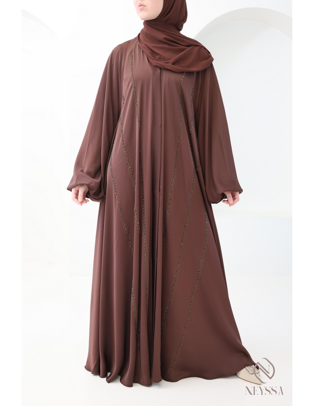- Perfect personalized finishes: A silver Neyssa plaque is sewn onto the sleeve of the abaya.