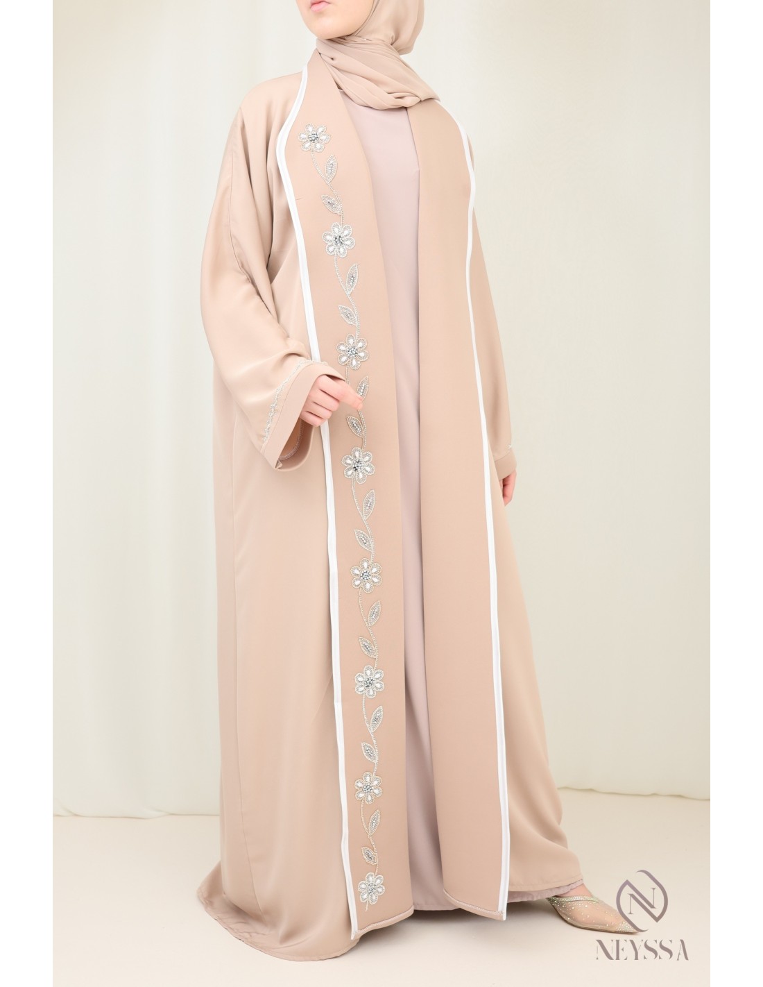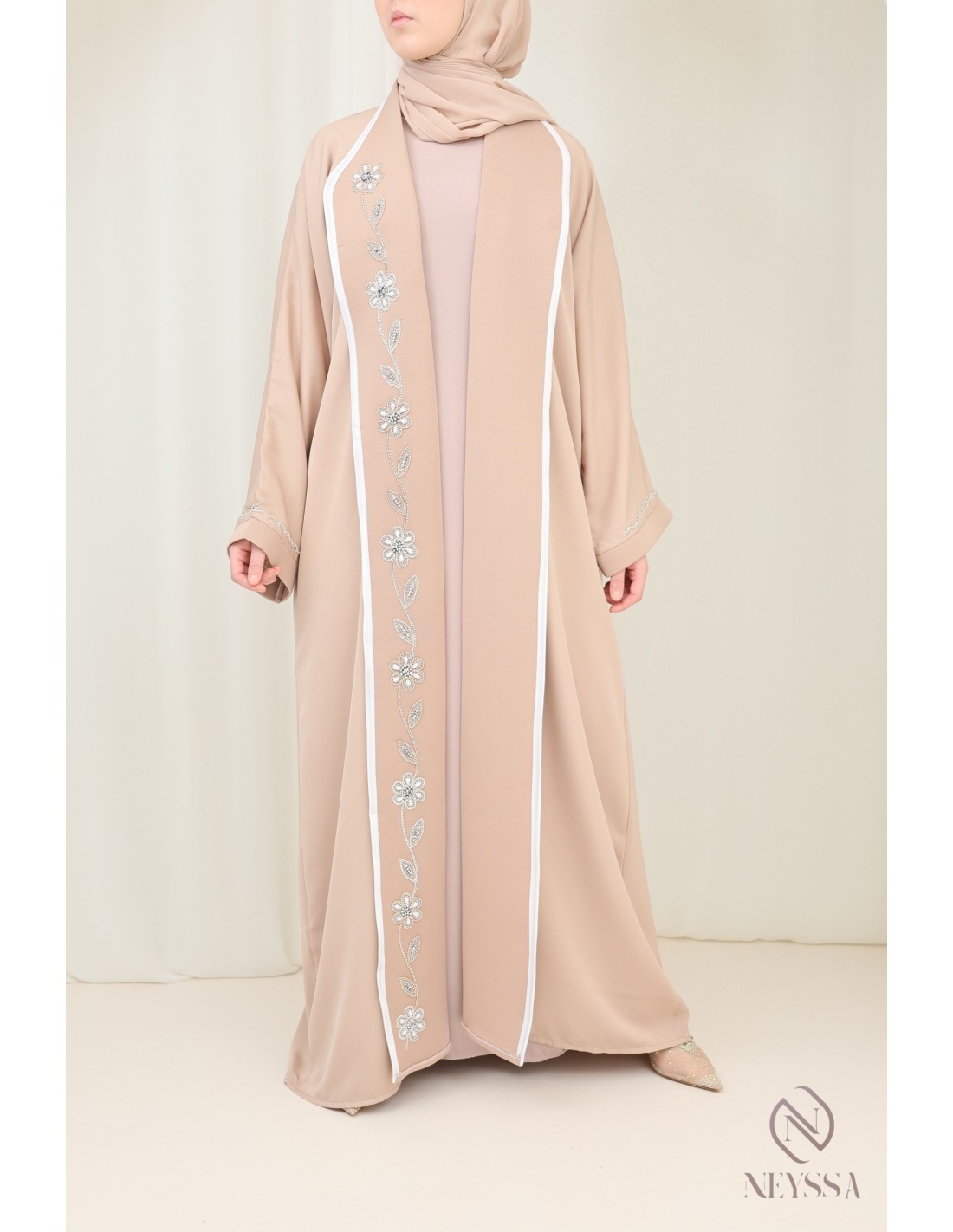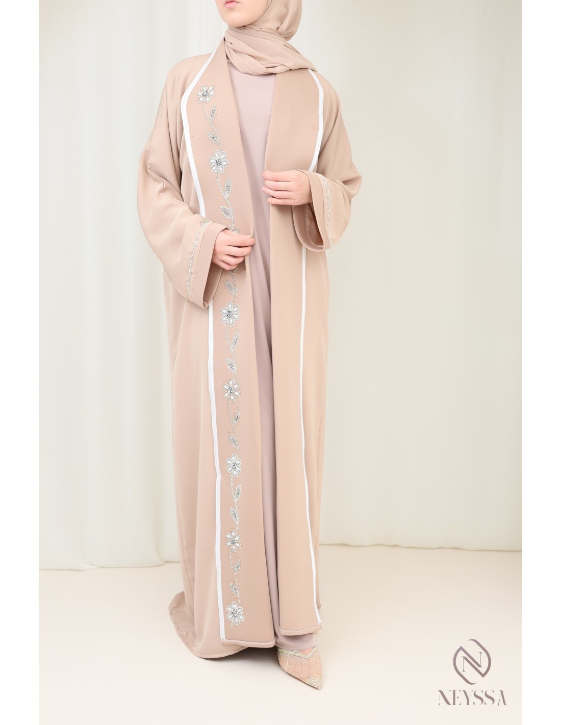 You'll fall in love with the high-quality beige Dubai kimono abaya embroidered by Neyssa Confection: