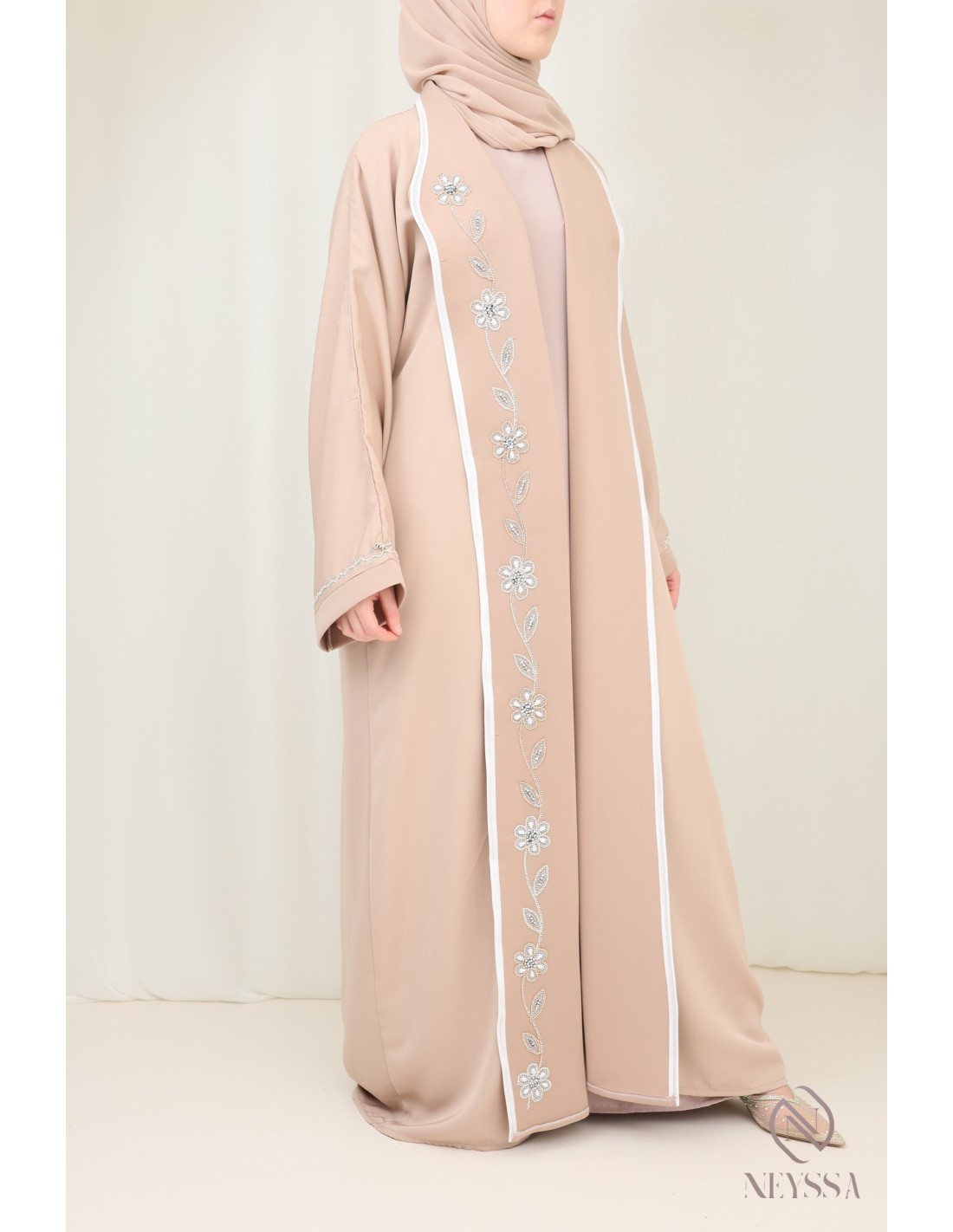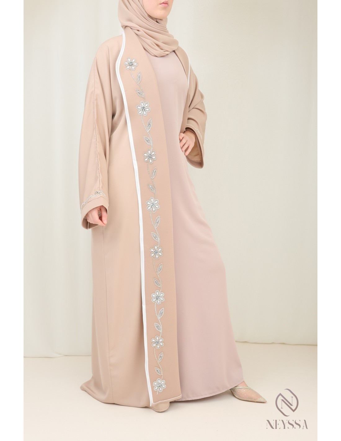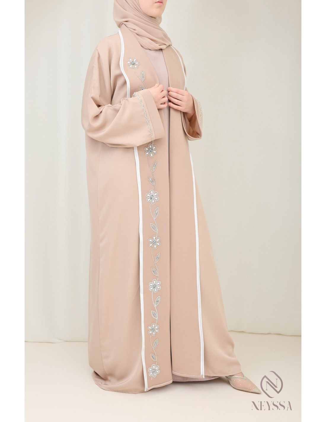 You'll fall in love with the high-quality beige Dubai kimono abaya embroidered by Neyssa Confection: