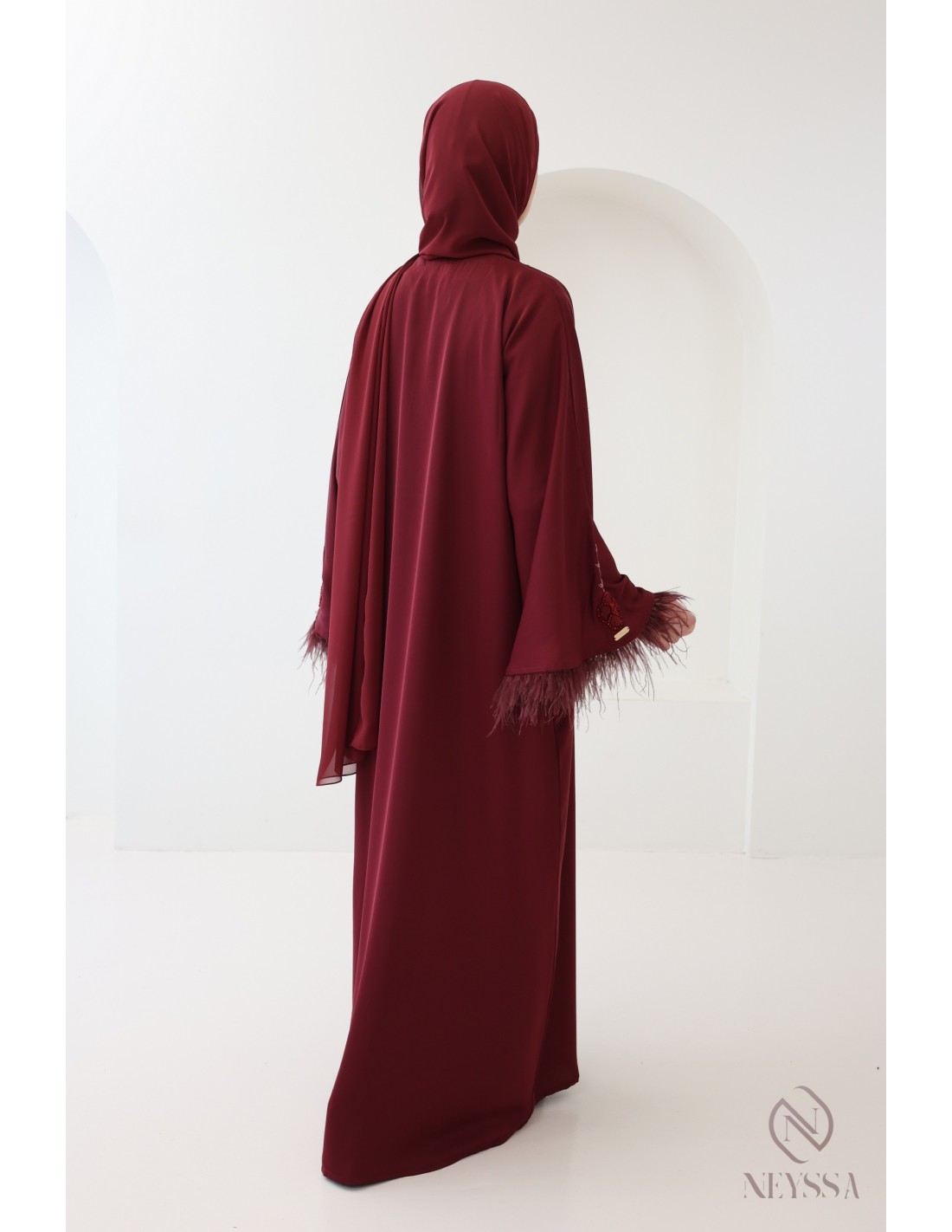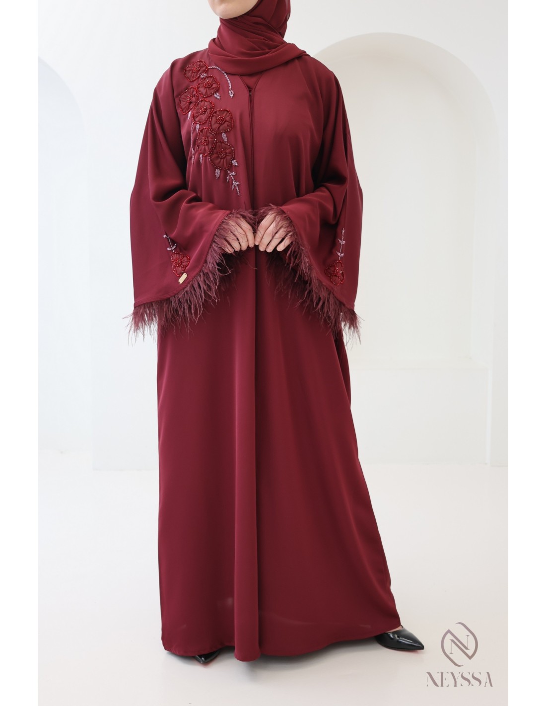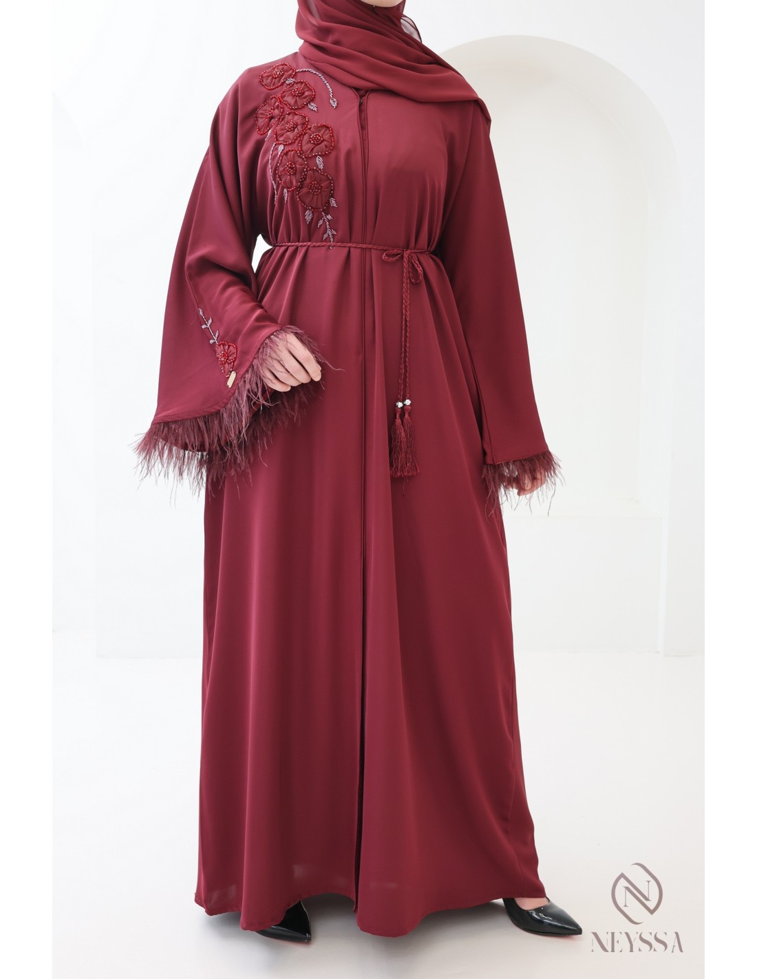 Women's Bordeaux Dubai Abaya with Feather Details