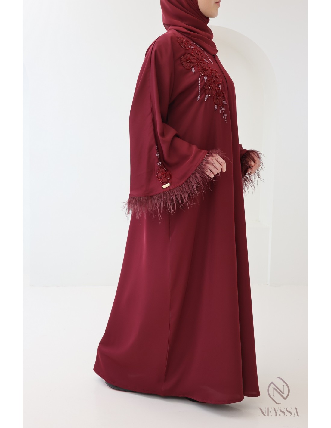 Dubai Abaya with Royal Velvet Bordeaux Beading and Feathers