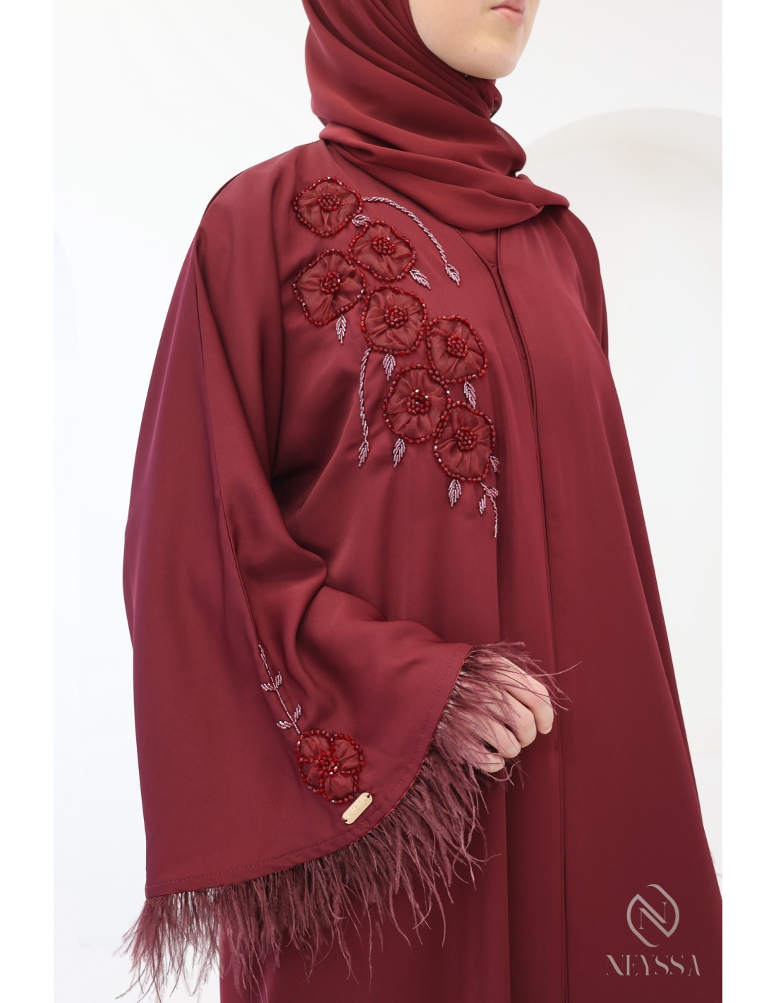 - Perfect customised finishes: A gold Neyssa plaque is sewn onto the sleeve of the abaya.