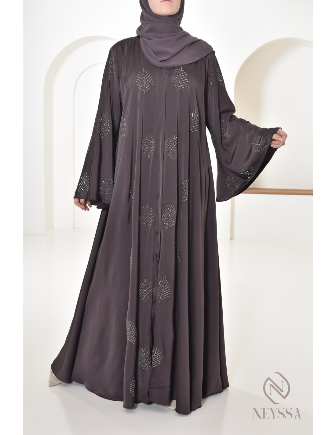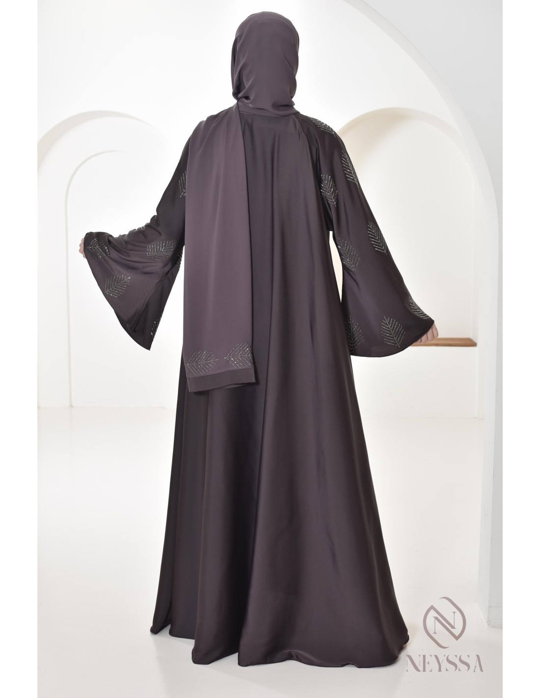 - Perfect personalized finishes: A silver Neyssa plaque is sewn onto the sleeve of the abaya.