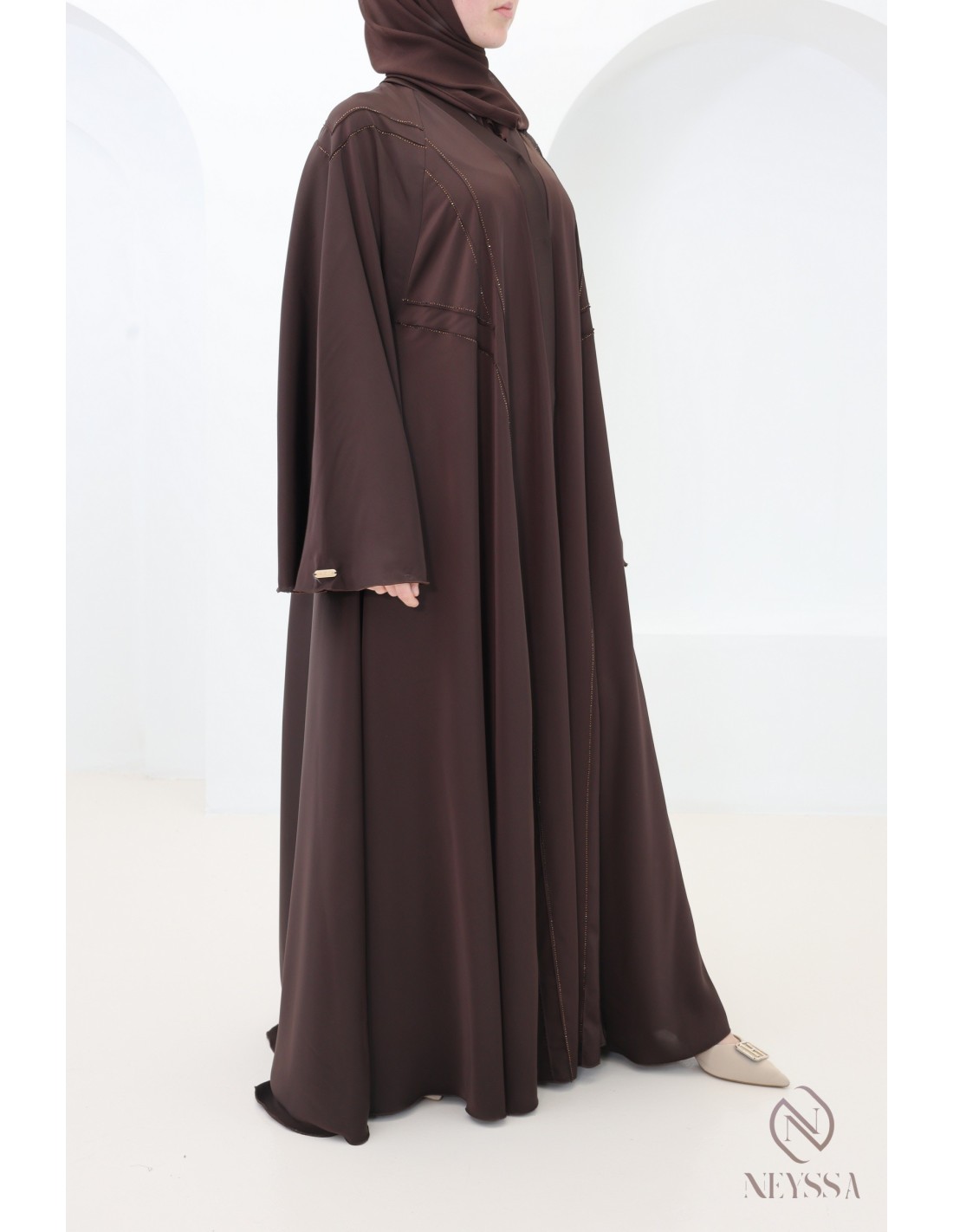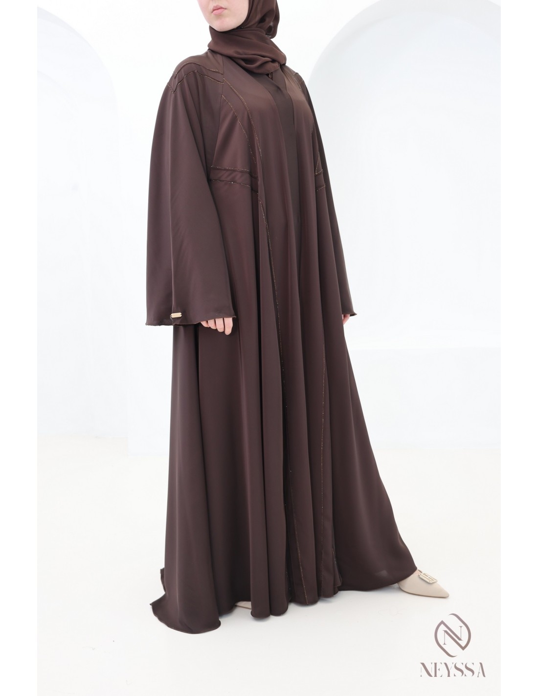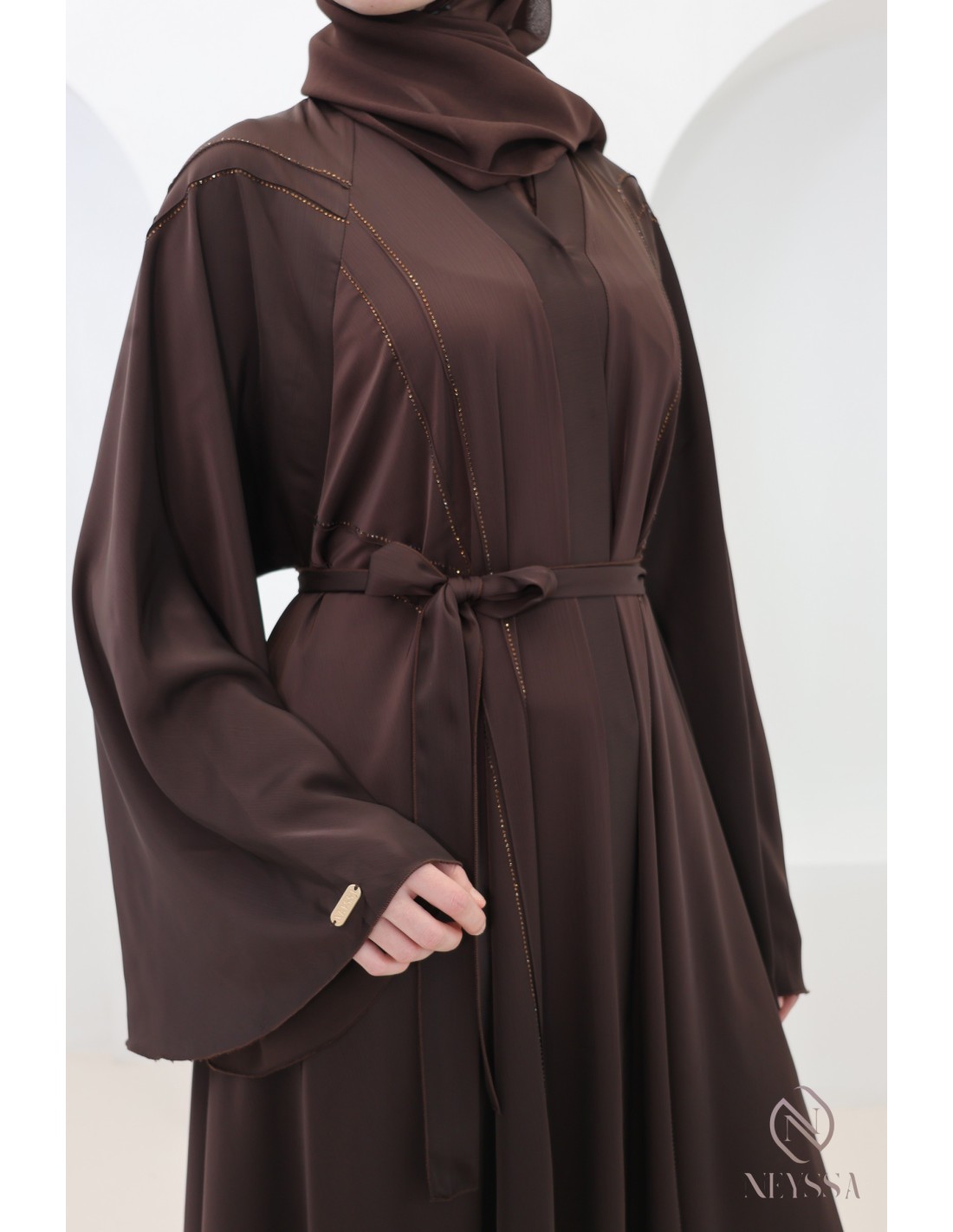 - Perfect personalized finishes: A silver Neyssa plaque is sewn onto the sleeve of the abaya.