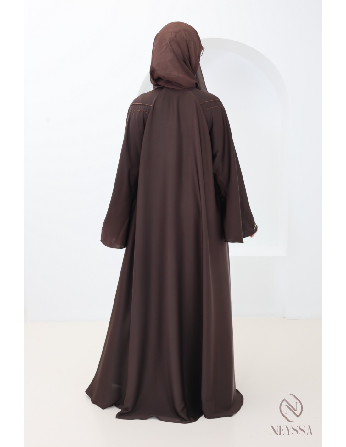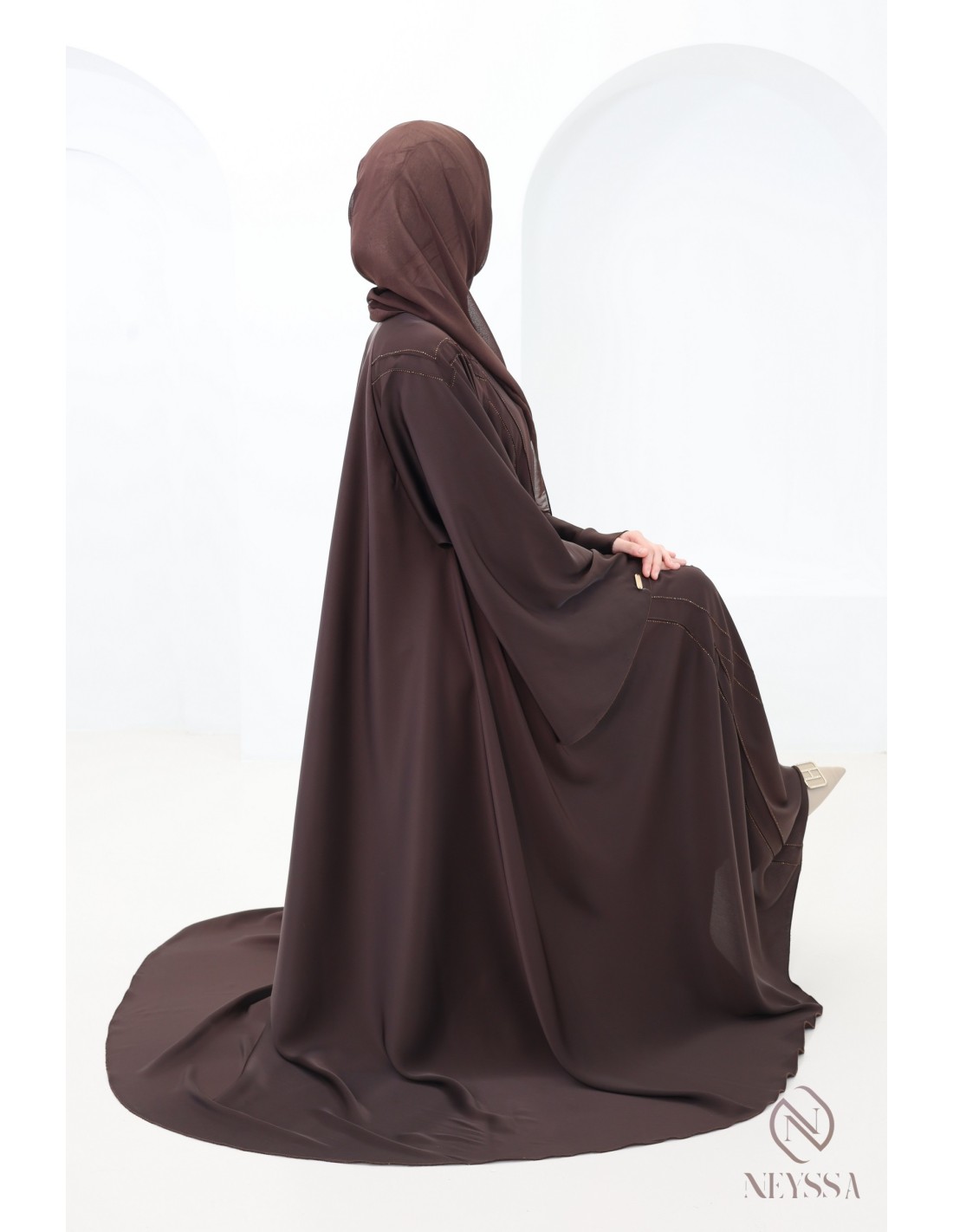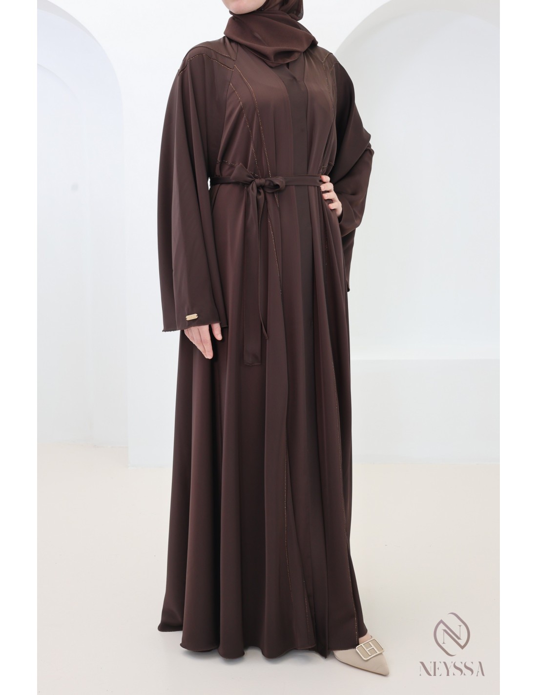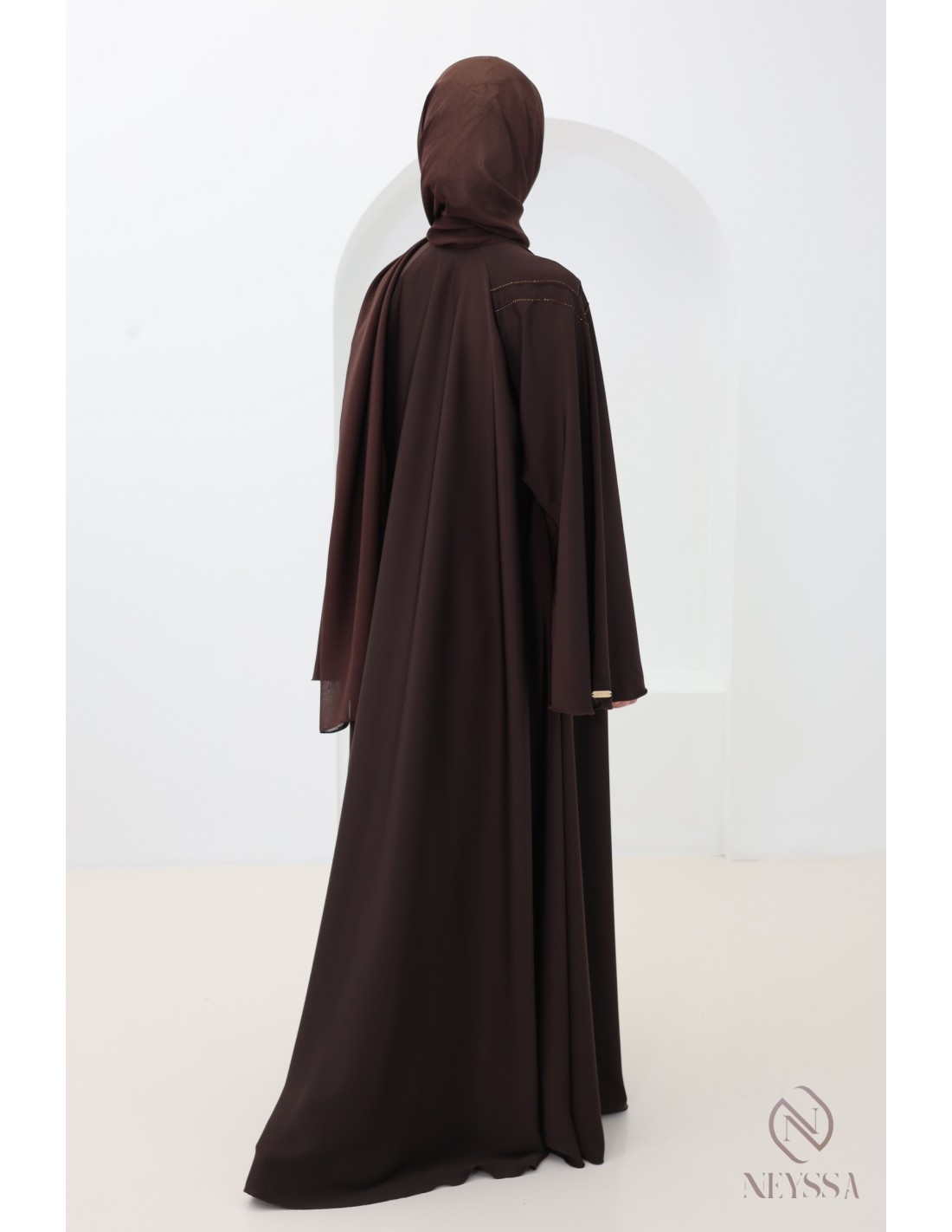 - Perfect personalized finishes: A silver Neyssa plaque is sewn onto the sleeve of the abaya.