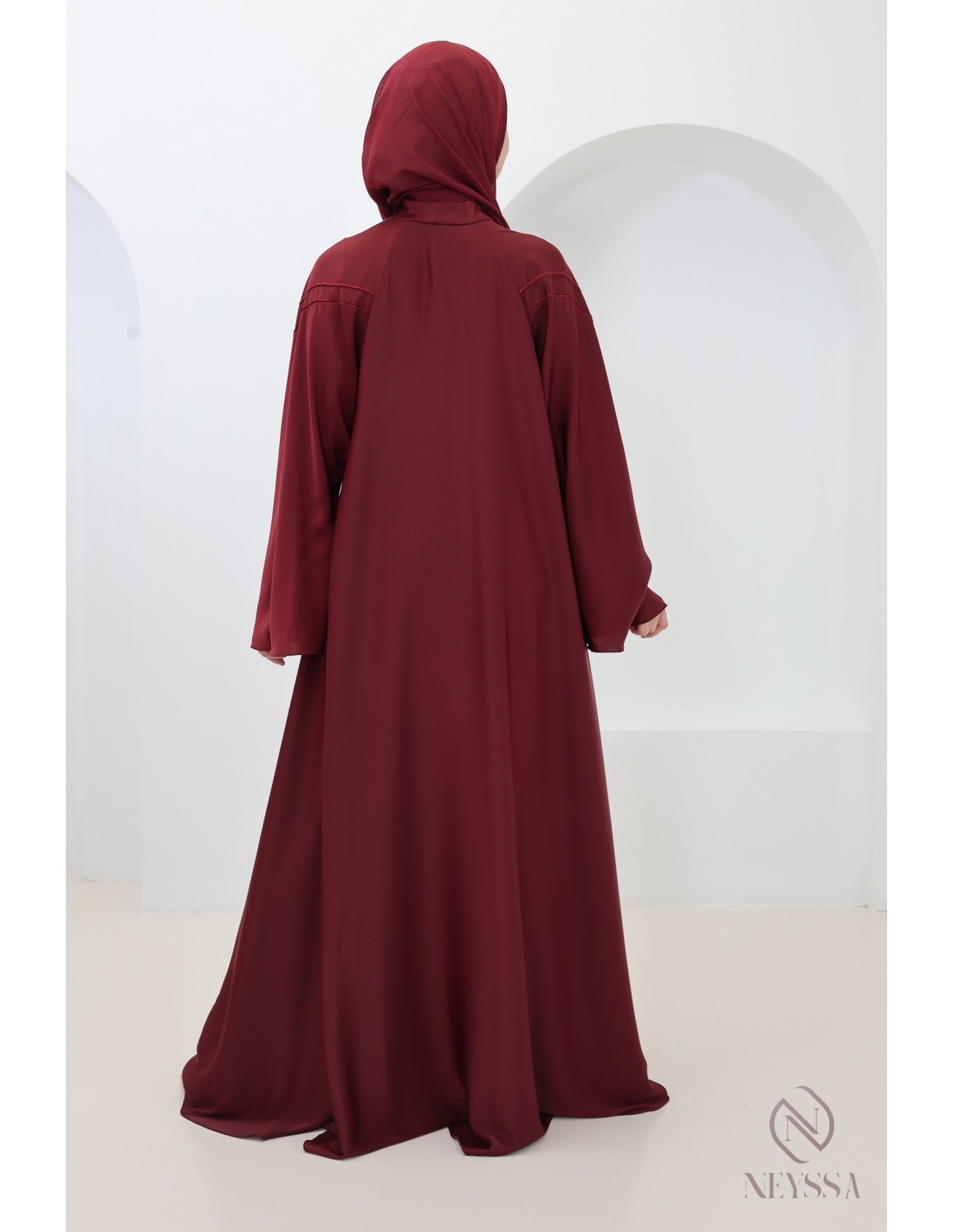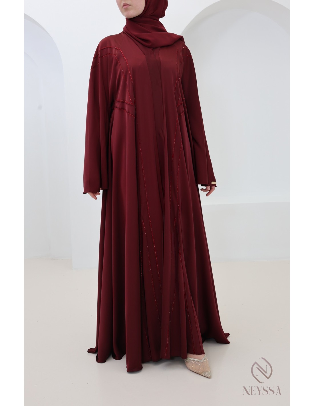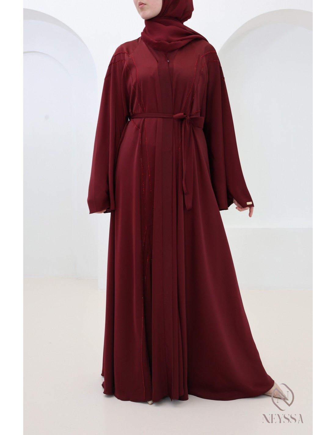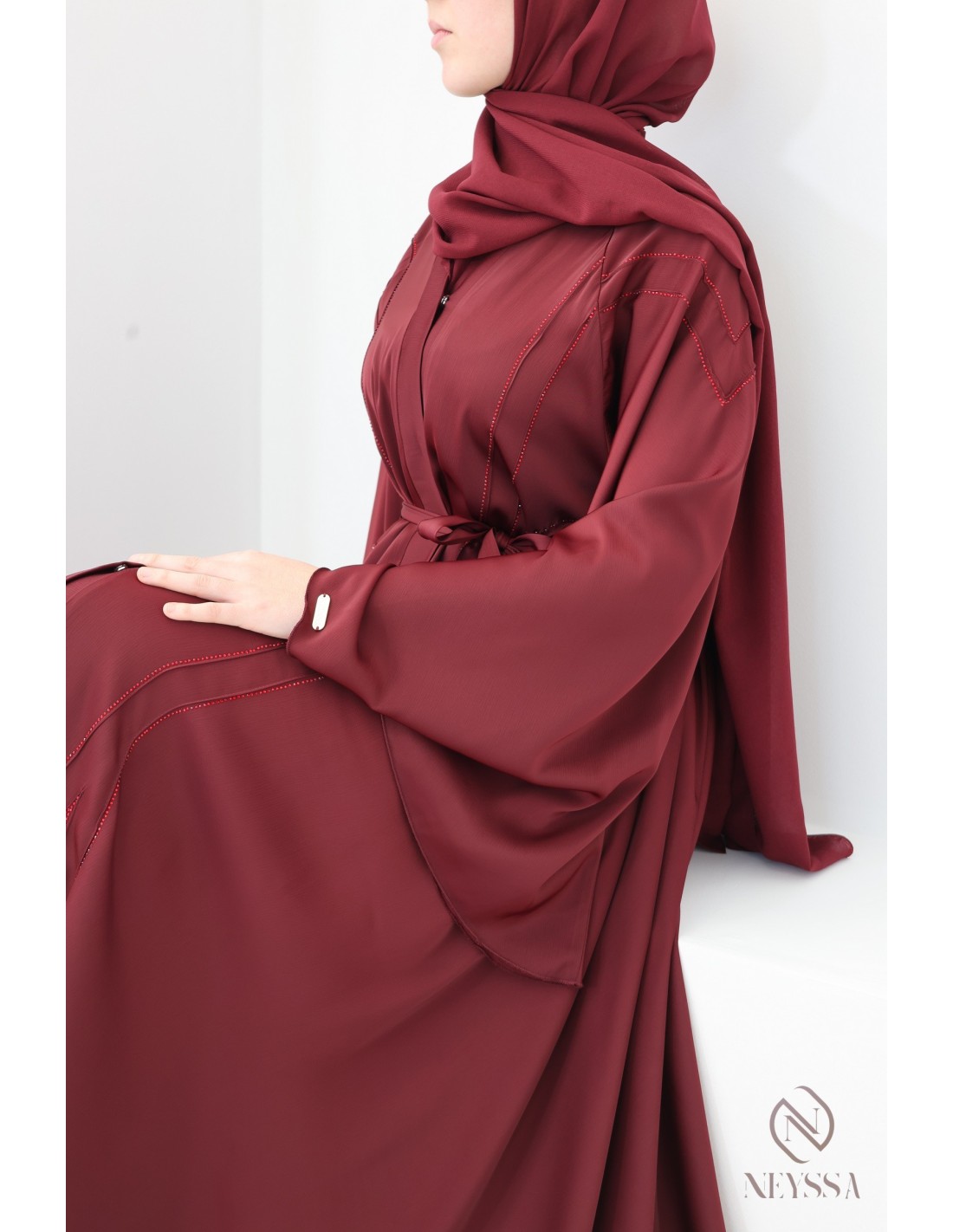 - Perfect personalized finishes: A silver Neyssa plaque is sewn onto the sleeve of the abaya.