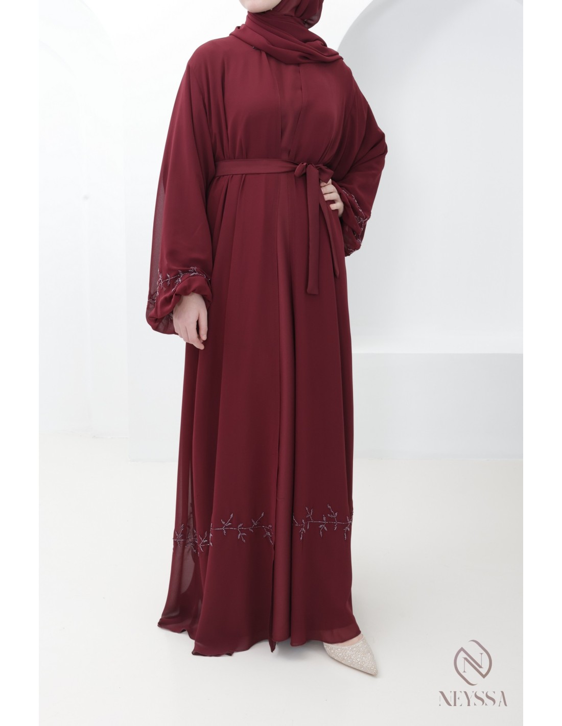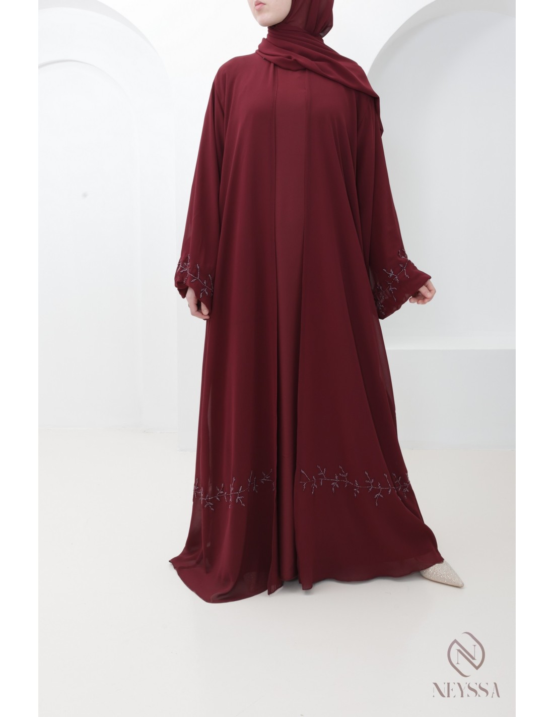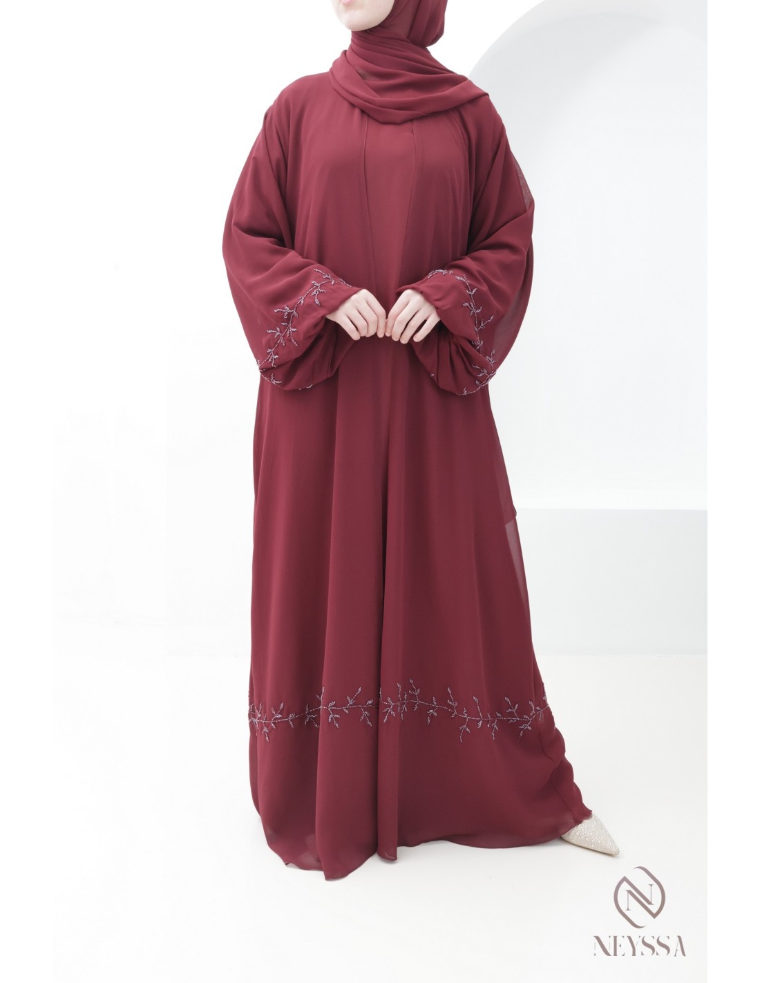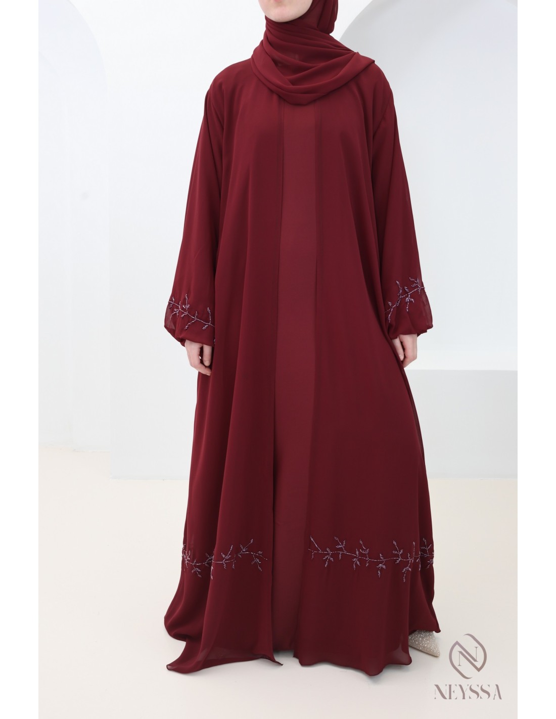 Luxury Dubai Kimono Abaya Bordeaux 4 pieces hand-embroidered: outfit for Eid