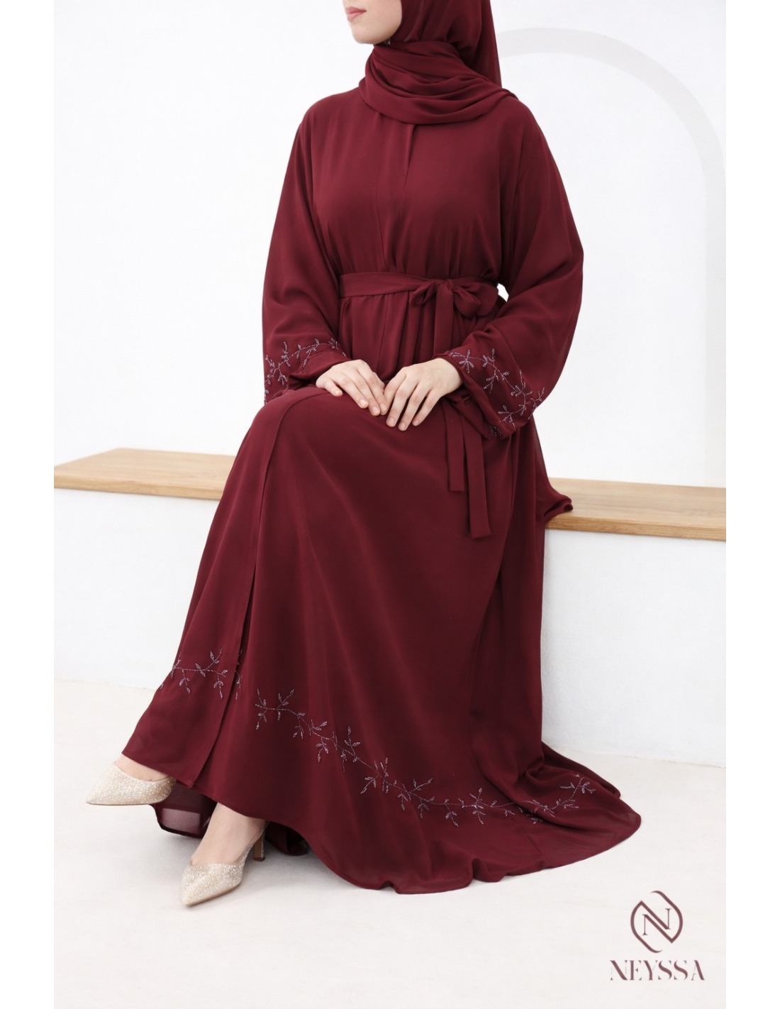 - Chiffon hijab: To complete the look, a matching chiffon hijab is included with this abaya for perfect coordination (may vary depending on availability).