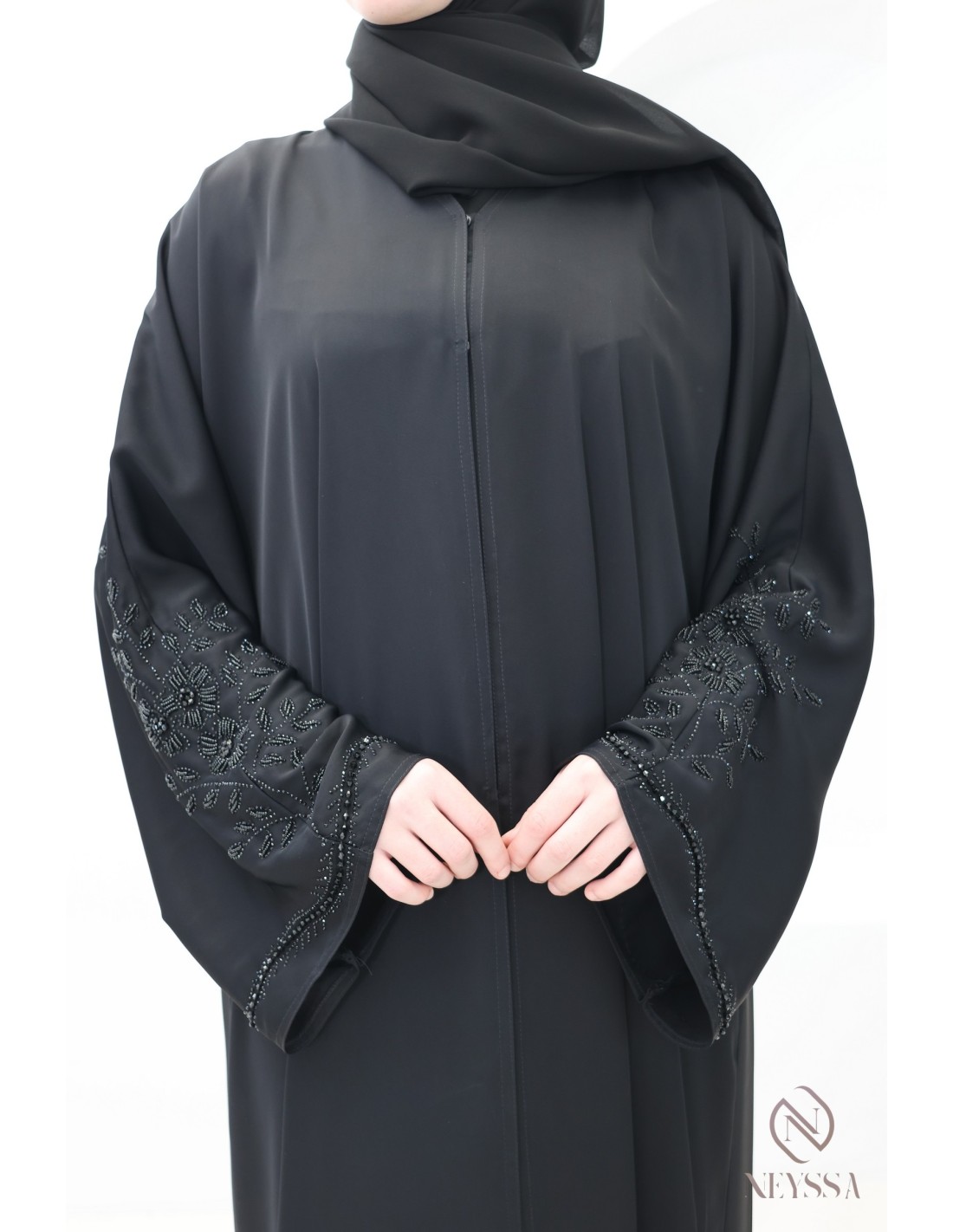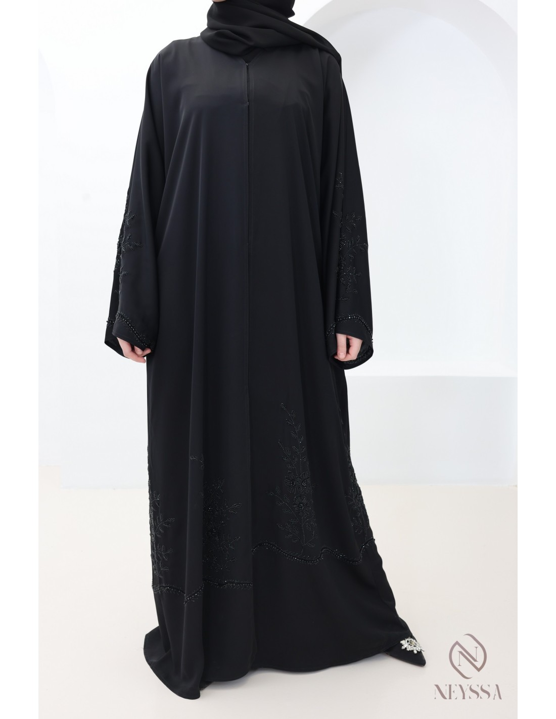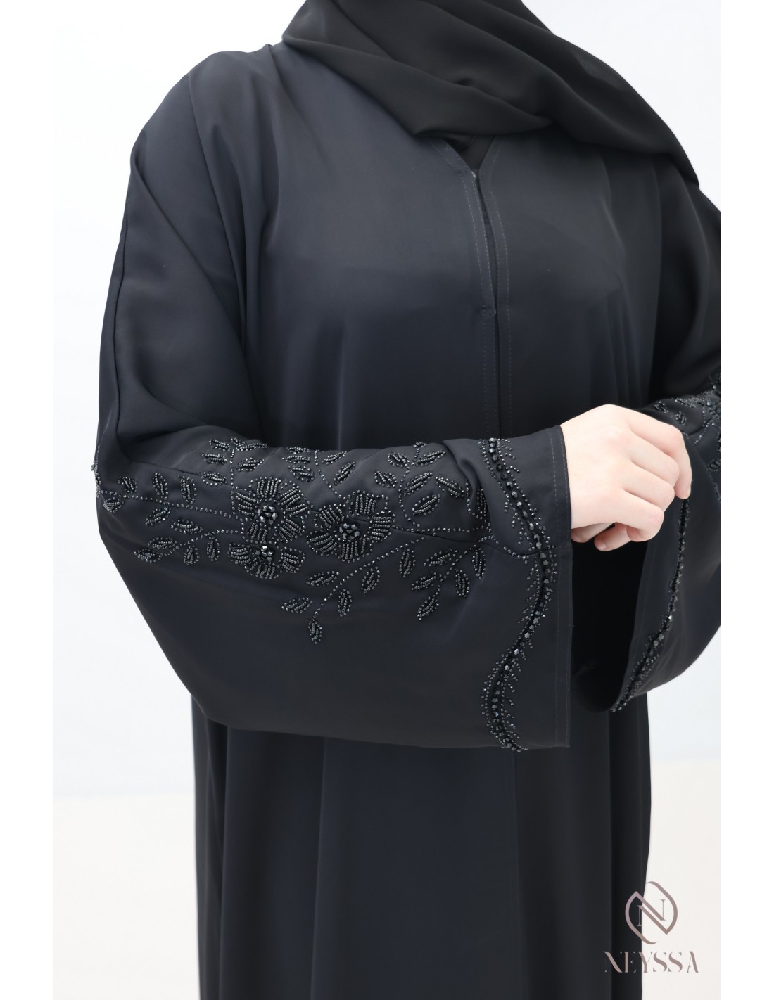 • Perfect personalized finishes: A golden Neyssa plaque is hand-sewn onto the sleeve of the abaya.
