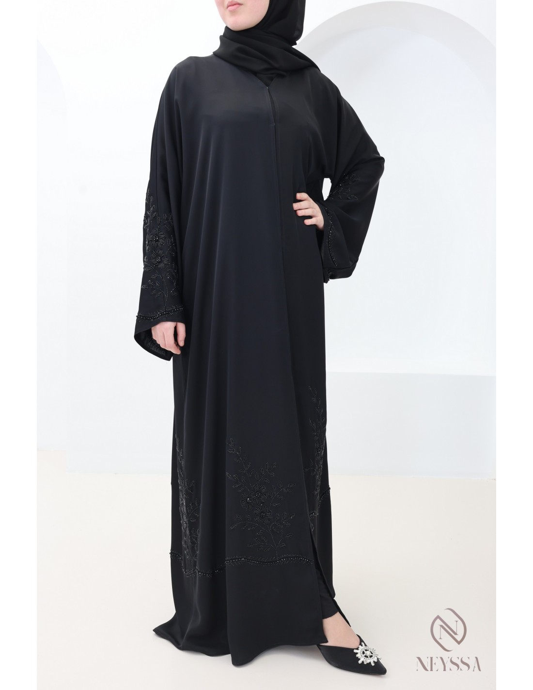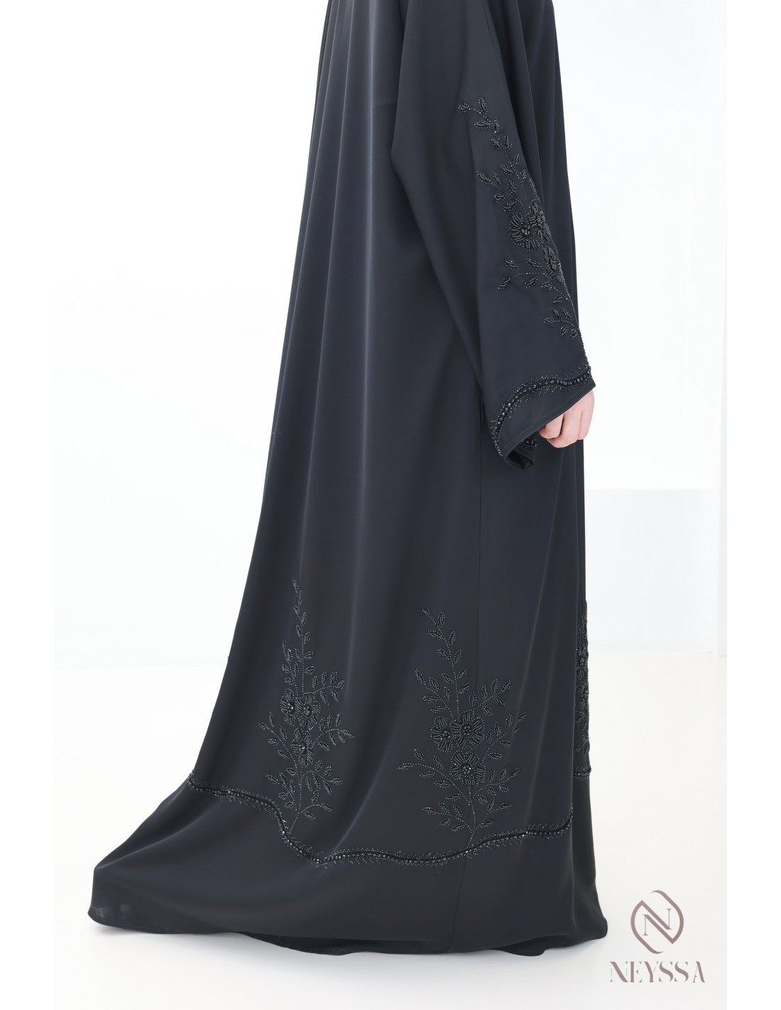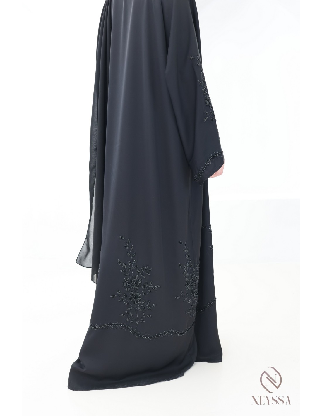 • Perfect personalized finishes: A golden Neyssa plaque is hand-sewn onto the sleeve of the abaya.