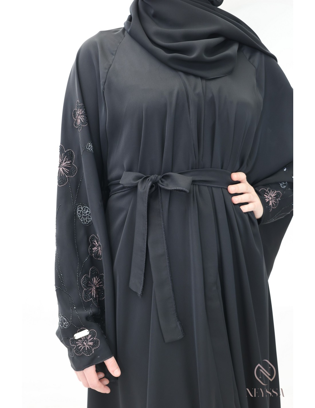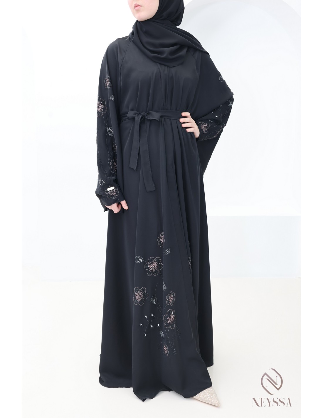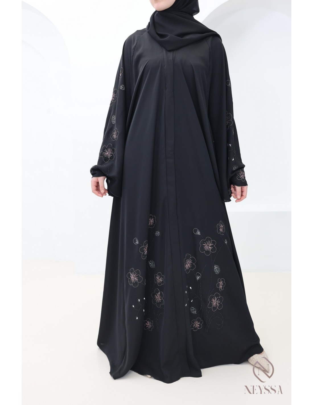 Dubai abaya in black with floral embroidery and rhinestones: ideal for Eid celebrations