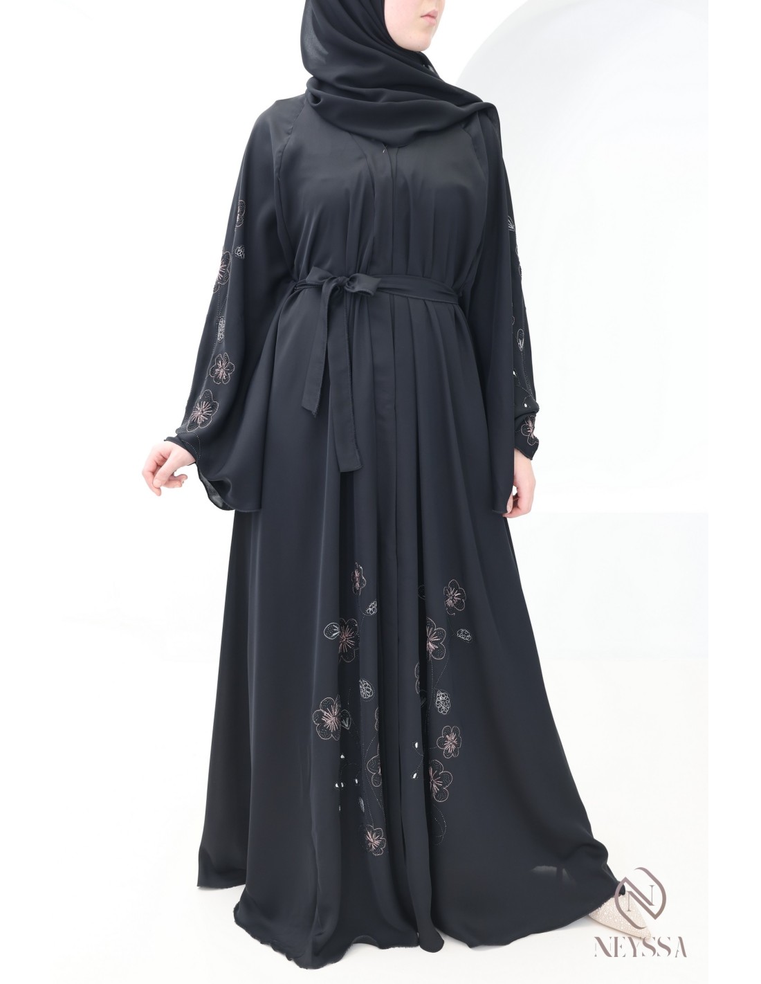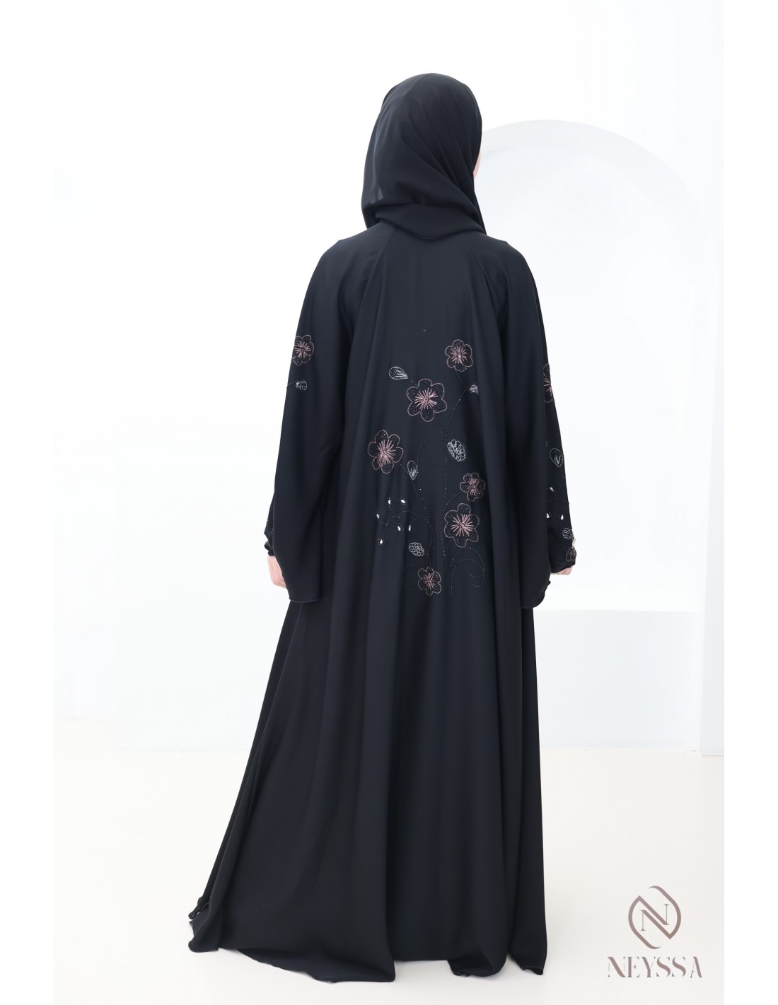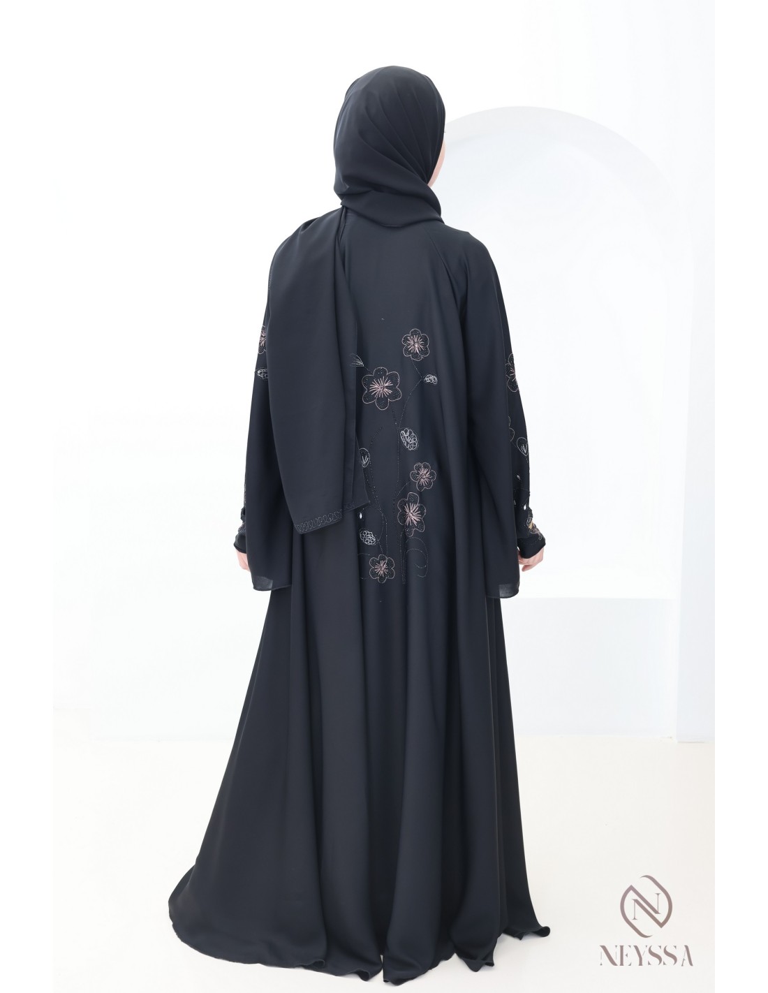 Dubai abaya in black with floral embroidery and rhinestones: ideal for Eid celebrations