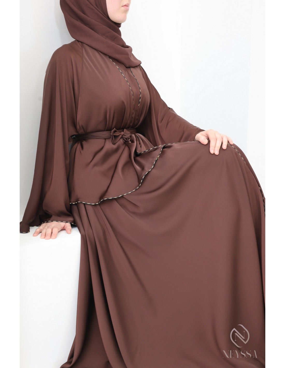Dubai chic kimono abaya Chocolate with ruffles and rhinestones, flared cut