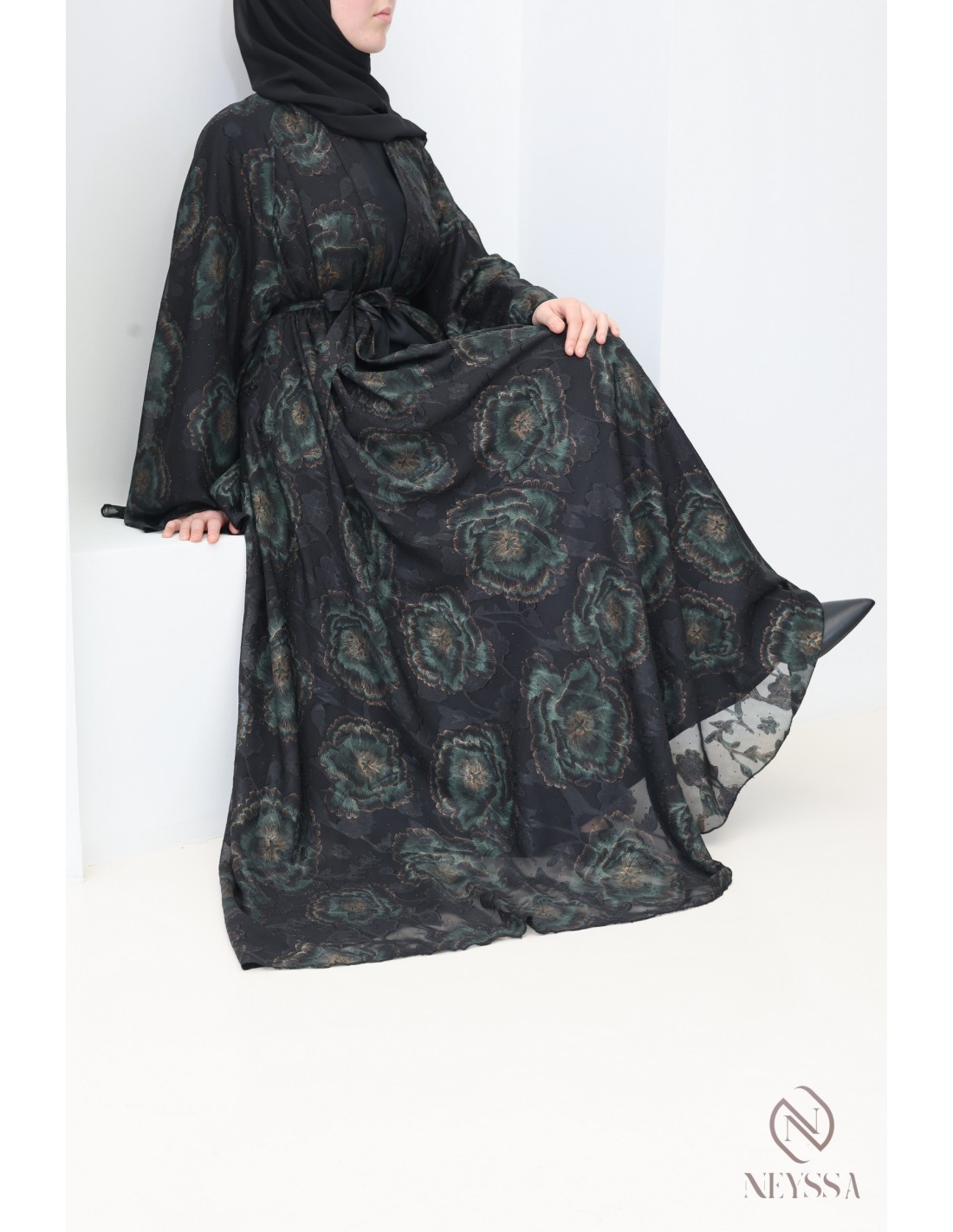 Black Floral Embroidered Dubai Kimono Abaya with Flared Cut for Hijabi Women