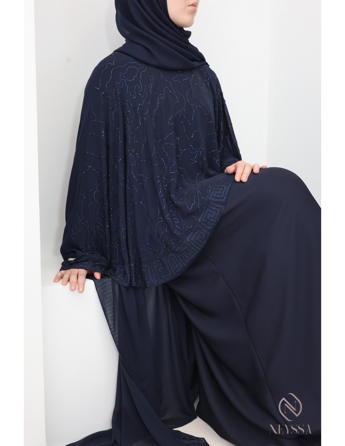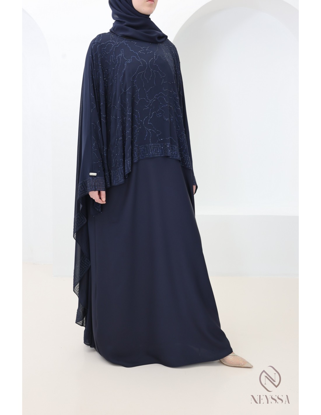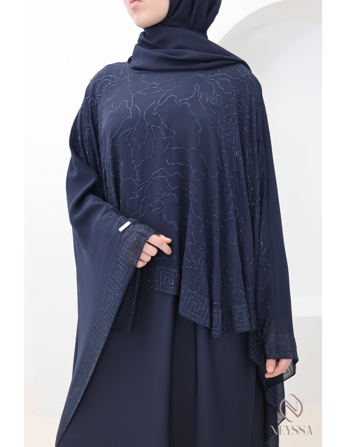 Luxury Dubai Abaya with Blue Chiffon Cape and Rhinestones, Women's Veiled Eid Outfit