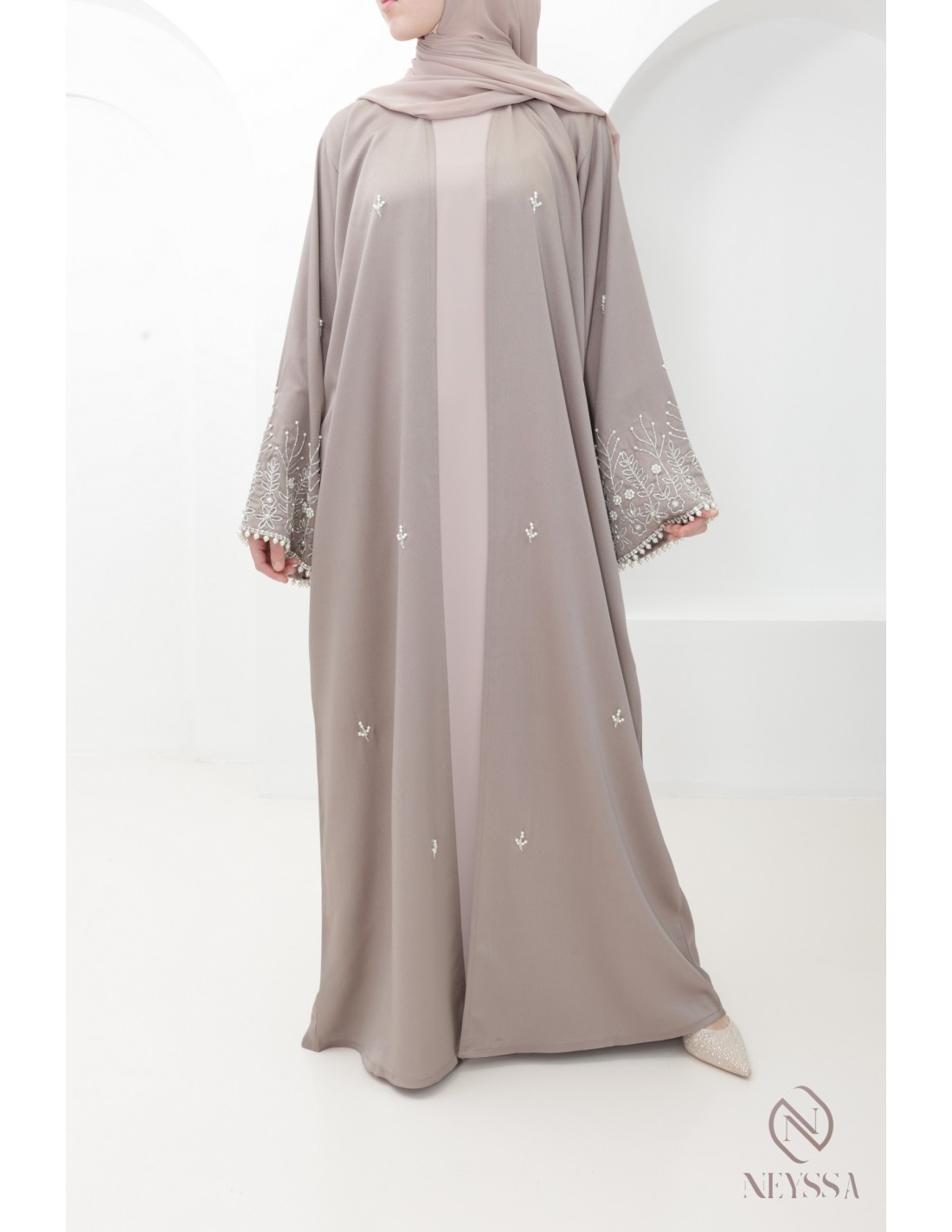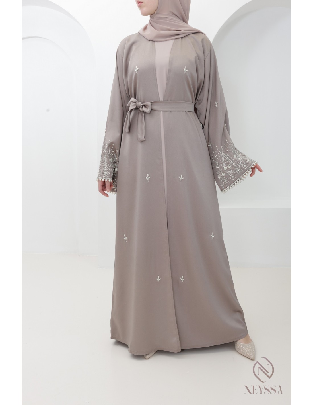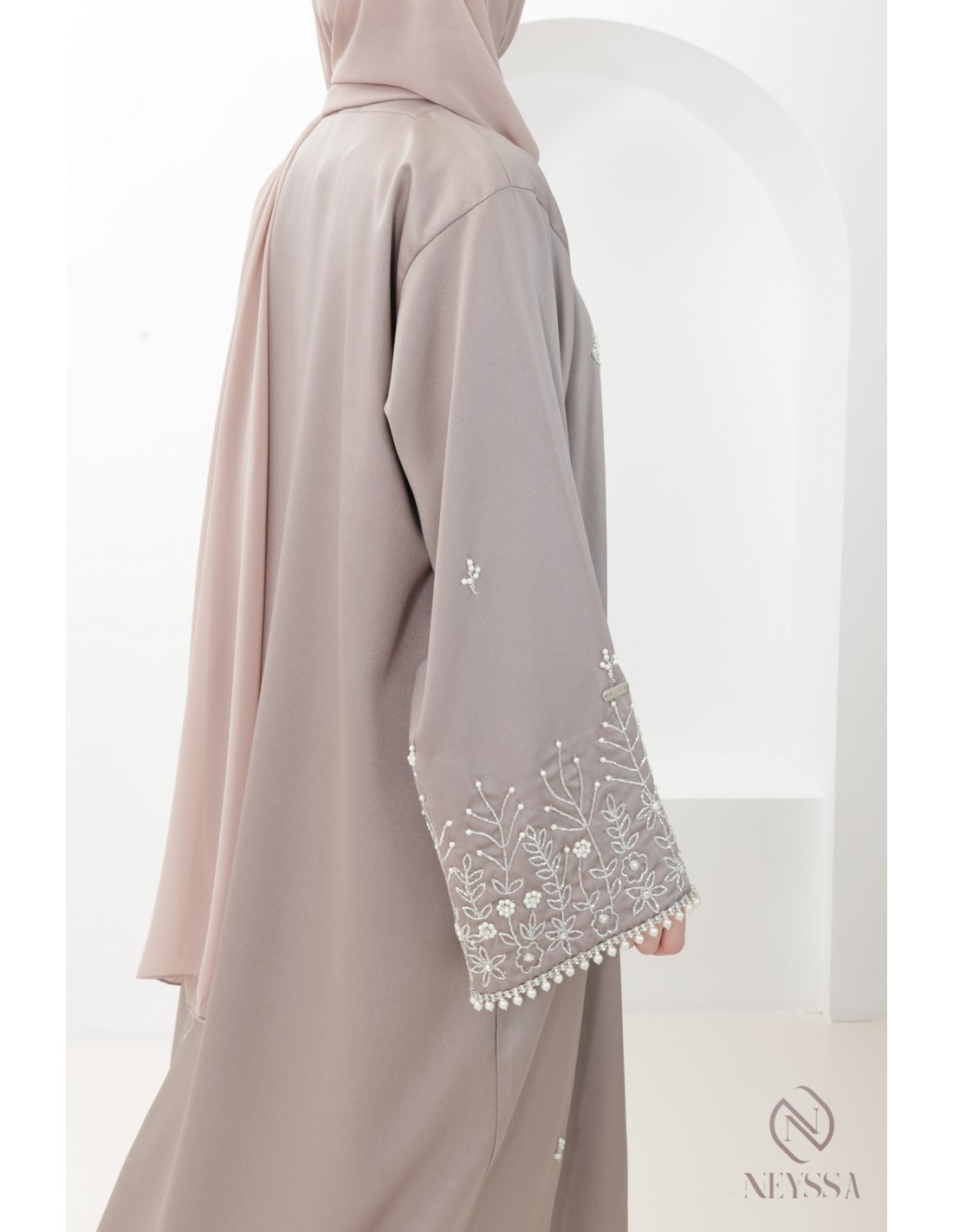 With this magnificent abaya outfit, you're sure to shine on the big day! Confection Neyssa represents a perfect marriage of elegance and sophistication. Carefully crafted in our workshops in Dubai, this exceptional quality abaya exudes incomparable charm.