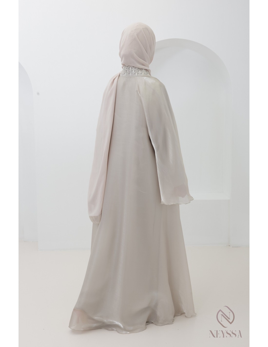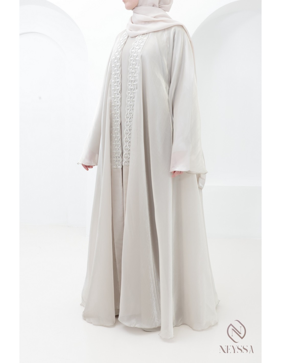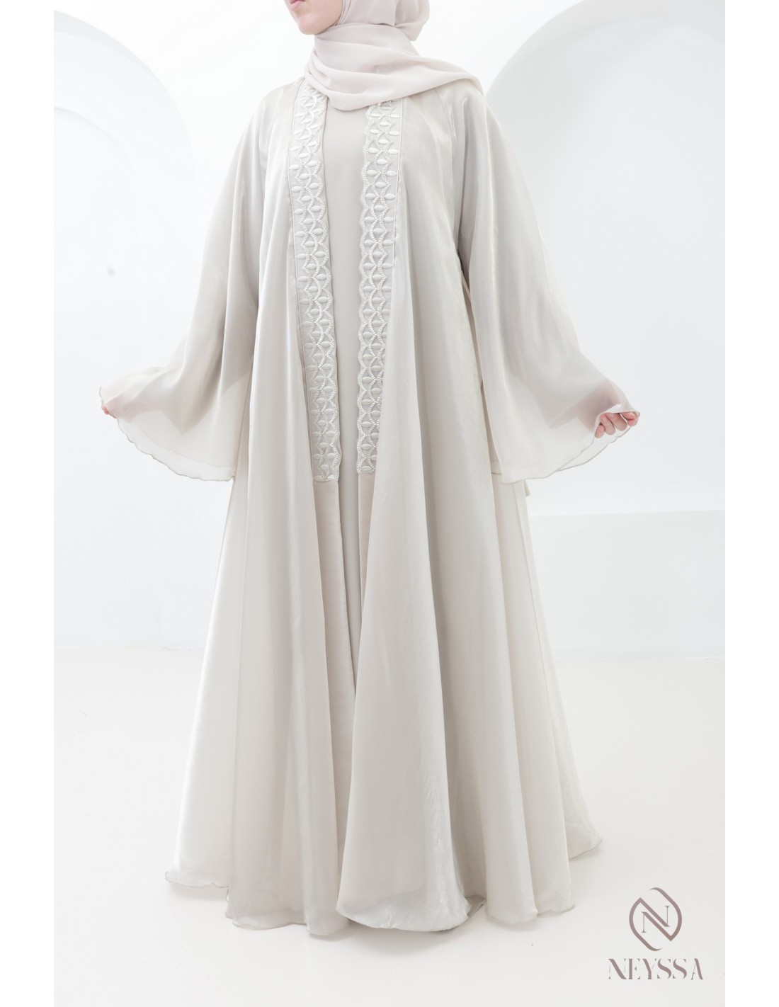 With this magnificent abaya outfit, you're sure to shine on the big day! Confection Neyssa represents a perfect marriage of elegance and sophistication. Carefully crafted in our workshops in Dubai, this exceptional quality abaya exudes incomparable charm.