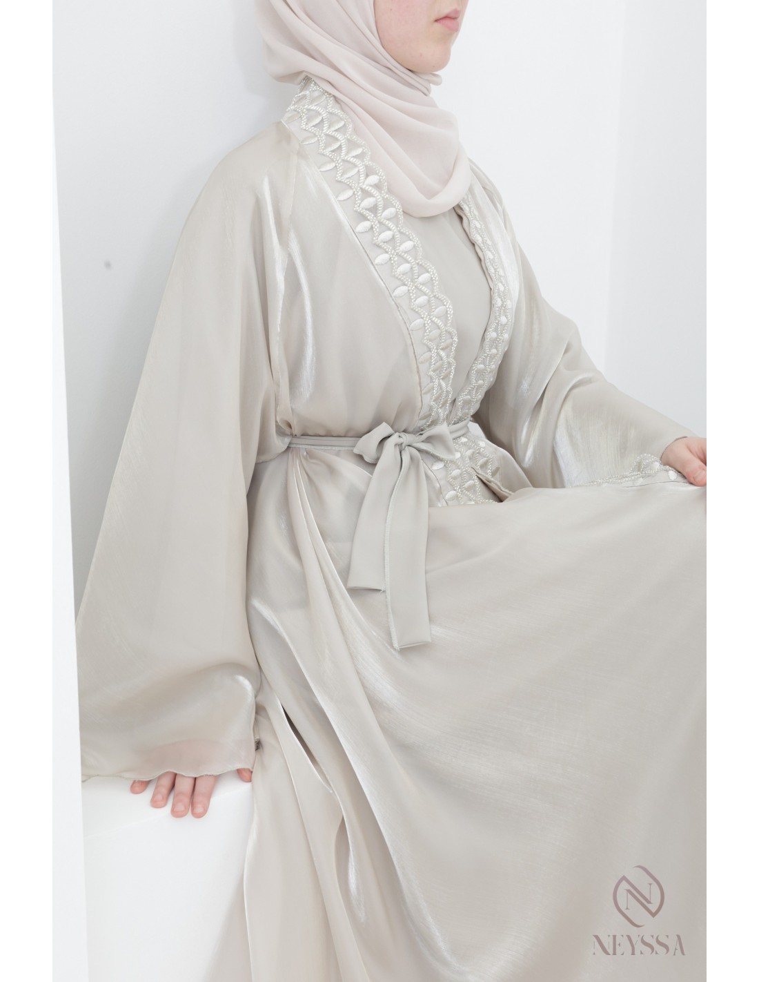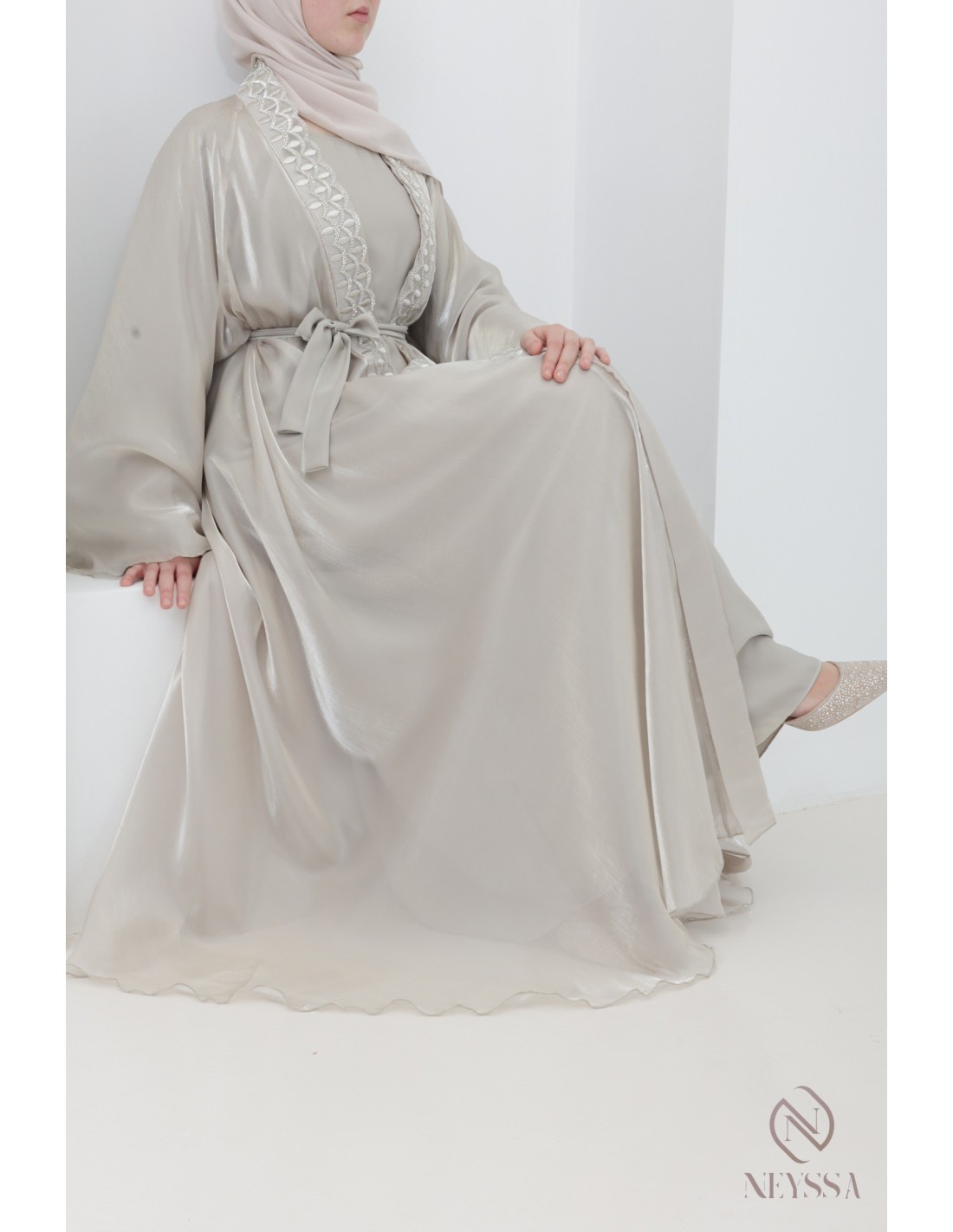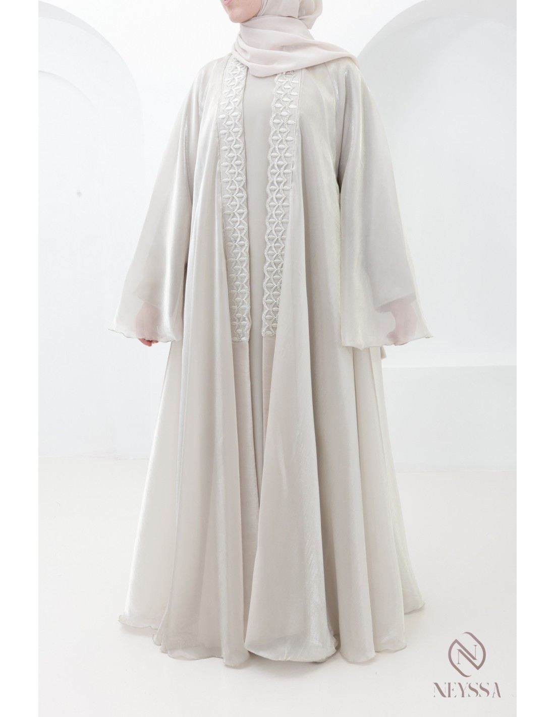 With this magnificent abaya outfit, you're sure to shine on the big day! Confection Neyssa represents a perfect marriage of elegance and sophistication. Carefully crafted in our workshops in Dubai, this exceptional quality abaya exudes incomparable charm.