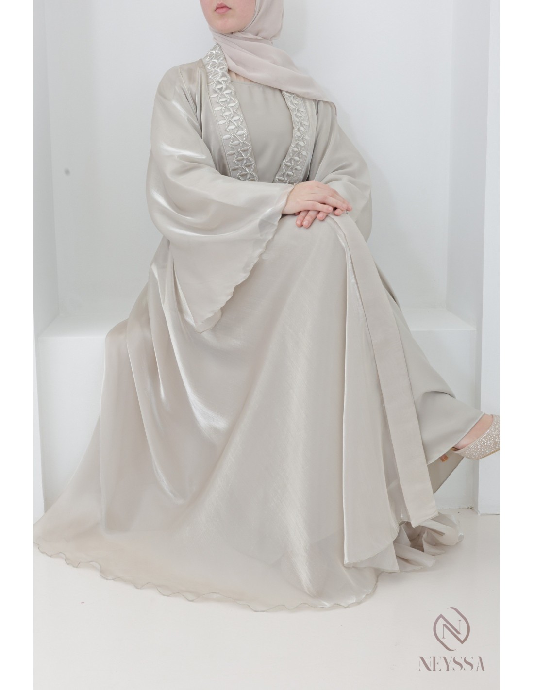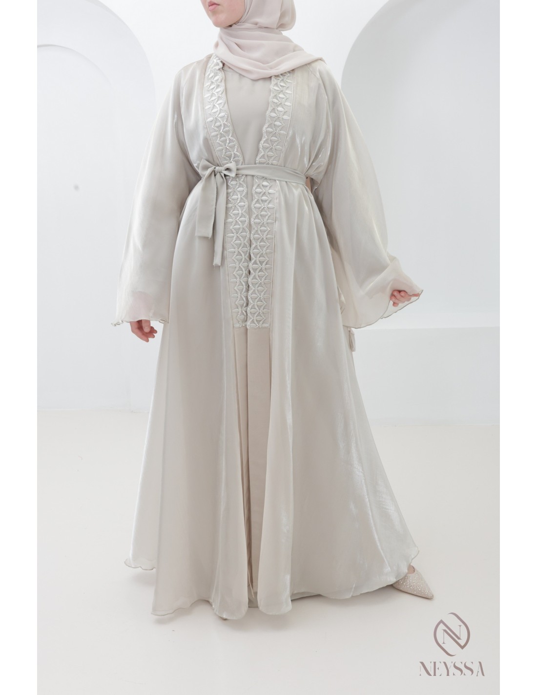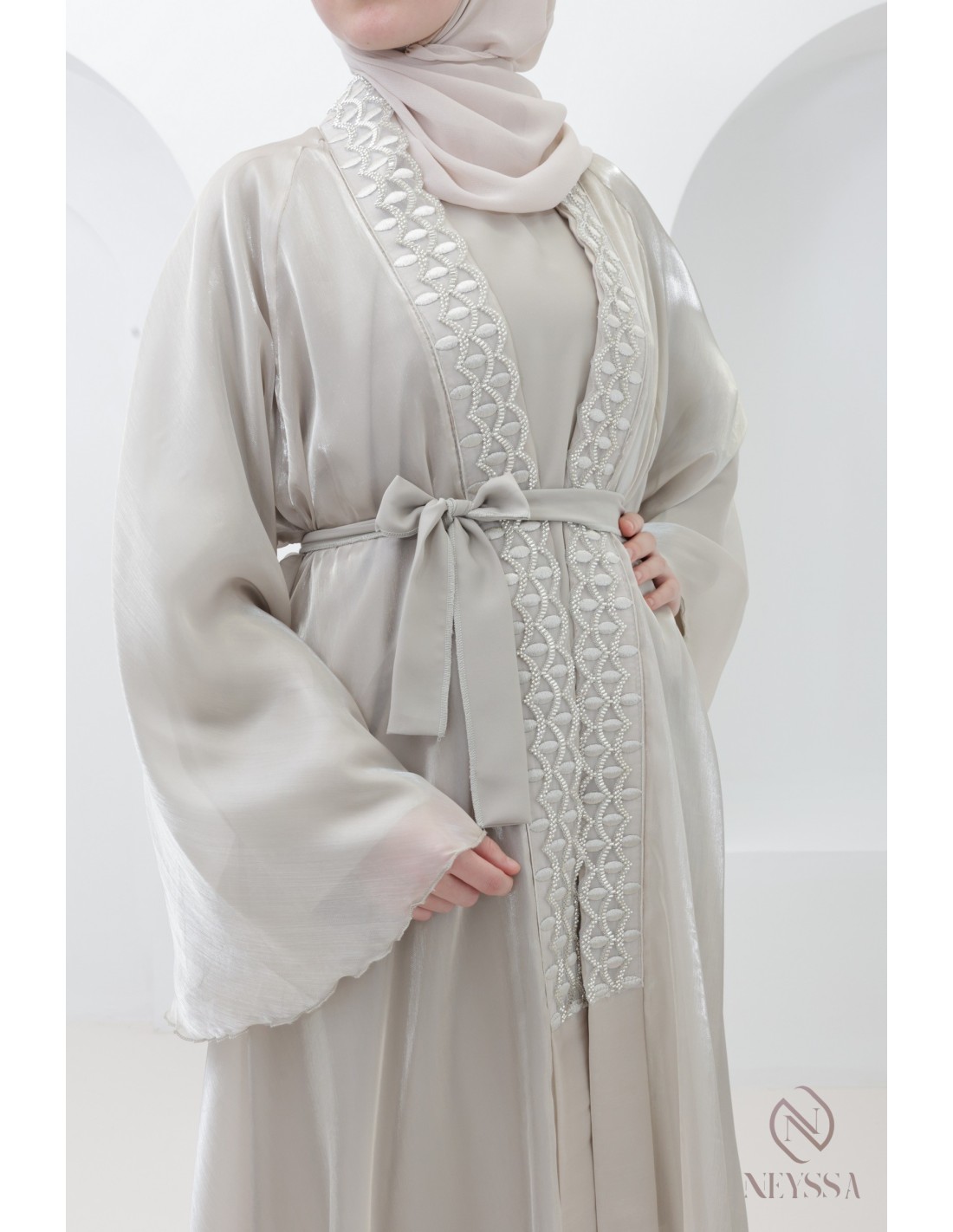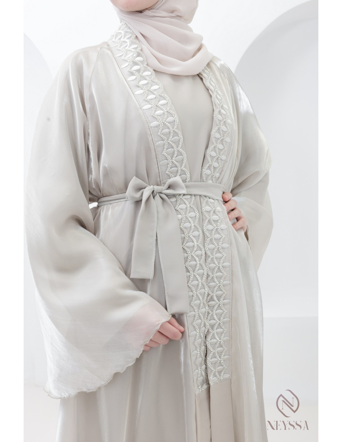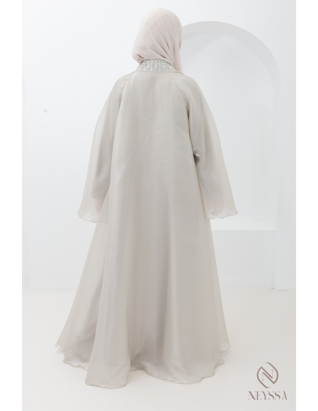Dubai Greige Organza Kimono Abaya with Embroidered Beading : Neyssa Confection
