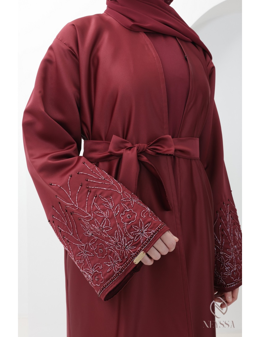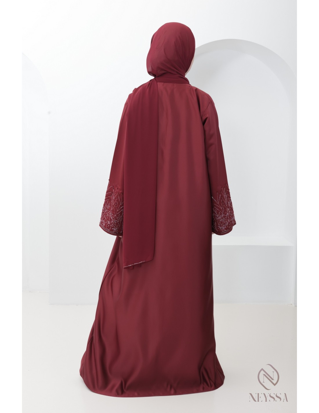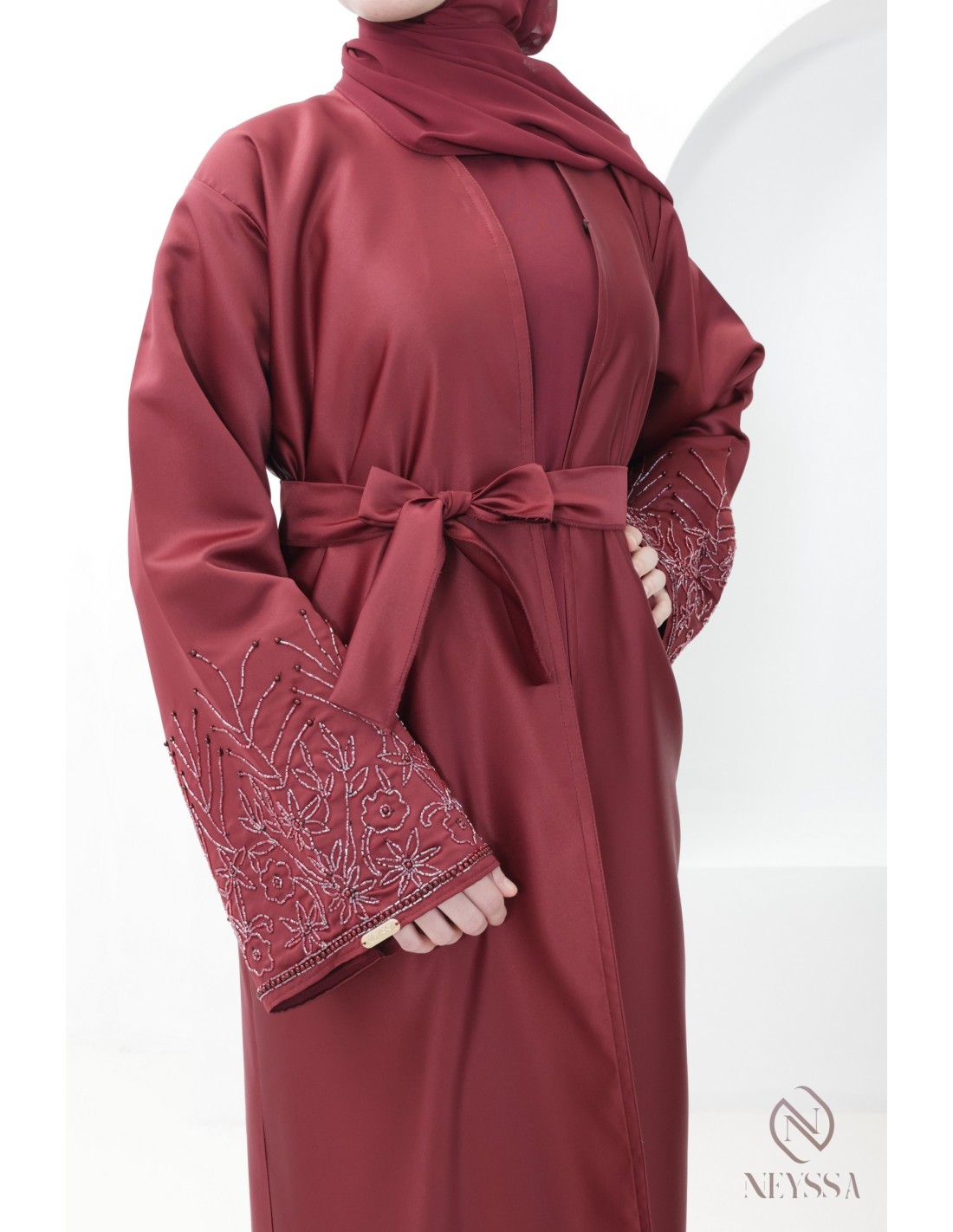 With this magnificent abaya outfit, you're sure to shine on the big day! Confection Neyssa represents a perfect marriage of elegance and sophistication. Carefully crafted in our workshops in Dubai, this exceptional quality abaya exudes incomparable charm.