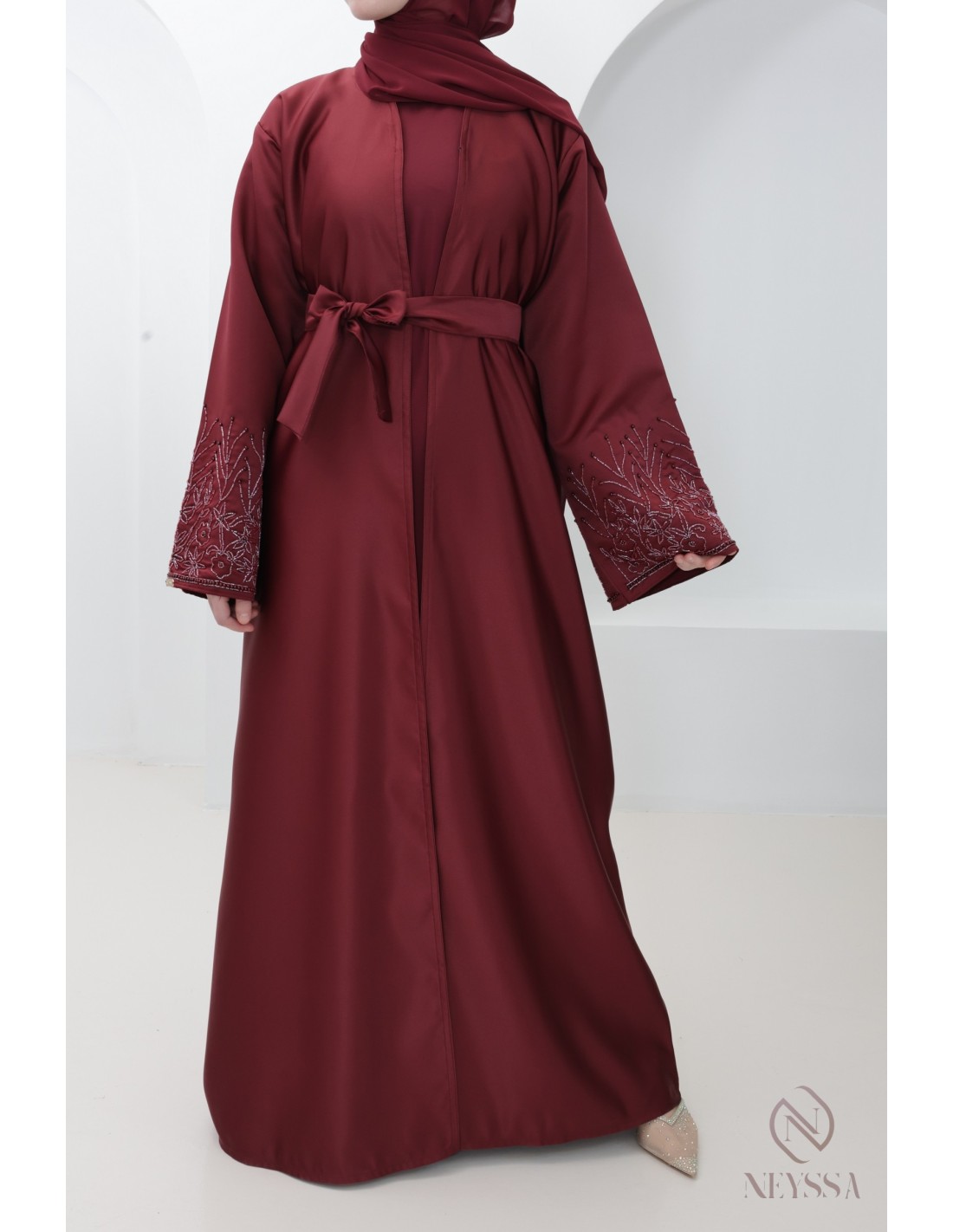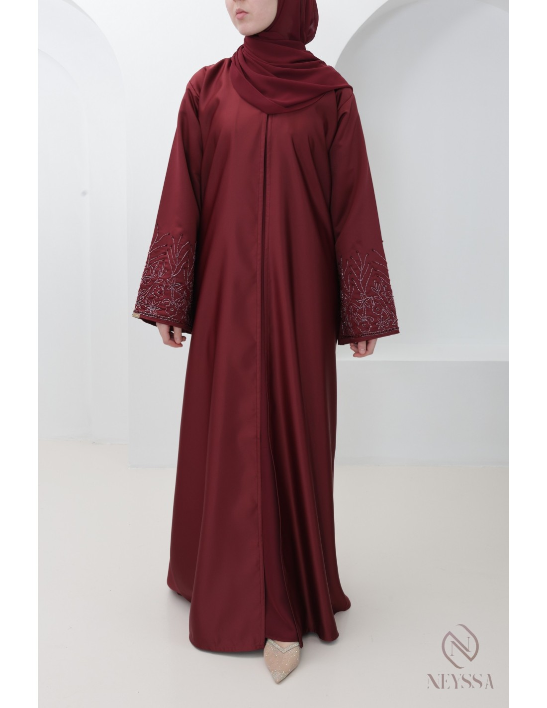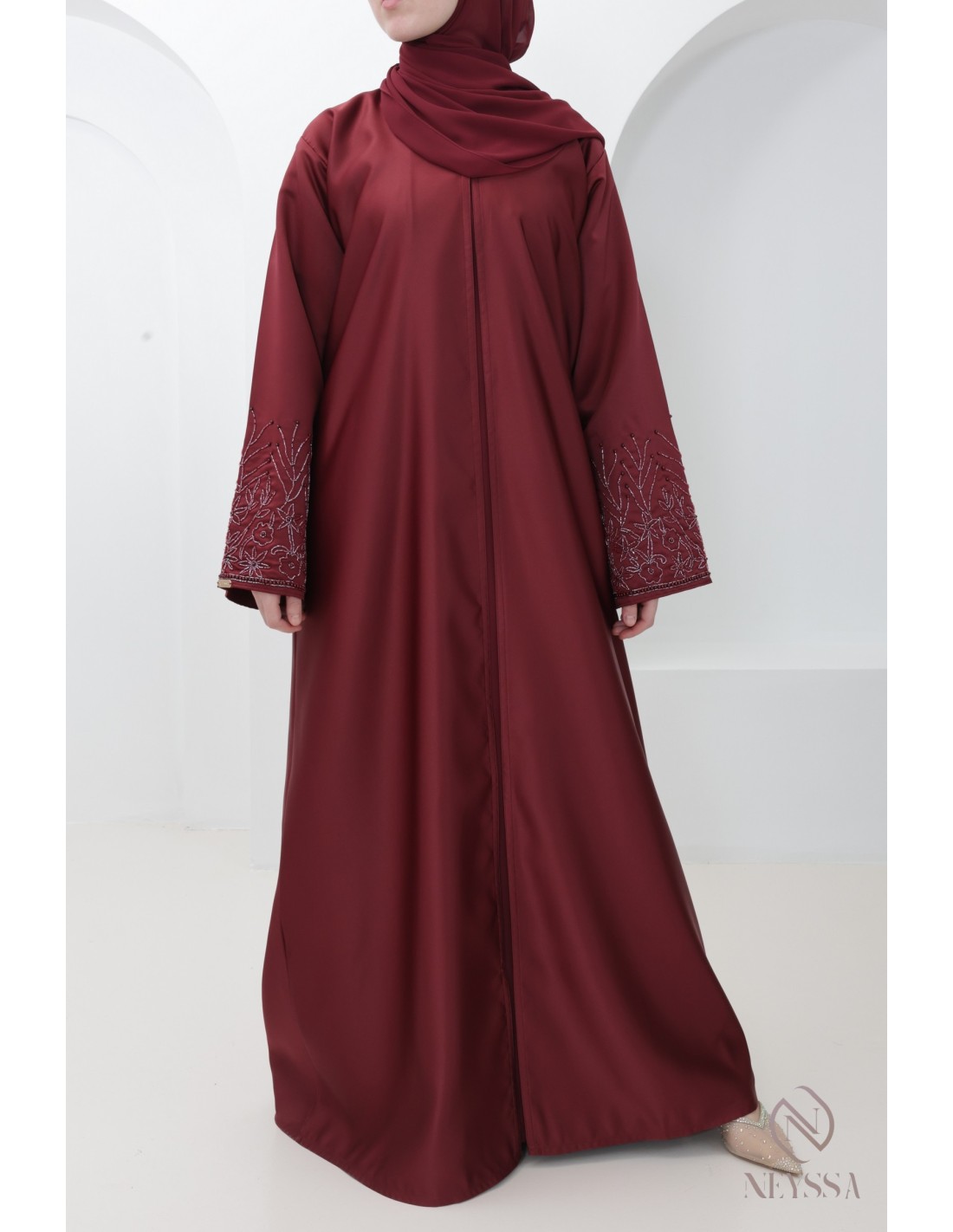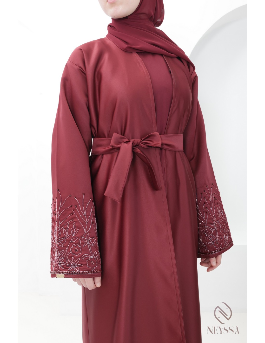 With this magnificent abaya outfit, you're sure to shine on the big day! Confection Neyssa represents a perfect marriage of elegance and sophistication. Carefully crafted in our workshops in Dubai, this exceptional quality abaya exudes incomparable charm.