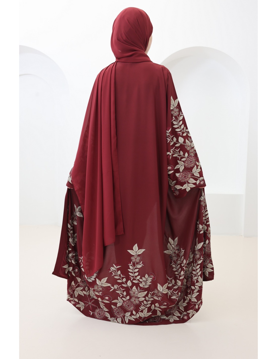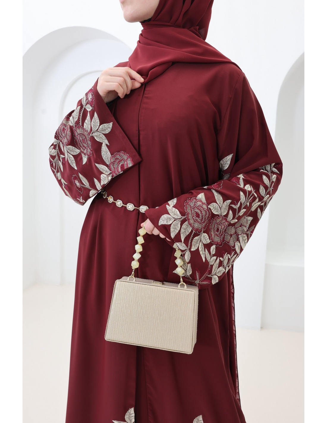 Dubai Kimono Abaya with floral embroidery and burgundy rhinestones, a chic Eid outfit