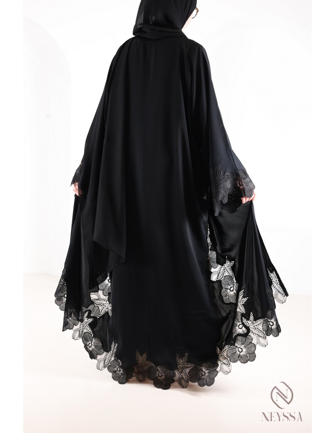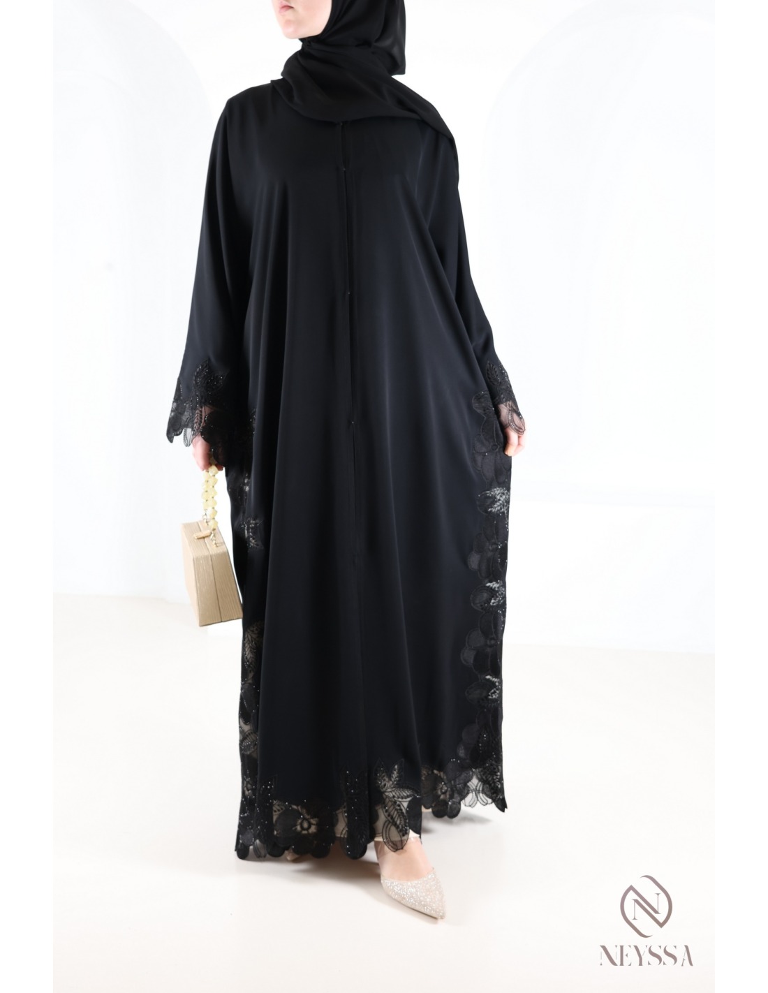 • Perfect personalized finish: A golden Neyssa plaque is hand-sewn onto the sleeve of the abaya.