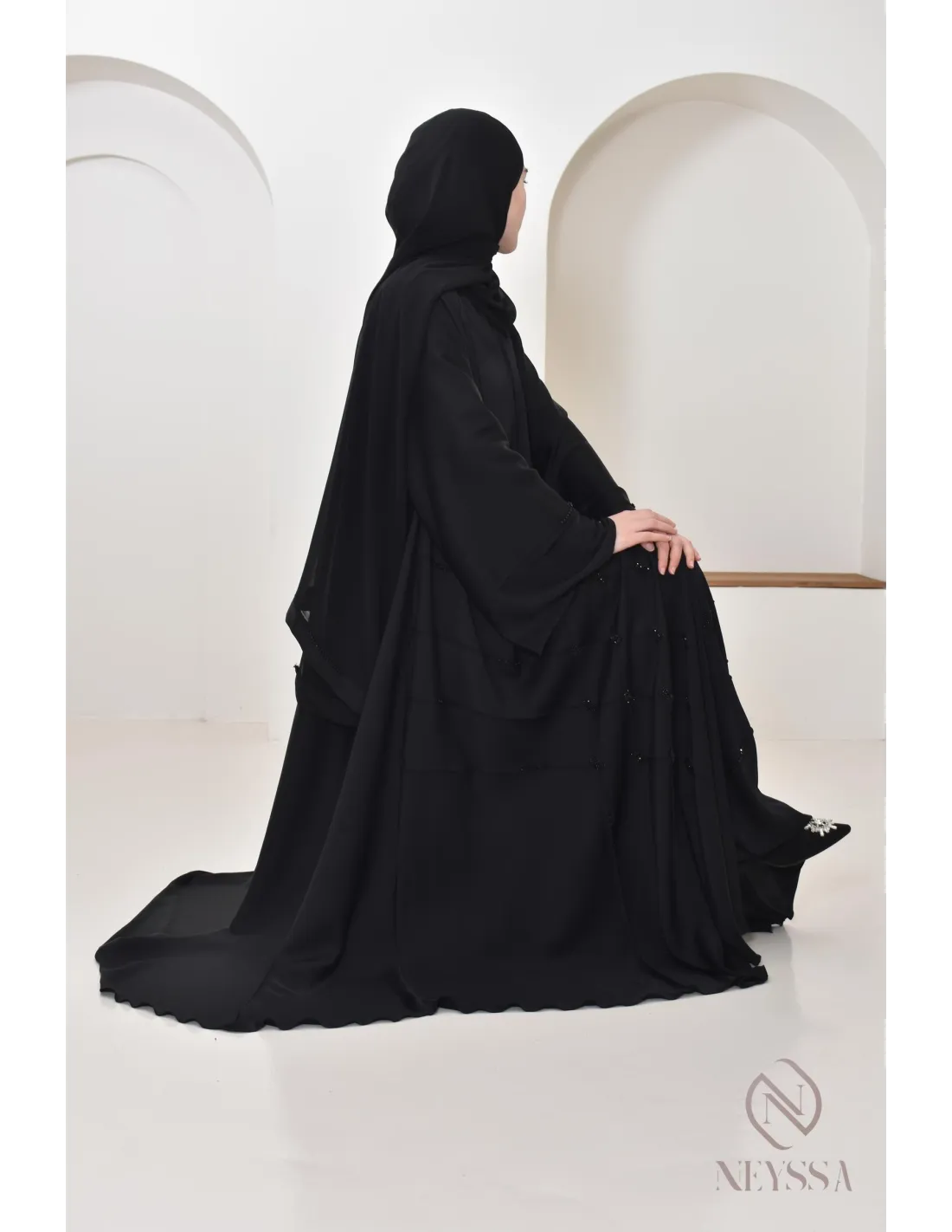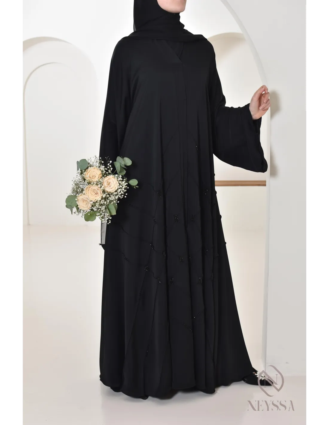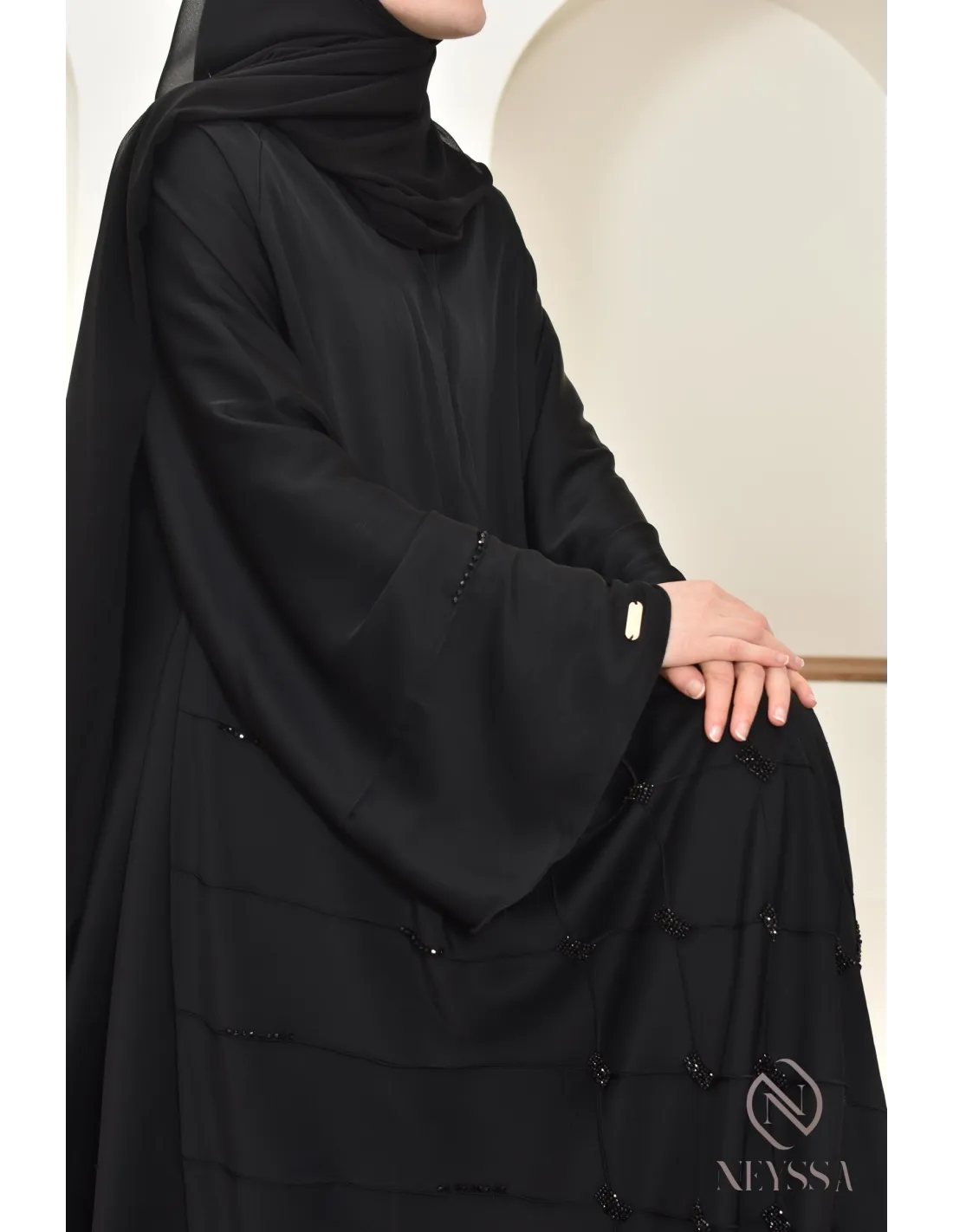 - Perfect personalized finishes: A silver Neyssa plaque is sewn onto the sleeve of the abaya.